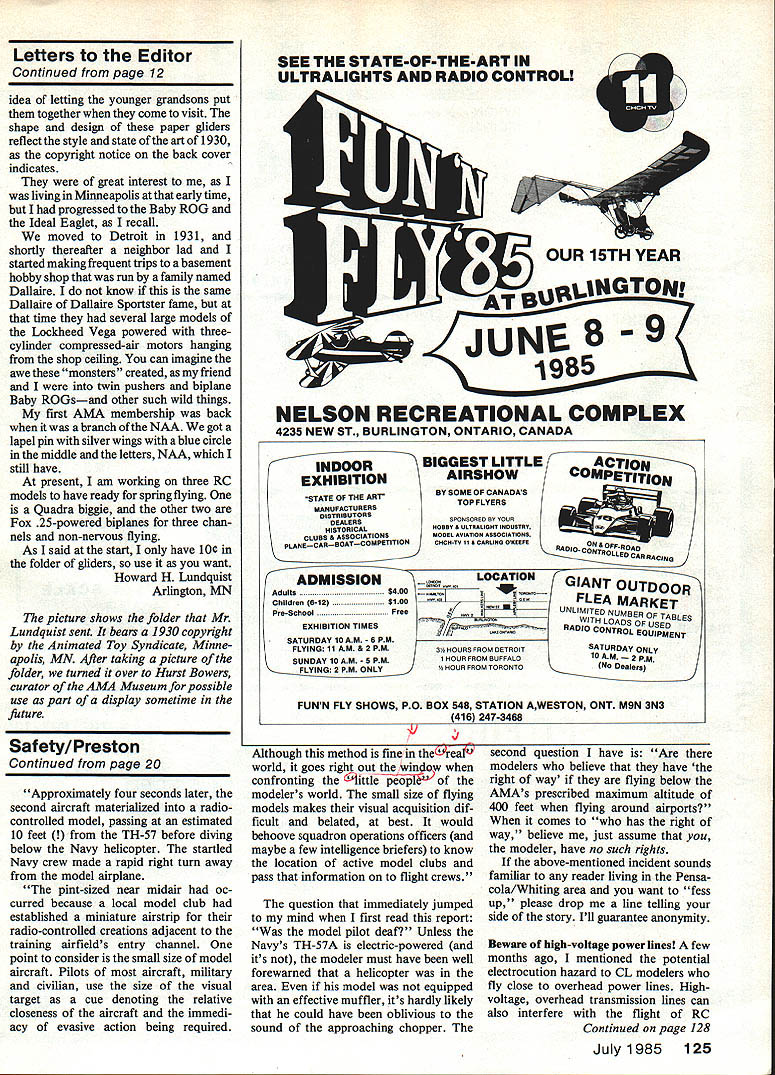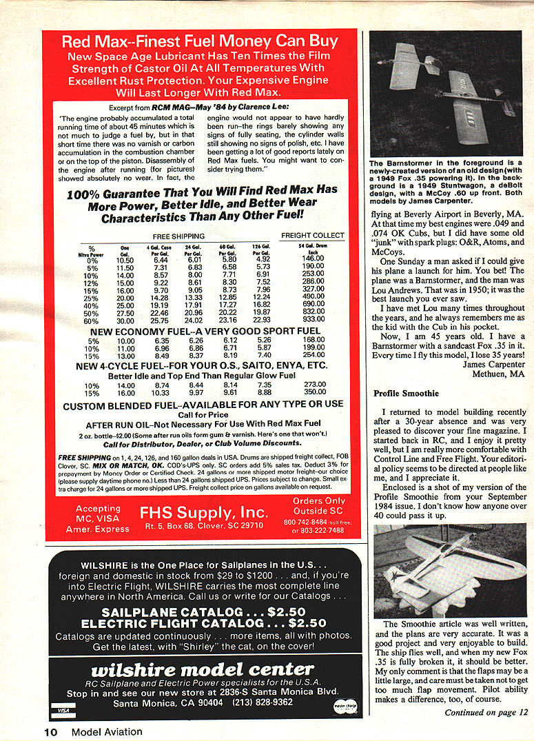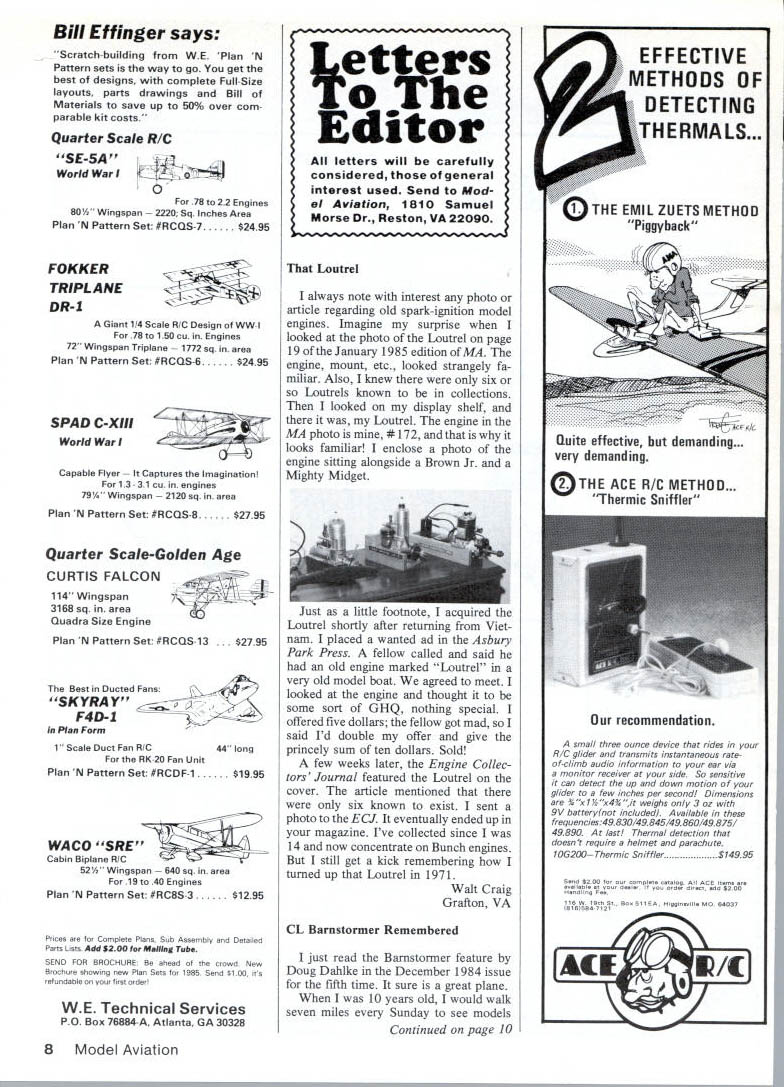 Bill Etfinger says Scratch building WE Plan N Pattern sets way go get best designs complete Full-Size layouts parts drawings Bill Materials save up 50% over com parable kit costs Quarter Scale RIC SE-5A World Wan 78 22 Engines 80A Wingspan Sq Inches Area Plan N Pattern Set #RCQS-7 $2495 FOKKER TRIPLANE DR-i Giant 114 Scale RIC Design WW-I 78 150 cu Engines 72 Wingspan Triplane sq area Plan N Pattern Set #RCQS-6 2495 SPAD C-XIll World Wan Capable Flyer ures Imagination 13-31 cu engines 79 Wingspan sq area Plan N Pattern Set #RCQS8 $2795 Quarter Scale-Golden Age CURTIS FALCON 114 Wingspan 3168 sq area Quadra Size Engine Plan N Pattern Set #RCQS-13 . $2795 Best Ducted Fans SKYRAY F4D-i Plan Form 1 Scale Duct Fan R/C44 long RK-20 Fan Unit Plan N Pattern Set #RCDF-1 $1995 WACO SRE Cabin Biplane RIC 52W Wingspan sq area 19 40 Engines Plan N Pattern Set #RC8S-3 $1295 Prices Complete Plans Sub Assembly Detailed Parts Lists Add 8200 Mailing Tube SEND FOR BROCHURE ahead crowd New Brochure showing new Plan Sets 1 985 Send $100 its refundable first orderl WE Technical Services PO Box 76884-A Atlanta GA 30328 Loutrel always note interest photo article regarding old spark-ignition model engines Imagine surprise looked photo Loutrel page 19 January 1985 edition MA engine mount etc looked strangely fa miliar Also knew six Loutrels known collections looked display shelf Loutrel engine MA photo #172 looks familiar enclose photo engine sitting alongside Brown Jr Mighty Midget Just little footnote acquired Loutrel shortly after returning Viet nam placed wanted ad Asbury Park Press fellow called said old engine marked Loutrel very old model boat agreed meet looked engine thought some sort GHQ nothing special offered five dollars fellow got mad sol said Id double offer give princely sum ten dollars Sold few weeks later Engine Collec tors Journal featured Loutrel cover article mentioned six known exist sent photo ECJ eventually ended up magazine Ive collected since 14 now concentrate Bunch engines still get kick remembering turned up Loutrel 1971 Walt Craig Grafton VA CL Barnstormer Remembered just read Barnstormer feature Doug Dahike December 1984 issue fifth time sure great plane 10 years old would walk seven miles Sunday see models Continued page 10 EFFECTIVE METHODS OF DETECTING THE RMA IS. rPiooYback. QTHE EMIL ZUETS METHOD Quite effective demanding. very demanding 0TH E ACE R/C METHOD. Thermic Sniffler recommendation small three ounce device rides R/C glider transmits instantaneous rateof-climb audio information ear via monitor receiver side So sensitive can detect up down motion glider few inches per second Dimensions 5rc7%x4it weighs 3 oz 9V batterylnot included Available frequencies49830/49845/49860/49875/ 49890 lastl Thermal detection doesnt require helmet parachute 10G200Thermic Sniffler.......... $74995 Send 8200 uOwpIee catalea AI Ace leowe oucileble en deelen YOu Order direuf add $200 Kandlius Fee its w tOch Of. Soo OtibA Hiaslowille MO e4537 05554 2 AU el Aviation U Letters Editor letters will carefully considered general interest used Send Mod el Aviation 1810 Samuel Morse Dr Reston VA 22090 flying Beverly Airport Beverly MA time best engines 049 074 OK Cubs did have some old junk spark plugs O&R Atoms McCoys Sunday man asked could give plane launch him bet plane Barnstormer man Lou Andrews 1950 best launch ever saw have met Lou times throughout years always remembers kid Cub pocket Now am 45 years old have Barnstormer sandcast Fox 35 time fly model lose 35 years James Carpenter Methuen MA Profile Smoothie returned model building recently after 30-year absence very pleased discover fine magazine started back RC enjoy pretty well am really comfortable Control Line Free Flight editori al policy seems directed people like appreciate Enclosed shot version Profile Smoothie September 1984 issue dont know anyone over 40 could pass up Smoothie article well written plans very accurate good project very enjoyable build ship flies well new Fox 35 fully broken it should better comment flaps may little large care must taken get too much flap movement Pilot ability makes difference too course Continued page 12 10 Model Aviation Barnstormer foreground newly-created version old design 1 gg Fox 35 powering back ground 194 Stuntwagon deBoit design McCoy 60 up front Both models James Carpenter MORE NEW KITS FROM D4 TWO DESIGNED RQIN FOR 05 ELECTRIC POWER SPORT SCALE 54 S PA N 425 sq AREA $4495 Xe C*ttt BILL WINTER design 58 SPAN 490 sq AREA $4795 AND TWO COMPETITION SAILPLANES DAVEY SYSTEMS CORPORATION ONE WOOD LANEMALVERNPA19355 215644-6772 DEALER ENQUIRIES INVITED YAWUSUKI ESUINES CB jj1jSSOCIATnS INC 21658 CLOUD WAY ARD CA 54545 AIS 783-4868 YALWHEELSSTOCK W808 MORSE Hf MUMUOTH SOULEPLUNESSOYS WOES YOU FLY TUE HEAVIES FLY H 5 HOLD UE SO PROPHET 941 995 SPAN 941 sq AREA 60-65 az/sq WING LOADING $9995 PROPHET TWO METER 631 sqAREA 65-70 az/sq WING LOADING $5395 YOUR SOURCE FOR HISTARTS THE RETRIEVER WINCHES ELECTRIC MO TORS AND OTHER QUIET FLIGHT SUPPLIES 008155 SOON NEW 40 SIZA Anyway keep up good work Jim Dicus Henderson NV Kudos National Center Aeromodeling pleasure visit new AMA building November 19841 would like try share impressions feelings fellow AMA members First thanks Public Rela tions Director Geoffrey Styles assistance feel building belongs members would hate some town able see collection said What great philosophy Second building stands tribute wise courageous leadership no Taj Ma-hal Quite contrary comfort able just enough space adequate really questioned need museum library display areas until saw old planes kits like ones built 35 years ago historical models primitive engines radio gear mobiles tribute displays like featuring Bill Winter membership wall club patch displays seemed right important see started far weve come helped along way appreciation organization its leaders its proud history has greatly enhanced Geoff has contribu tion Mortgage Fund tangible expression appreciation Congratulatio