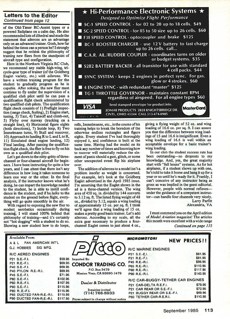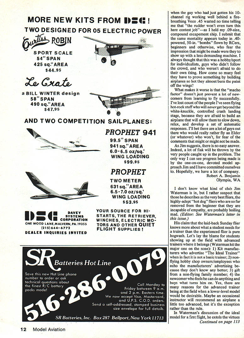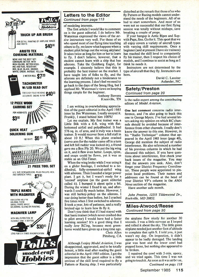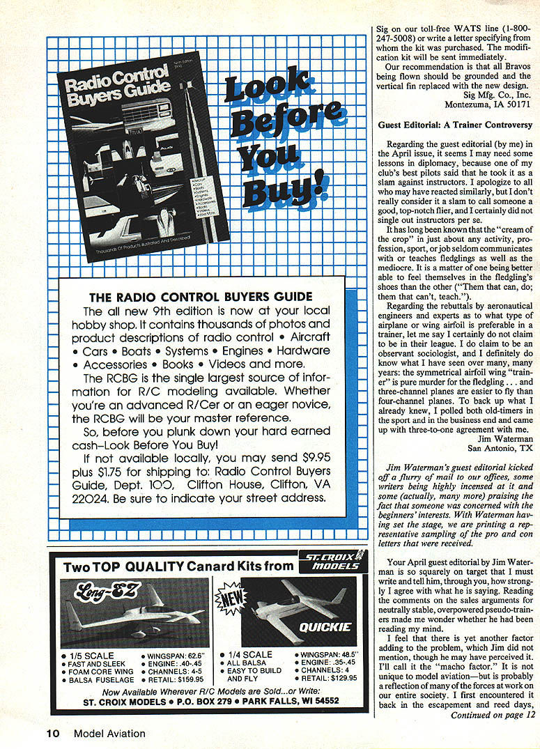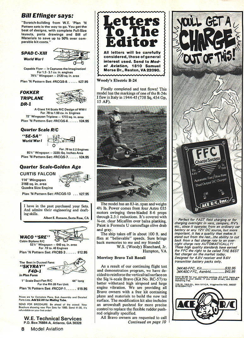 Bill Effinger says Scratch-building WE Plan N Pattern sets way go get best designs complete Full-Size layouts parts drawings Bill Materials save up 50% over com parable kit costs SPAD C-XIII Capable Flyer ures Imagination 13-31 cu engines 79 Wingspan sq area Plan N Pattern Set #RCQS-8$2795 FOKKER TRIPLANE DR-i Giant 114 Scale RI C Design WW-l 78 150 cu Engines 72 Wingspan Triplane sq area Plan N Pattern Set #RCQS-6... $2495 Quarter Scale RIC SE-5A World Wan 0 78 22 Engines 80 Wingspan Sq Inches Area Plan N Pattern Set #RCQS-7 2495 Quarter Scale-Golden Age CURTIS FALCON- 114 Wingspan3168 sq area Quadra Size Engine Plan N Pattern Set #RCQS-13 . $2795 have past purchased Sets j admire engineering draft ing skills Albert E Rosnane Santa Rosa CA WACO SRE- Cabin Biplane RIC 52/a Wingspan sq area 19 40 Engines Plan N Pattern Set #RC8S-3 .. $1295 Best Ducted Fans SKYRAY F4D-i Plan Form 1 Scale Duct Fan RIC44 long RK-20 Fan Unit Plan N Pattern Set #RCDF-1 .. $1995 Prices Complete Plans Sub Assembly Detailed Parts Lists Add $200 Melliag Tube SEND OR SROCHURE 8e ahead crowd New Brochure showing new Plan Sets 1985 Send $100 its refundable first order WE Technical Services PO Box 76884-A Atlanta GA 30328 Woodys Electric B-24 Finally completed test flown model has markings B-24s flew Italy 1944-45 738 Sq 454 Gp 15 AF - mocl w 4 lb Power comes four Astro motors swinging three-bladed 8-6 props through 251 reductions Its covered -oz clear Micafilm over balsa planking Paint Formula U camouflage olive drab gray ship takes off about 100 ft flies believable speeds Sure brings back memories friends WS Woody Blanchard Jr Hampton VA Morrisey Bravo Tail Recall As result continuing flight test demonstration program have de cided reinforce vertical tail surface Sig -scale Bravo Kit No RC-57 better withstand high airspeed large engine vibration providing Bravo owners free kit containing plans materials build new tail surface modification kit also includes arrowshaft pushrod precise control replace flexible rudder pushrod originally specified Bravo owners requested call Continued page 10 34K40-FFC KitS3295 34K40C-FFC Asmbld$4295 Send $200 far ear eewplete cotelee ACE tows ore anoiloble ot year deolor yeu ardor direet odd $200 Hondling Fee lie w 16th St. use SilCA Hisglneellle MO 64037 alelse4-7121 ACE p 8 Model Aviation etters oThe Editor letters will carefully considered general interest used Send Mod el Aviation 1810 Samuel Morse Dr Reston VA 22090 e,se uaery important haa stand out back fast chai night charge rateICJ4LLY high quality standards have earned FFC right called THE BEST fast charger market today Designed 48V receiver 96V transmitter battery packs THE RADIO CONTROL BUYERS GUIDE new 9th edition now local hobby shop contains thousands photos product descriptions radio control raft Cars s ems nes ware Accessories s os RCBG single largest source infor mation RIO modeling available Whether re advanced R/Cer eager novice RCBG will master reference So before plunk down hard earned cashLook Before Buy available locally may send $995 plus $175 shipping Radio Control Buyers Guide Dept 100 Clifton House Clifton VA 22024 sure indicate street address II I II I I I I ii 1 III I I Sig toll-free WATS line 1-800247-5008 write letter specifying kit purchased modifi cation kit will sent immediately recommendation Bravos being flown should grounded vertical fin replaced new design Sig Mfg Co Inc Montezuma IA 50171 Guest Editorial Trainer Controversy Regarding guest editorial April issue seems may need some lessons diplomacy because clubs best pilots said took slam against instructors apologize may have reacted similarly dont really consider slam call someone good top-notch flier certainly did single out instructors per se has long knownthatthe cream crop just about activity pro fession sport job seldom communicates teaches fledglings well mediocre matter being better able feel themselves fledglings shoes other can cant teach Regarding rebuttals aeronautical englneers experts what type airplane wing airfoil preferable trainer let say certainly claim league claim observant sociologist definitely know what have seen over many years symmetrical airfoil wing train er pure murder fledgling. three-channel planes easier fly four-channel planes back up what already knew polled both old-timers sport business end came up three-to-one agreement Jim Waterman San Antonio TX Jim Watermans guest editorial kicked off flurry mail offices some writers being highly incensed some actually praising fact someone concerned beginners interests Waterman hav ing set stage printing rep resentative sampling pro con letters received April guest editorial Jim Water man squarely target must write andtell him through strong ly agree what saying Reading comments sales arguments neutrally stable overpowered pseudo-train ers made wonder whether reading mind feel yet another factor adding problem Jim did mention though may have perceived Ill call macho factor unique model aviationbut probably reflection of forces work entire society first encountered back escapement reed days Continued page 12 10 Model Aviation LI I I I I II I I I I I il I I I I I Two TOP QUALITY Canard Kits w 1/5 SCALE WINGSPAN 6260 1/4 SCALE WINGSPAN 485 FASTANDSLEEK ENGINE 40-450 ALL BALSA0 ENGINE 35-45 FOAM CORE WING NELS 4-50 EASY TO BUILD0 CHANNELS 4 BALSA FUSELAGE IL $15995AND FLY RETAIL $12995 Now Available Wherever RIG Models Sold.or Write ST CROIX MODELS s PO BOX 2790 PARK FALLS WI 54552 MORE NEW KITS FROM 114 TWO DESIGNED FOR 05 ELECTRIC POWER RQIN SPORT SCALE 54 S PA N 425 sqAREA $4495 BILL WINTER design 58 SPAN 490 sqAREA $4795 AND TWO COMPETITION SAILPLANES N x hjflDAVEY SYSTEMS FCORPORATION ONE WOOD LANEMALVEENPA193S5 215644-6772 DEALER INQUIRIES INVITED PROPHET 941 995 SPAN 941 sq AREA 60-65 oz/sq WING LOADING $9995 PROPHET TWO METER 631 sqAREA 65-70 oz/sq WING LOADING $5395 YOUR SOURCE FOR HISTARTS THE RETRIEVER WINCHES ELECTRIC MO TORS AND OTHER QUIET FLIGHT SUPPLIES guy jus