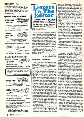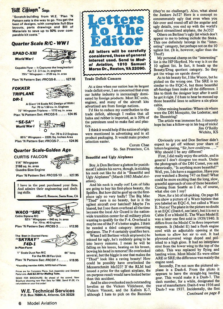 Scratch-building WE Plan N Pattern sets way go get best designs complete Full-Size layouts parts drawings Bill Materials save up 50% over com parable kit costs Quarter Scale R/C WW SPAD C-XIII World Wan Capable Flyer ures Imagination 1331 Cu ifl engines 79% Wingspan sq area Plan N Pattern Set #RCQS-8 2796 FOKKER TRIPLANE DR-i Giant 114 Scale RIC Design WW-l 78 160 cu Engines 72 Wingspan Triplane sq area Plan N Pattern Set #RCQS-6 $2495 SE-5A World Wan 78 22 Engsnes 80W Wingspan Sq Inches Area Plan N Pattern Set #RCQS-7 $2495 Quarter Scale-Golden Age CURTIS FALCON 114 Wingspan 3168 sq area Quadra Size Engine Plan N Pattern Set #RCQS 13$27 95 II have past purchased Sets admire engineering draft ing Aibert E Ronsane Santa Rosa CA WACO SRE Cabin Biplane RIC 52% Wingspan sq area 19 40 Engines Plan N Pattern Set #RC8S-3$1295 Best Ducted Fans SKYRAY F4D-i Plan Formr 1 Scala Duct Fan RIC44 long RK-20 Fan Unit Plan N Pattern Set #RCDF-1$1995 Foundlng member AMA NFFS Hell Famer Prices Complete Plans Sub Assembly snd Oetsiled Parts Lists Add $200 f Mailing Tube SEND FOR BROCHURE ahead crowd New Brochure showing new Plan Sets 1986 Send $100 its refundable first order WE Technical Services P0 Box 76884-A Atlanta GA 30328 1etters oThe Editor letters will carefully considered general interest used Send Mod el Aviation 1810 Samuel Morse Dr Reston VA 22090 Trade Deficit Concern time nation has its largest trade deficit ever am concerned hobby industry increasingly domi nated foreign products Most RC units engines aircraft kits advertised foreign nations Id like reduce contribution trade deficit although realize balsa rubber imported 50% petroleum used make fuel plas tics think would help nation origin mentioned advertising product packaging would make product selection easier Comm Chan So San Francisco CA Beautiful Ugly Airplanes Boy Don Berliner glutton punish ment admire nerve though sticking neck out like did Beautiful Ugly Airplanes March 1985 Model vi ation neck really out Lots folks going buy first-place beauty Spitfire did goof up firstplace ugly very badly Big Mac Thud sure no beauty ugliest aircraft ever hatched Maybe Im biased see overhead time because local Air Guard nation wide transition center military pilots wanting qualifr F-4 Overhead maybe F-4s better angles think needed third category interesting airplanes F-4 certainly qualifies tell Berliner airplanes missed ugly hes suddenly going heavy remorse mean will falling knees beating breast bowing head remorse overlooked several biggie makes Thud look like raving beauty could possibly have overlooked Messerschmitt Me323 RLM issued prize ugliest airplane on-purpose result would have looked better accident also overlooked such outstanding lovelies Vickers Vildebeest Vickers Vincent Kalinin K-7 although hate pick Russians theyre no challenge Also what about Junkers Ju52 concept consummately ugly fair-over round-off angular ugly details end up worlds ugliest streamlined airplane Ju352 Others Berliners ugly list dont appear to belong include Stuka definitely belongs inter esting category perhaps 10 ugliest list however uglier Thud personal champ interesting list HP Heyford No way 10 ugliest list fact heads up Beauty/Drag quotient category So got wings upside down As beauty list like Wacos picked wrong SRE similar EQC-6 beautiful aft-fuselage lines make difference like think designer kept after until got right Id hate hear messed up beautiful lines achieve six-place cabin Other missing beauties oh DH Mosquito Lodestar Shoestring article immense fun sincerely hope has follow-up bag tricks Jim OReilly Wichita KS Obviously Don Berliner didnt expect get off share letters beginning Sir could you.. should different First did really enjoy article general dont disagree too much Under photograph DH Comet ask rhetorically anything beautiful Well yes have suggestion Have ever watched Boeing 747 final What could exciting long slow graceful approach beauties Coming Seattle course what else can say Now bit nit-picking page 86 show picture Waco biplane labeled EQC-6 called Waco E plane picture no doubt EQC Dash 6 see later Cabin E Model E Waco Model E later first sold 1939/1940 differs Model C three important respects Model E flush engine cowl adjustable opening bottom allow hot air exit plywood-covered wings doped pol ished high gloss no interplane strut lower wing top cabin replaced flying landing wires Most Model Es either ARE SRE difference mainly engine used Secondly Im sure pictured air plane Dash-6 photo appears have straight-leg landing gear would make Dash-7 dash number designated year manufacture Dash-6 1936 Dash-7 1937 Incidentally first Continued page 8 6 Model Aviation CHECK THESE FEATURES THEN COMPARE! High Film Strength Lubricant spe cial additives increase lubri city extreme pressure character istics oil Viscosity index Improvers insure proper lubrication high RPM high temperatures Wetting Agents increase plating action oil Speciai Detergents cut power rob bing varnish Anti-Foam Additives prevent high RPM lean-out Rust Preventatives protect expensive engines Highest Qusitty ingredients insure top engine performance reliability Sheldons Au New Super-Sport Fuels special biend Nltros tower flying costs insure long engine life hsve lowered oh content fuel tormuiatlons letter description named engine second wing used third actual model Now could What happened Stinson Gull Wing SR-8 Howard DGA-8 later Beech Staggerwing dont forget wooden wonders Lockheed Vega Orion Ranger-engined Fairchild F-24 Oh well what dull world would agreed everything time enjoyed Berliners Nieuport Type 24 article February issue want Waco information suggest consult real expert Maj EJ Millikan USAF Ret 2112 Komo Mai Dr Pearl City HI 96782 Robert Wynne Mercer Island WA Now Don Berliner has played Don Quixote must have mail like Miracle 34th Street Hell busy reading well never see fine articles certainly admire courage insanity Needless say Im just another has different ideas be