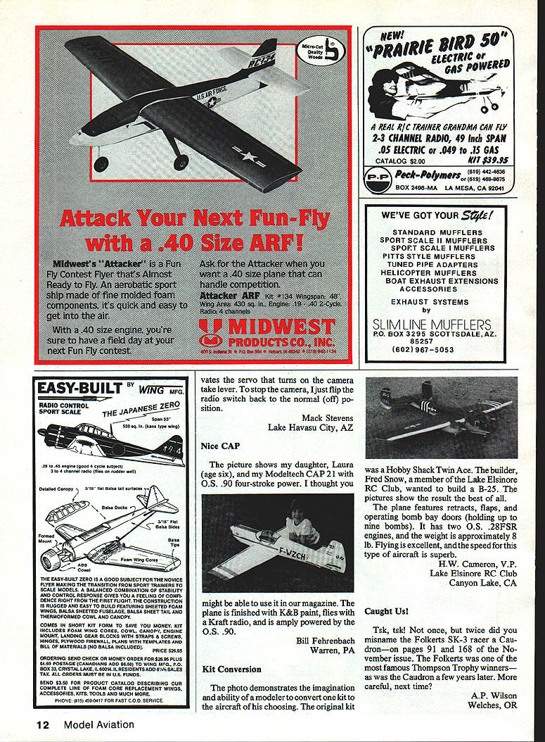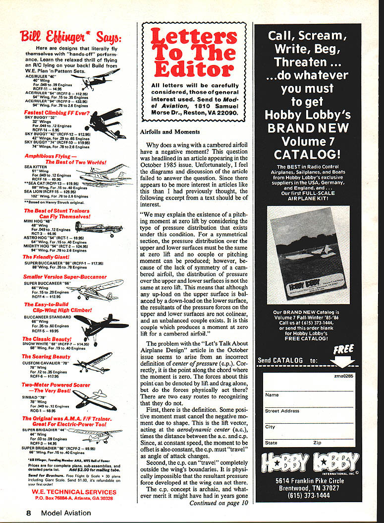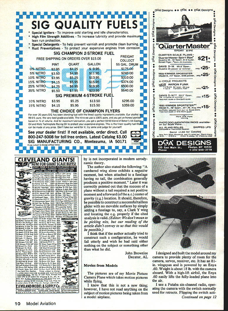 Here designs literally fly themselves hands-off perform ance Learn relaxed thrill flying RIC lying backl Build WE Plan n Pattern Sets ACEIRuLER 40 40 Wing 049 09 Engines RCFF-11 ACEIRULER 54 RCFF-6 9 54 Wing 15 35 Engines ACERULER $4 IRCFF-9 5 94 Wing 75 26 Engines Fastest Climbing FF Ever SKY BUGGY 32 32 WIngs 049 12 Engines RCFF-14 695 SKY BUGGY 42 IRCFF-12 5 42 WIngs 29 65 Engines SKY BUGGY 74 IRCFF-10 $1995 74 WIngs 78 26 Engines Amphibious Flying Best Two Worlds SEA KITTEN 048 12 Engines AC7J RCFF-16 SEACATIRCFF-13$1999 U Wing 15 40 Engines SEA LION IRCFF-15 9 102 Wing 78 26 Engines 5esed Henry Struck origins Best Stunt Trainers Can Fly Themselves MINI HOG 48 049 12 Engines RCT-3 ASTRO HOG 54 RCT-1 1 54 Wing 15 40 Engines MIGHTY HOG 04 RCT-2 $2495 $4 Wing 78 26 Engines Friendly Giant SUPER BUCCANEER 86 RCFF-1 9 65Wing 35 78 Engines Smaller Version Super-Buccaneer SUPER BUCCANEER66 66 Wing ForlSto29Engines RCFF-4 9 Easy-to-Build Clip-Wing High Climber BUCCANEER STANDARD 66 Wing 35 60 Engines RCFF-5 68 18 40 ~lIIP Classic Beauty SNOW WHITE 68 RCFF-7 9 Wing ForEngines Soaring Beauty CUSTOM CAVALIER 76 76 Wing 12 35 Engines RCFF-6 9 Two-Meter Powered Soarer -The Very Best SINBAD 78 76 Wing 049 12 Engines RCG-1 Original AMA F/F Trainer Great Electric-Power Too SUPER BRIGADIER 44 44 Wing 03 Q9 Engines RCFF-3 SUPER BRIGADIER 68 RCFF-2 $999 68 WIng 15 40 Engines SIll Effleger Fesedsg Mee&er AMA NFIS Hell ef Ferns Prices ere complete plans sub-essemblies end deteiled perts list Add $200 mailing tube Seed Brochure Free Flight & Scale lans including Giant Scale Send $100 its refundable first order WE TECHNICAL SERVICES P0 Box 76884-A Atlanta GA 30328 Airfoils Moments does wing Cambered airfoil have negative moment question headlined article appearing October 1985 issue Unfortunately feel diagrams discussion article failed answer question Since appears interest articles like previously thought following excerpt text should interest may explain existence pitch ing moment zero lift considering type pressure distribution exists under condition symmetrical section pressure distribution over upper lower surfaces must same zero lift no couple pitching moment can produced however cause lack symmetry cam bered airfoil distribution pressure over upper lower surfaces same zero lift means although up-load upper surface bal anced down-load lower surface resultants pressure forces upper lower surfaces colinear unbalanced couple exists couple produces moment zero lift cambered airfoil problem Lets Talk About Airplane Design article October issue seems arise incorrect definition center ofpressure cp Cor rectly point along chord moment zero forces about point can denoted lift drag alone forces physically act two easy routes recognizing First definition Some posi tive moment must cancel negative mo ment due shape lift vector acting aemdynamic center ac times distance between ac cp Since constant speed moment offset also constant cp must travel angle attack changes Second cp can travel completely outside wings boundaries physi cally impossible resultant pressure force developed wing can act cp concept archaic what ever merit might have years gone Continued page 10 8 Model Aviation JetWs Editor letters will carefully considered general interest used Send Mod1 Aviation 1810 Samuel Morse Dr Reston VA 22090 NE .EEEE.E SIG QUALITY FUELS Special Igniters improve cold starting idle characteristicsU High Film Strength Additives increase lubricity provide maximun1 lean run protection Special Detergents help prevent varnish promote clean burning Rust Preventatives protect expensive engines corrosion FREIGHT COLLECT U PINT55 GAL DRUM $17500 $2400 $31000 $37400 $50000 $64000 0% NITRO$295 5% NITRO$350 10% NITRO$395 15% NITRO$415 25% NITRO$475 35% NITRO$550 FUEL QUARTGALLON $425$995 $495$1195 $525$1395 $5951595 1995 $795$2395 U U U U U U SIG PREMIUM 4-STROKE FUE 10% NITRO$395$525$1350$29500 15% NITRO$415$595$1550$35900 THE CHOICE OF CHAMPION FLYERS 20 years SIG has blending fuel finest quality ingredients available alcohol i ove 5Tpu e very best grade available nitro use 100 o pure get honest portiO volume maximum lubrication get perfect 50/50 blend Bakers AA Castob U o echniplate Racing Oil protect expensive engines finest quality fuel tha can made price Dont take word try some judge yourselfl See dealer first available order direct Call 800-247-5008 toll free orders Latest Catalog $300 SIG MANUFACTURING CO Montezuma IA 50171 Prices suhiect change nOtice SIG CHAMPION 2-STROKE FREE SHIPPING ON ORDERS OVER $1500 U U U U U U U U U U U U U U U U I U U incorporated modem aerody nainic theory author also stated following cambered wing alone exhibits negative moment attached fuselage having no tail combination generally produces positive moment Later correctly pointed out success plane tail required net positive moment forward ac center gravity cg location should therefore possible construct successful tailless glider no movable surfaces simply adding fuselage say Clark Y wing locating cg properly cited analysis valid Editor dont mean picking nits reading article didnt convey us would possible think author actually tried construct such configuration would fail utterly wish said either nothing subject something other what did John Browalee Decatur AL Movies Models pictures Movie Picture Camera Plane takes motion pictures flying know new thing however have read anything subject motion pictures being taken model airplane DGA DesignS 00 DGA OS DG4 DesignS5 00 00 0 S C 01 w $3 0 4 0 0 0 0 QiiarterMaster SSPORT BiPE $3 0OuARTER SCALE PLANSQuarter Master Sport Blpe Quadra 35.73Spafl.EZ build. Great Flywr.eSemXt AaiaOie 0 DAVIS DIK 905 Span. Quadra 35 pOwer O Similar. C KINNER SPORTSTER S Model K.117 Span.O35 power. 31 __________________ 0 4-CYCLE PROJECTS sEaJeKces1 0 onciePentactO Fiveepol S p sl5e 4 0 0 0 S 0 0 S ______________0 0 S 0 0 S S PHOTO DOCUMENTATION PACKS availableon Scala Plans ALL PLANS ROLLEDSHIPPED UPS Complete w instroot