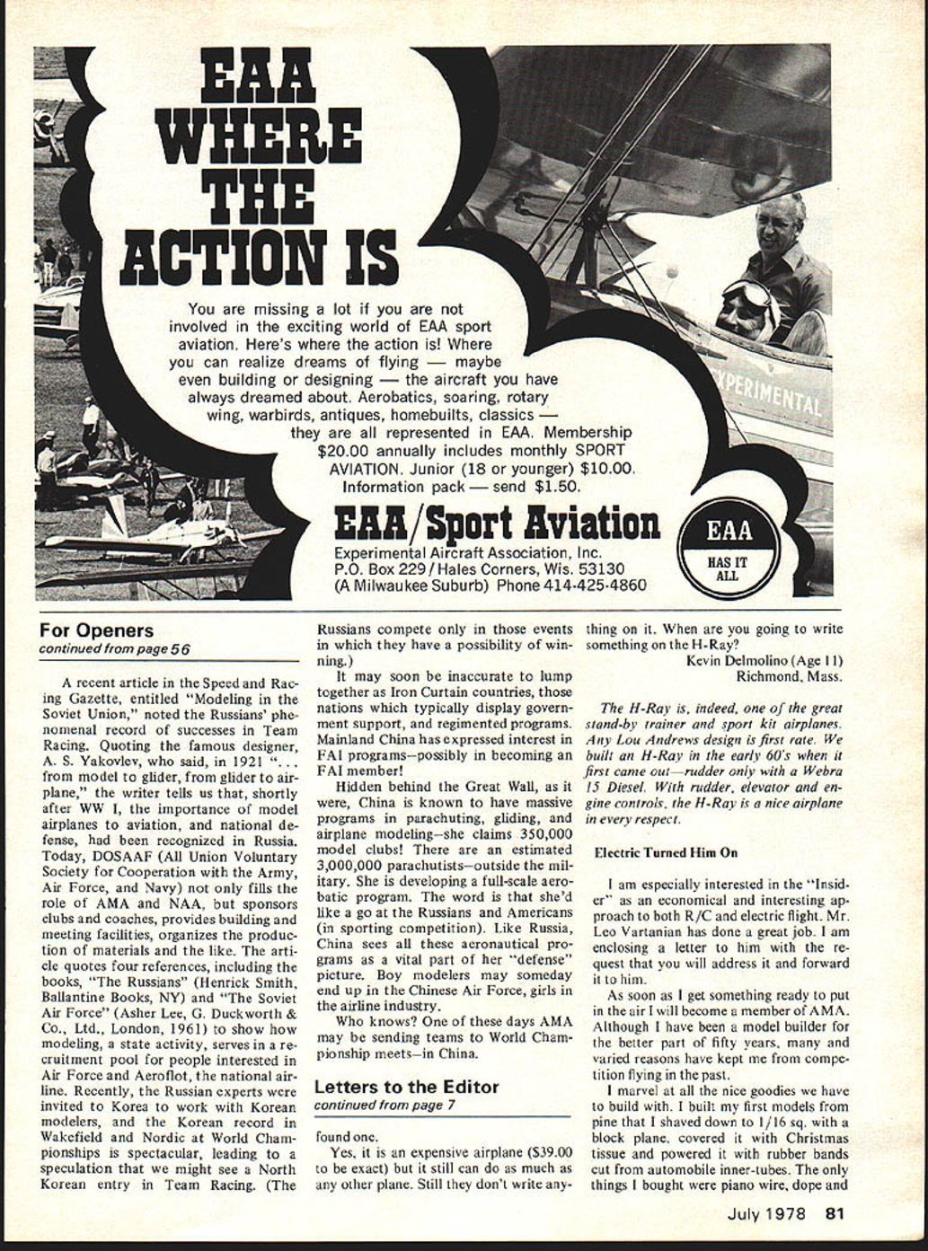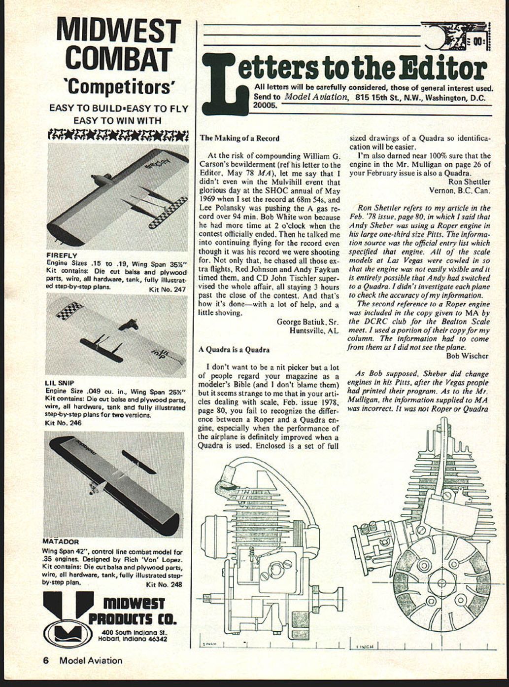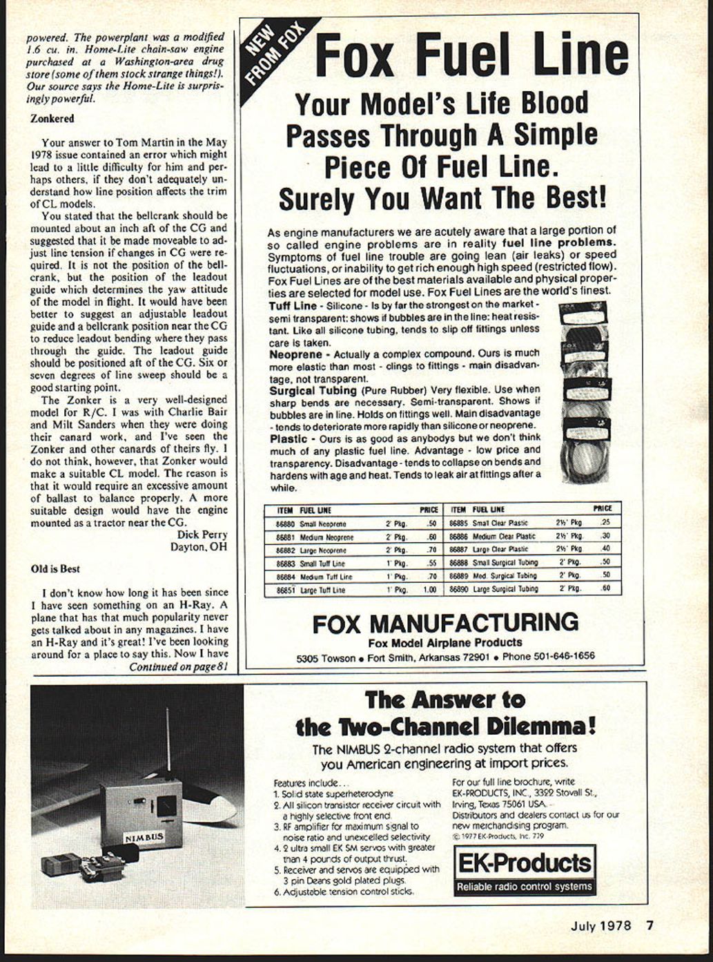 MIDWEST COMBAT Competitors EASY TO BUILDEASY TO FLY EASY TO WIN WITH P minwes PRODUCTS CO 400 South Indiana St MHobart IndIana 46342 Letters Editor letters will carefully considered general interest used Send Model Aviation 815 15th St NW Washington DC 20005 Making Record risk compounding William G Carsons bewilderment ref letter Editor May 78 MA let say didnt win Mulvihill event glorious day SHOC annual May 1969 set record 68m 54s Lee Polansky pushing gas re cord over 94 mm Bob White won because time 2 oclock contest officially ended talked continuing flying record though record shooting chased ex tra flights Red Johnson Andy Faykun timed CD John Tischler super vised whole affair staying 3 hours past close contest thats its donewith lot help little shoving George Batiuk Sr Huntsville AL Quadra Quadra dont want nit picker lot people regard magazine modelers Bible dont blame seems strange arti cles dealing scale Feb issue 1978 page 80 fail recognize differ ence between Roper Quadra en gine especially performance airplane definitely improved Quadra used Enclosed set full sized drawings Quadra identifica cation will easier Im also darned near 100% sure engine Mr Mulligan page 26 February issue also Quadra Ron Shettler Vernon BC Can Ron Shettler refers article Feb 78 issue page 80 said Andy Sheber using Roper engine large one-third size Pitts informa tion source official entry list specled engine scale models Las Vegas cowled engine easily visible entirely possible Andy switched Quadra didnt investigate plane check accuracy ofmy information second reference Roper engine included copy given MA DCRC club Bealton Scale meet used portion copy column information come did see plane Bob Wischer As Bob supposed Sheber did change engines Pitts after Vegas people printed program As Mr Mulligan information supplied MA incorrect Roper Quadra 0 Ai 6 Model Aviation IIHLY Engine Sizes 15 19 Wing Span 35W Kit contains Die cut balsa plywood parts wire hardware tank fully illustrat ed step-by-step plans vt Mn 947 LIL SNIP Engine Size 049 Cu Wing Span 25W Kit contains Die cut balsa plywood parts wire hardware tank fully illustrated step-by-step plans two versions Kit No 246 Wing Span 42 control line combat model 35 engines Designed Rich Von Lopez Kit contains Die cut balsa plywood parts wire hardware tank fully illustrated stepby-step planKit No 248 powered powerplant modified 16 Cu fl Home-Lite chain-saw engine purchased Washington-area drug st ore some stock strange things source says Home-Lite surpris ingly powerful Zonkered answer Tom Martin May 1978 issue contained error might lead little difficulty him per haps others dont adequately un derstand line position affects trim CL models stated bellcrank should mounted about inch aft CG suggested made moveable ad just line tension changes CG re quired position bellcrank position leadout guide determines yaw attitude model flight would have better suggest adjustable leadout guide bellcrank position near CG reduce leadout bending pass through guide leadout guide should positioned aft CG Six seven degrees line sweep should good starting point Zonker very well-designed model R/C Charlie Bair Milt Sanders doing canard work Ive seen Zonker other canards fly think however Zonker would make suitable CL model reason would require excessive amount ballast balance properly suitable design would have engine mounted tractor near CG Dick Perry Dayton OH Old Best dont know long has since have seen something H-Ray plane has much popularity never gets talked about magazines have H-Ray its great Ive looking around place say Now have Continued page 81 7Fox Fuel Line Models Life Blood Passes Through Simple Piece Fuel Line Surely Want Best As engine manufacturers acutely aware large portion called engine problems reality fuel line problems Symptoms fuel line trouble going lean air leaks speed fluctuations inability get rich enough high speed restricted flow Fox Fuel Lines best materials available physical proper ties selected model use Fox Fuel Lines worlds finest Tuft Line Silicone far strongest market _________ semi transparent shows bubbles line heat resis- Like silicone tubing tends slip oft fittings unless care taken Neoprene Actually complex compound much elastic clings fittings main disadvan tage transparent Surgical Tubing Pure Rubber Very flexible Use sharp bends necessary Semi-transparent Shows bubbles line Holds fittings well Main disadvantage tends deteriorate rapidly silicone neoprene Plastic good anybodys dont think much plastic fuel line Advantage low price transparency Disadvantage tends collapse bends hardens age heat Tends leak air fittings after ITEM FUEL UHf 86880 Small Neoprene2 Pkg.5086885 Small Clear Plastic2 Pkg.25 86881 Medium Neoprene2 Pkg8086886 Medium Clear Plastic2 Pkg.30 86882 Large Neoprene2 Pkg7086887 Large Clear Plastic2 Pkg.40 86883 Small Tuft Line1 Pkg5586888 Small Surgical Tubing2 Pkg.50 86884 Medium Tuft Line1 Pkg7086889 Med Surgical Tubing2 Pkg.50 86851 Large Tuft Line1 Pkg1 0086890 Large Surgical Tubing2 Pkg.60 FOX MANUFACTURING Fox Model Airplane Products 5305 Towson Smith Arkansas 72901 e 501-646-1656 Answer Thro-Channel Dilemma NIMBUS 2-channel radio system offers American engineering import prices Features include. 1 Solid state superheterodyne 2 All silicon transistor receiver circuit highly selective front end 3 RF amplifier maximum signal noise ratio unexcelled selectivity 4 2 ultra small EK SM servos greater 4 pounds output thrust 5 Receiver servos equipped 3 pin Deans gold plated plugs 6 Adjustable tension control sticks full line brochure write EK-PRODUCTS INC 3322 Stovall St Irving Texas 75061 USA Distributors dealers contact us new merchandising program 1977 EK-Products Inc 779 EK-Products July 1978 7 ERA WHERE THE ACTION IS missing lot involved exciting world FAA sport aviation Heres action can realize dreams flying e building designing raft have always dreamed about Aerobatics soaring rotary wing warbirds antiques homebuilts cla