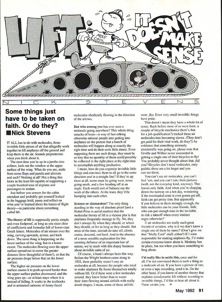 N-II GI-STVS have taken faith P Nick Stevens IT ALL has molecules invisible little pieces air allegedly work together lift airplanes off ground keep air Sounds preposterous think about next time youre up jumbo-size airliner look out window upper surface wing What see aside some flaps panels ailerons such Nothing thing looks least bit capable supporting couple hundred tons airplane passengers midair Just before scream cabin attendant probably get yourself locked baggage hold pause reflect what youve learned about basics flight theoiyin particular about something called lift theory lift supposedly pretty simple foolproof long steer clear coefficients formulas full lower-case Greek letters Molecules air stream over wing curving upwards across back down same thing happening lower surface wing lesser extent molecules flowing over upper surface spread out cover greater distance thoughtful air pressure drops below lower surface higher air pressure lower surface causes push upward harder upper surface pushes downward wing goes upor least stays instead falling works textbooks animated cartoons funny-faced molecules obediently flowing direction arrows among has ever seen molecule going anywhere whole thing smacks hoaxa way fast-talking otherwise rational people getting airplanes pretext bunch molecules will happen along exactly right time eerie little dance supposing such things must tiny no quantity could possibly collected right place right time accomplish anything productive mean organize invisible little things convince go same direction straight line theyre up some must going west some going north few heading off angle would sort balance Out work others least theyd bumping other Science shamanism thing standing way absolute proof Nobel Prize aerial studies molecular theory lift vicious plot airplanes frequently manage fly No dont always Ily should should long should time aircraft take off climb cruise descend land absence sensible explanation seeming defiance important law nature stuck dopey business about invisible units air course hasnt always way Before Wright brothers came along 1903 probably werent air molecules because people tried make airplanes fly found themselves totally lift few molecules around knew better waste time flowing around airfoils really dumb shapes mean some airfoils werc flat very small invisible things have pride doesnt mean have whole lot sense Back before us born couple bicycle mechanics hows ajob qualification tricked air molecules becoming slaves dont get paid vital work As evidence something seriously unscientific going please note Orville Wilbur never succeeded getting single bicycles fly YOU probably never thought about did Bicycles dont need molecules pedals lot larger can see cant see air molecules cant feel em cant take pictures well eveiyday kind anyway leaves faith youre charging down runway hot day wondering overloaded crate ever gonna get off faith can get pretty thin apparently believe strongly enough little molecules can friends Still can put enough trust invisible risk takeoff instinct urges otherwise air molecules really such great Iriends aviation dont know single name Dont give Molly Cool stuff either responsible making airplanes fly Id make certain everyone knew about Modesty has its place have something brag about Id really like settle once Im convinced such thing molecule air have picture tape recording send other hand know another theory explains aerodynamic lift resorting invisible things Id like hear about Fame awaits 1992 91 Some things just