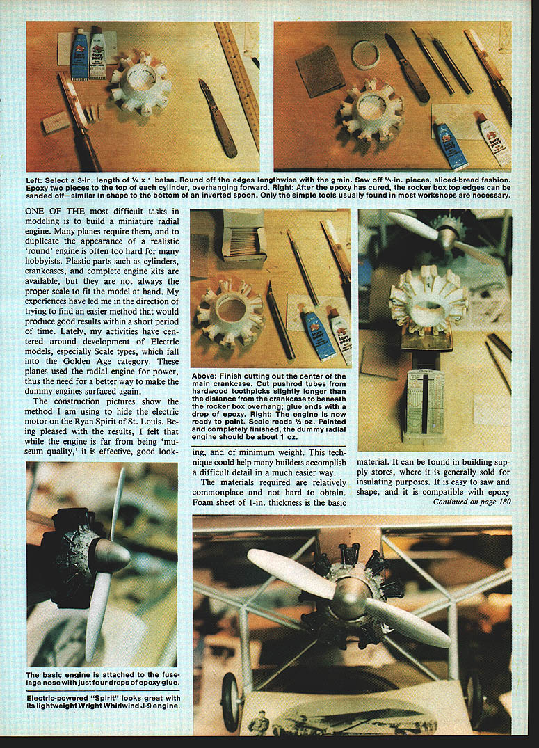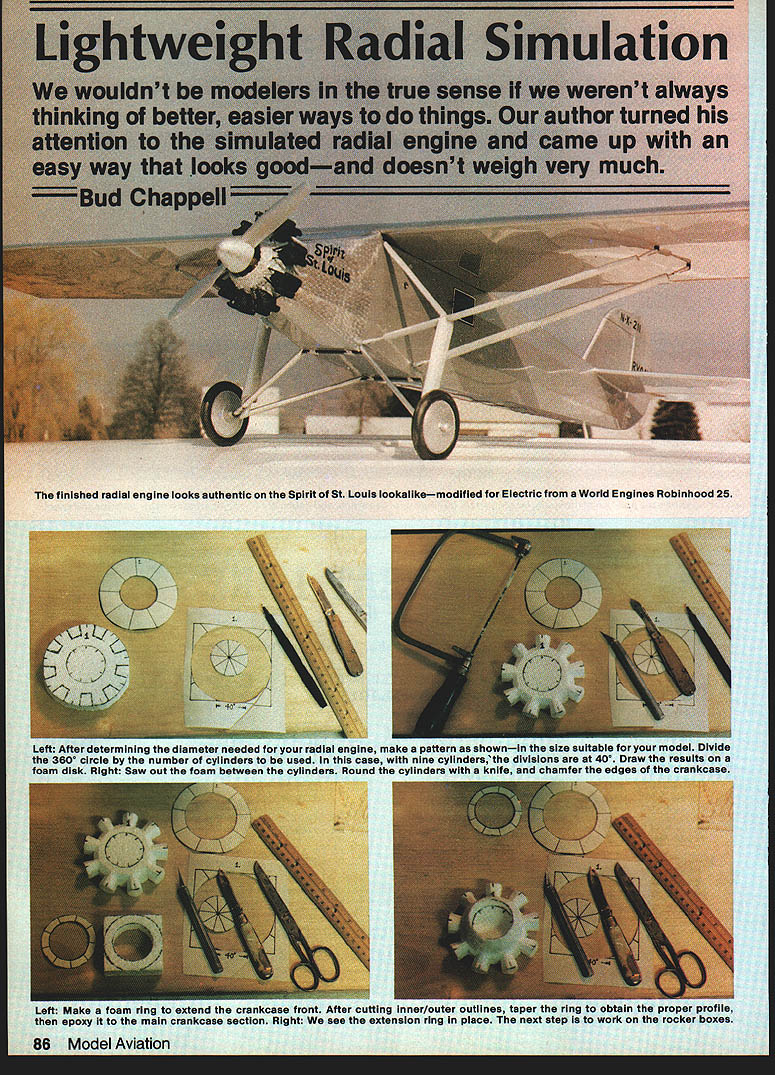 The finished radial engine iooks authentic Spirit St Louis iookaiikemodified Electric World Engines Robinhood 25 Left After determining diameter needed radial engine make pattern shownin size suitable moael uiviae 3600 circle number cylinders used case nine cyiindersthe divisions 4Q0 Draw resuits foam disk Right Saw out foam between cylinders Round cylinders knife chamfer edges crankcase Len M5KO roam ring o extend crankcase front After cutting inner/outer outlines taper ring obtain proper prof lie epoxy main crankcase section Right see extension ring place next step work rocker boxes 86 Model Aviation Left Select 3-in length 1/4 x 1 balsa Round off edges lengthwise grain Saw off Ia-in pieces sliced-bread fashion Epoxy two pieces top cylinder overhanging forward Right After epoxy has cured rocker box top edges can sanded offsimilar shape bottom inverted spoon Only simple tools usually found workshops necessary ONE OF THE difficult tasks modeling build miniature radial engine planes require duplicate appearance realistic round engine often too hard hobbyists Plastic parts such cylinders crankcases complete engine kits available always proper scale fit model hand experiences have led direction trying find easier method would produce good results within short period time Lately activities have cen tered around development Electric models especially Scale types fall Golden Age category planes used radial engine power thus need better way make dummy engines surfaced again construction pictures show method am using hide electric motor Ryan Spirit St Louis ing pleased results felt engine far being mu seum quality effective good look Electric-powered Spirit looks great its lightweight Wright Whirlwind J-9 engine material can found building sup ply stores generally sold insulating purposes easy saw shape compatible epoxy Continued page 180 Above Finish cutting out center main crankcase Cut pushrod tubes hardwood toothpicks slightly longer distance crankcase beneath rocker box overhang glue ends drop epoxy Right engine now ready paint Scale reads ainted completely finished dummy radial engine should about 1 oz ing minimum weight tech nique could help builders accomplish difficult detail much easier way materials required relatively commonplace hard obtain Foam sheet 1-in thickness basic basic engine attached fuse lage nose justfour drops ofepoxyglue FULL SIZE PLANS No 460 4-40$ 650 RO Low-wing sport flier 4-cycle 40-size engines No 461 Trlxter Barnstormer$ 650 CL Old-Time Stunt favorite 35 engines No 462 Porn Illo PE$ 400 FF Jumbo Rubber Scale WW Italian observation biplane No 192SUetfo CL Stunt model McDanald winner 19761980 1982 FAt World Champs$ 375 Na 225Oh HeUmble AC 70 version 38 old-timer REM controls 1 9-25$ 425 Na 239Bkis Erlie RC Ken Willards formation plane 4-channel 1 0-pnwer 75 Na 262Cruskaasler CL Crash-proof trainer Iwo oizes1 530- 35-40-power$ 125 Na 299Gu Sr Spmtatur- AC 1/4-scale Haffke fur 91 power Prototype span 30 tt Twa-and-a-halfsheets91175 Na 302MInI F-iS RCSarpolus 049 ducted tan sport flier 2-ctiaonel Balsa wings tail tose utnactore$ 275 Na 3101938 Phel Siplam RC Spurt Scale 35-40 4-channel Wingspan 58 scale Twe sheets9 625 No 314Drake RC Ken Willards flying bout tar 3-channel 15-power Fly land removable gear$ 375 INa 328Tayler Cub RC Don Sinus Schoolyard-Scale 049s 2-3 channel Spans 50 in$ 350 No 332Zaphyr AC Small 2-channel glider hand-mooch tow thermal slope osoong$ 200 Ma 343Weep Vk FF Mike Stoys Nats-winoing Outdoor HLG$100 INo 348Daeatep RC Trainer has very forgiving flying qualities Three-channel 1 0-25-power$ 425 Na 354Molly AC Giant 155-in span Sailplane uses 3 RC channels9750 INo 358 Mace: FF Indoor Easy B Rubber-power contest-winner W Van Gorder$ 100 Supescat RC Half-A Pylon Racoroport flier Aileron elevator coutrof Foum wing$ 200 No 365Saaoiaeter RC Willards 40-size flying bout 4-channel Strap-on gear laedplanef Two uheets91100 Na 383Calif 62 RC Fly sleek Nats-winning Sailplane AMA Mod SId Unlimited classes9 750Na 385Laser 200 AC Sport Scale replica championship Aerohatic flier Uses 40 power 4-5 channel Two sheets$1075 Na 393VIA Kisad King AC Reduced modernized version 1038 desigo 1/nA Old-Timer 2 3-channel9 450 No 398Bee If-i AC I-luff kus latest 1/4-scale spans 75 iv weighs 15 lb flies ou 90 larger Four sheets no doc$2225 Ne 399Zephyr 1100 AC AMA Class B Sailplane 3-channel AC gear9 675 Ne 403Cab Fhufplaee AC Sport Scale 0491 0-size engines 4-channel AC J-3 flouts classic9 650 Ne 408Re-Volt-Er AC electric-power spurt flier f 2-channel 05 motor9 650Ne 410Pier PIxIe AC Scale famous EAA plane 40-power 4-channel Build sport Precisine Two sheets plus doc91300 Ne 412Mas4alfe AC Sport Plane twin uses 18 engines 4-channel AC9 825 0Na 414ElechIc Spaiky AC elecfdc-powered fun tiler 05 motor 3-channel AC scaled up 1939 rubber-power tavorite9 850 0 Na 415lfawkerNardcaae Mb AC Electric-power Sport ScaleforiS motor 3-4 channels Two sheetsSills No 420BeCk 880 PP Competition Claus B fur 1 9-21 power Has variable-incidence tail VIT 600 VCNo422Scooter AC Two-Meter Sailplane has won Nuts event 1982 1993 plus other contests$ 550 -No 423 Chad Cramer AC Old-Timer takes 60-power 3-channel AC Two-piece wing optee easy transport Two sheets91275 No 424 Reed Tam FF Embryo Endurance rubber-power floalplane has optirmal wheels stick-and-flssae delight$ 200 n c Na 425 ChIna COpper AC Fabulous 74-in-span Sport Scale flying bout four 10-size engines 4-channel Three sheets no doc 0 oNa 427 Prafiha FF Travelair Mystery Ship Miss Los Angeles profile all-halsa rubber models sport flying 1 7-in-spao$ 200 INo 429 Deer E-Z CL Old-Timer Slant biplane has profile fuselage uses 25 engine6 400 Na 430seasIde AC Zippy little sportater 1015 power 3-channel AC 00 cNa 431Lockheed P38 AC Fun-scale twin-1 5-flier 4-channels Two sheets $1300 432Phualo CL Updated Thunderbird-style Sluvler 35-40 engines 575 E llNa 433Wilts Up AC Electric-powered glider 2-3 channels 035 motor spans 52 50 ui No 434Sly SIr CL 1/n