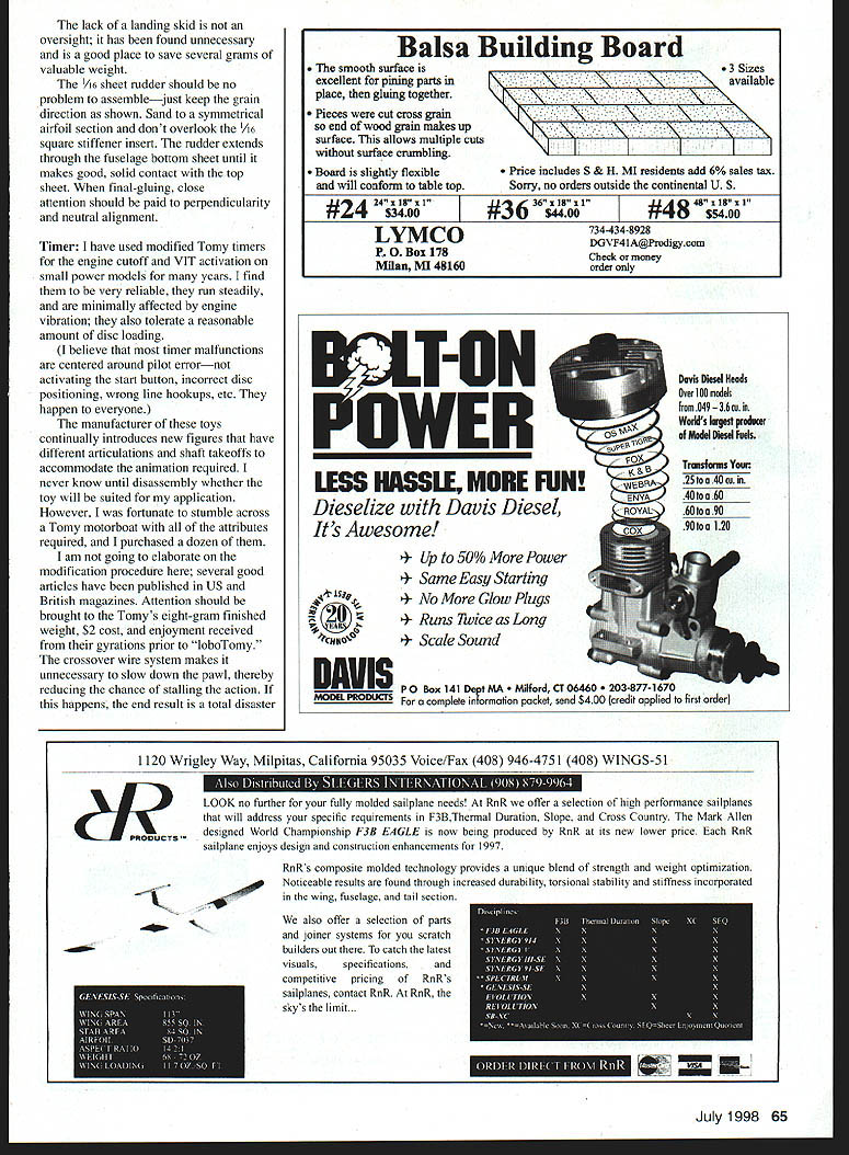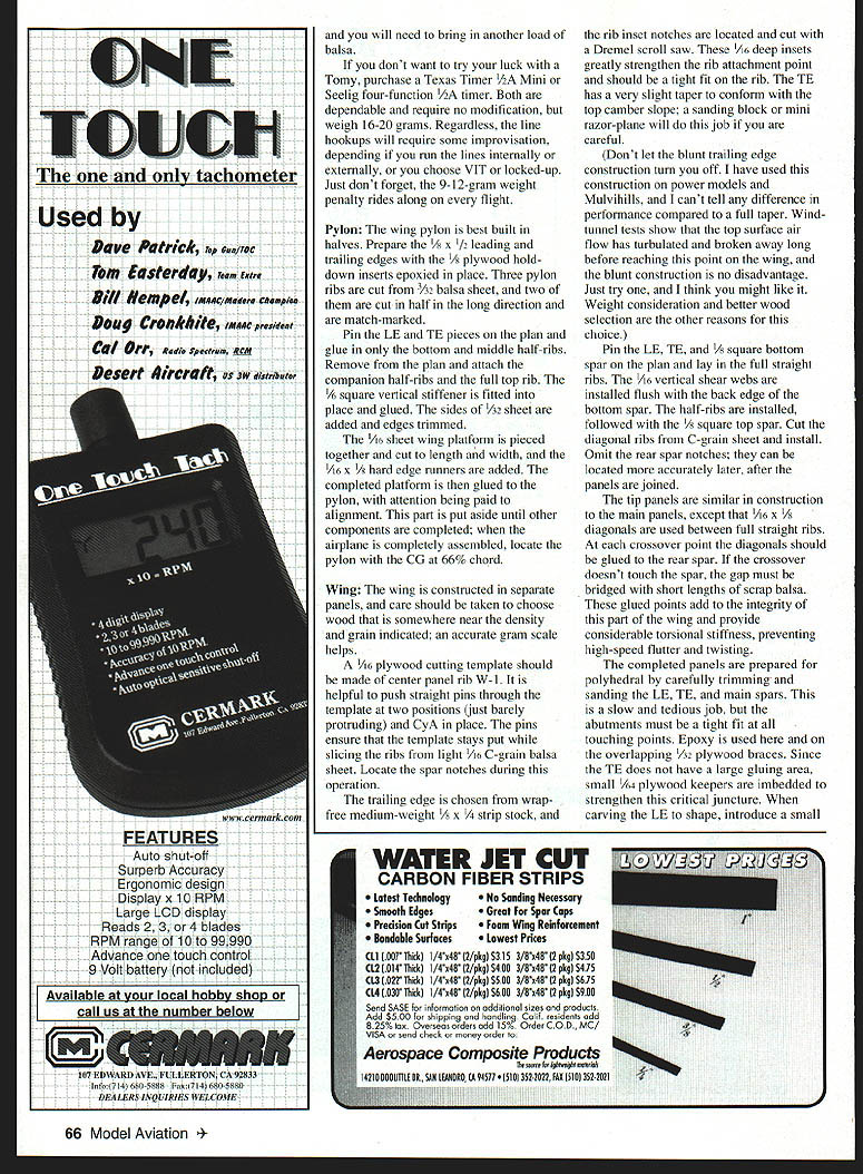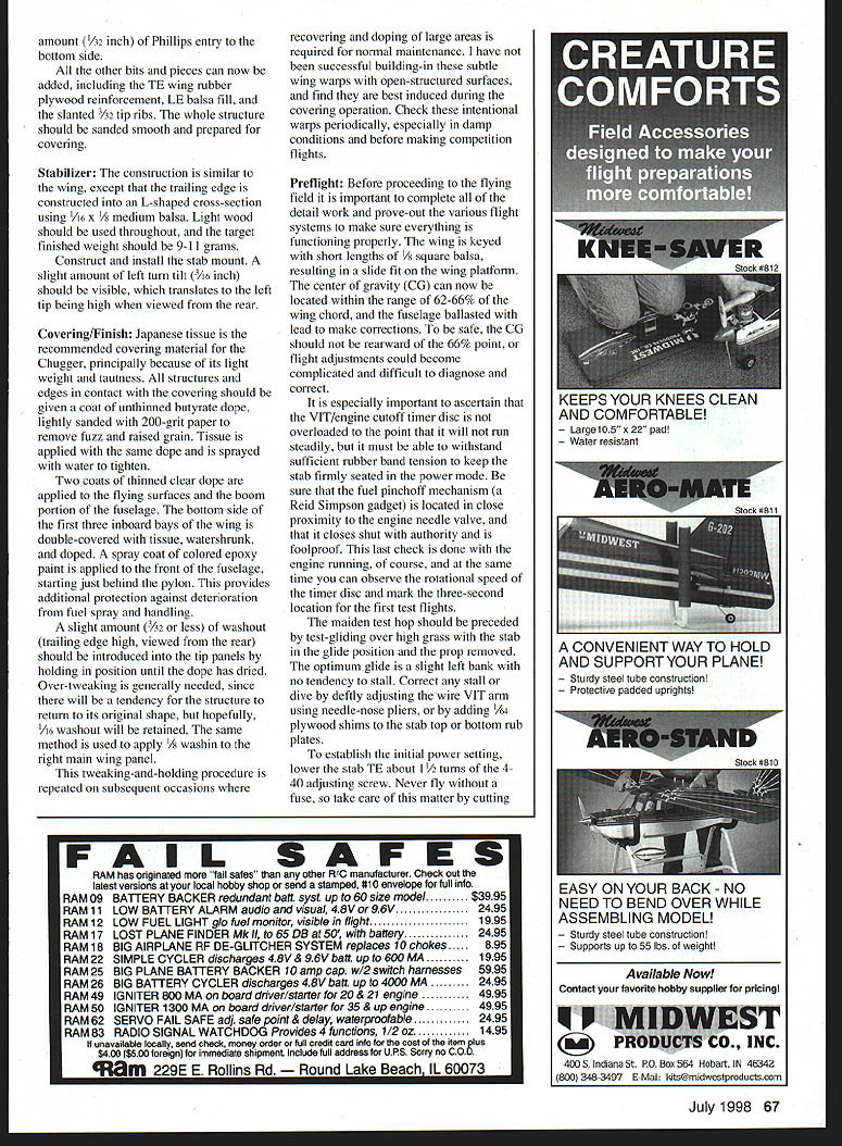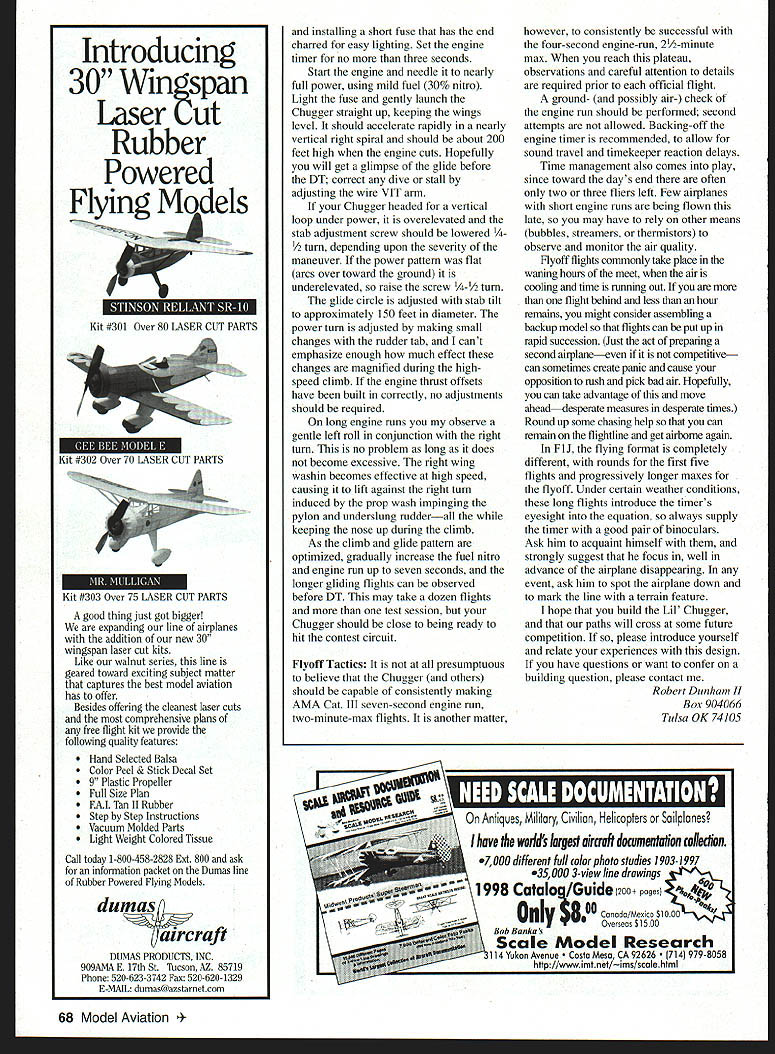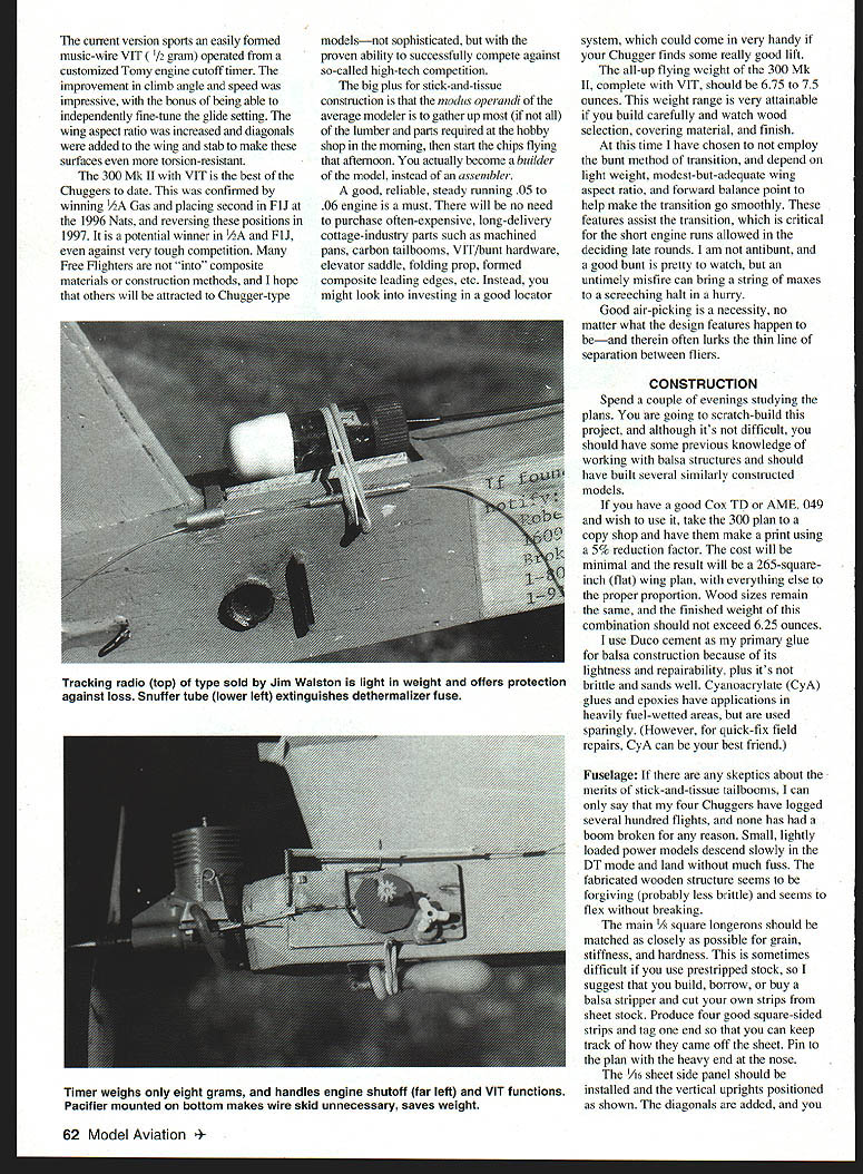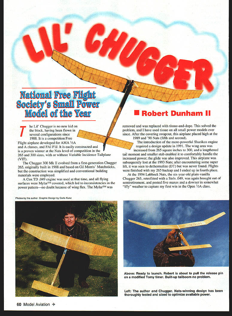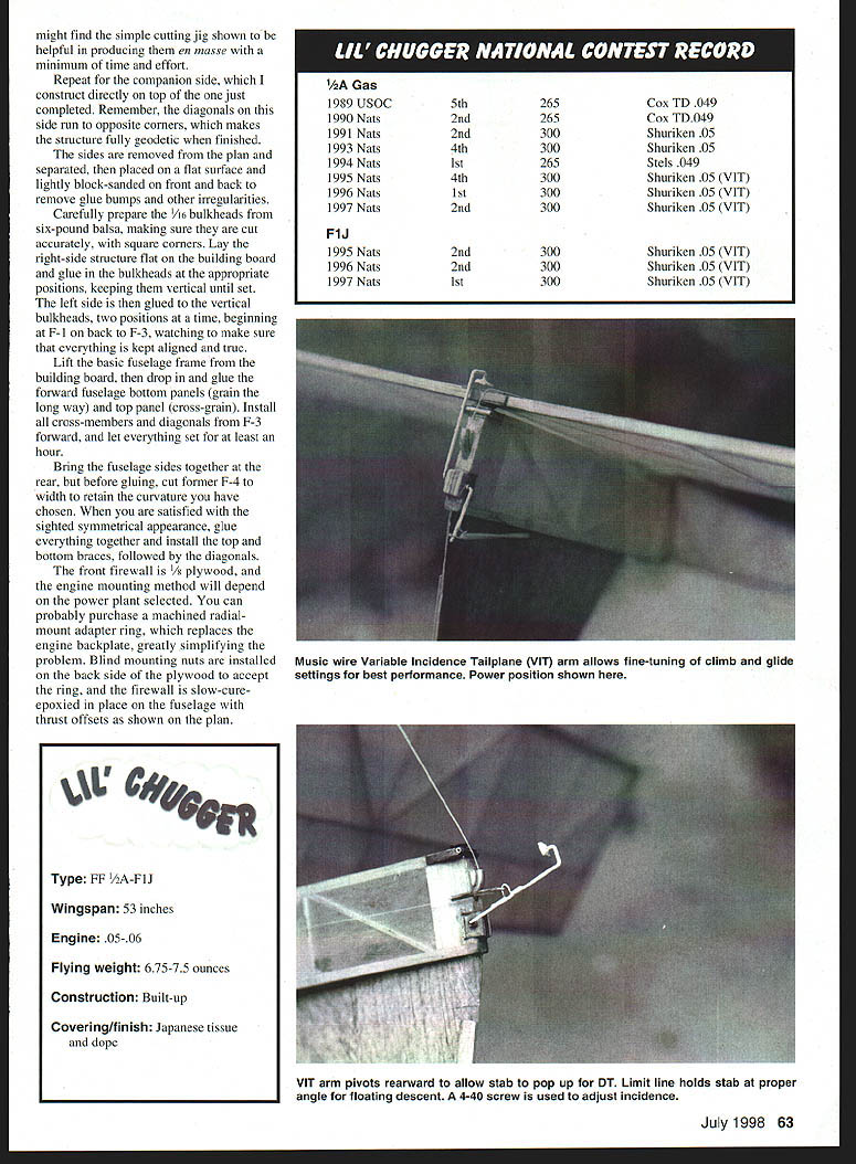 T Lii Chugger no new kid block having flown several configurations since 1988 competition Free Flight airplane developed AMA 1/2A classes FAJ FlJ easily constructed proven winner Nats level competition F 265 300 sizes Variable Incidence Tailplane VIT Chugger 300 Mk II evolved first-generation Chugger 265 originally built 1988 based Gil Morris Matchsticks construction simplified conventional building materials employed Cox TD 049 engine used time flying surfaces MylarTM covered led inconsistencies power patternno doubt because wing flex MylarTM Photos author Graphic Design Carla Kunz removed replaced tissue-and-dope solved problem have used tissue small power models ever since After covering swapout airplane placed high 1989 90 Nats fifth second introduction more-powerful Shuriken engine required design update 1991 wing area increased 265 square inches 300 lengthened tail moment smaller stab enabled comfortably handle increased power glide also improved airplane subsequently lost 1993 Nats after encountering some super lift seen dethermalize DT never found Flights finished 265 backup ended up fourth place 1994 Lubbock Nats six-year-old plain-vanilla Chugger 265 retrofitted Stels 049 again brought out semiretirement posted five maxes downer somewhat iffy weather capture first win Open 1/2A class Left The author Chugger Nats-winning design has thoroughly tested sized optimize available power 60 Model Aviation onal Free Flight So7md Power Year U Robert Dunham II Above Ready launch Robert about pull release pin modified Tomy timer Built-up tailboom no problem current version sports easily formed music-wire ViT 1/2 gram operated customized Tomy engine cutoff timer improvement climb angle speed impressive bonus being able independently fine-tune glide setting wing aspect ratio increased diagonals added wing stab make surfaces torsion-resistant 300 Mk II VIT best Chuggers date confirmed winning Gas placing second F1J 1996 Nats reversing positions 1997 potential winner FlJ against very tough competition Free Flighters composite materials construction methods hope others will attracted Chugger-type modelsnot sophisticated proven ability successfully compete against so-called high-tech competition big plus stick-and-tissue construction modus operandi average modeler gather up lumber parts required hobby shop morning start chips flying aftemoon actually become builder model instead assembler good reliable steady running 05 06 engine must will no need purchase often-expensive long-delivery cottage-industry parts such machined pans carbon tailbooms VIT/bunt hardware elevator saddle folding prop formed composite leading edges etc Instead might look investing good locator system could come very handy Chugger finds some really good lift all-up flying weight 300 Mk II complete VIT should 675 75 ounces weight range very attainable build carefully watch wood selection covering material finish time have chosen employ bunt method transition depend light weight modest-but-adequate wing aspect ratio forward balance point help make transition go smoothly features assist transition critical short engine runs allowed deciding late rounds am antibunt good bunt pretty watch untimely misfire can bring string maxes screeching halt hurry Good air-picking necessity no matter what design features happen beand therein often lurks thin line separation between fliers CONSTRUCTION Spend couple evenings studying plans going scratch-build project although its difficult should have some previous knowledge working balsa structures should have built several similarly constructed models have good Cox TD AME 049 wish use take 300 plan copy shop have make print using 5% reduction factor cost will minimal result will 265-squareinch flat wing plan everything else proper proportion Wood sizes remain same finished weight combination should exceed 625 ounces use Duco cement primary glue balsa construction because its lightness repairability plus its brittle sands well Cyanoacrylate CyA glues epoxies have applications heavily fuel-wetted areas used sparingly However quick-fix field repairs CyA can best friend Fuselage skeptics about merits stick-and-tissue tailbooms can say four Chuggers have logged several hundred flights has boom broken reason Small lightly loaded power models descend slowly DT mode land much fuss fabricated wooden structure seems forgiving probably less brittle seems io flex breaking main 1/ square longerons should matched closely possible grain stiffness hardness sometimes difficult use prestripped stock suggest build borrow buy balsa stripper cut own strips sheet stock Produce four good square-sided strips tag end can keep track came off sheet Pin plan heavy end nose YI6 sheet side panel should installed vertical uprights positioned shown diagonals added 62 Model Aviation king radio top type sold Jim Waiston light weight offers protection against loss Snuffer tube lower left extinguishes detilermalizer fuse Timer weighs eight grams handles engine shutoff far left VIT functions Pacifier mounted bottom makes wire skid unnecessary saves weight might find simple cutting jig shown helpful producing en masse minimum time effort Repeat companion side construct directly top just completed Remember diagonals side run opposite corners makes structure fully geodetic finished sides removed plan separated placed flat surface lightly block-sanded front back remove glue bumps other irregularities Carefully prepare A6 bulkheads six-pound balsa making sure cut accurately square corners Lay right-side structure flat building board glue bulkheads appropriate positions keeping vertical until set left side glued vertical bulkheads two positions time beginning F-l back F-3 watching make sure everything kept aligned true Lift basic fuselage frame building board drop glue forward fuselage bottom panels grain long way top panel cross-grain Install cross-members diagonals F-3 forward let everything set least hour Bring fuselage sides together
