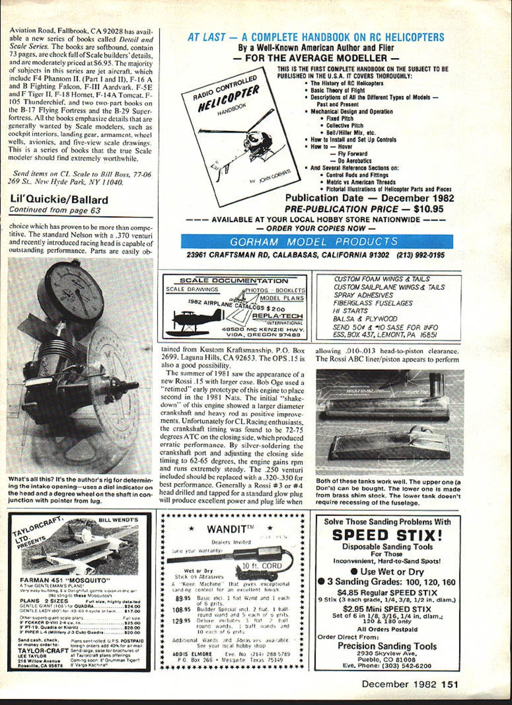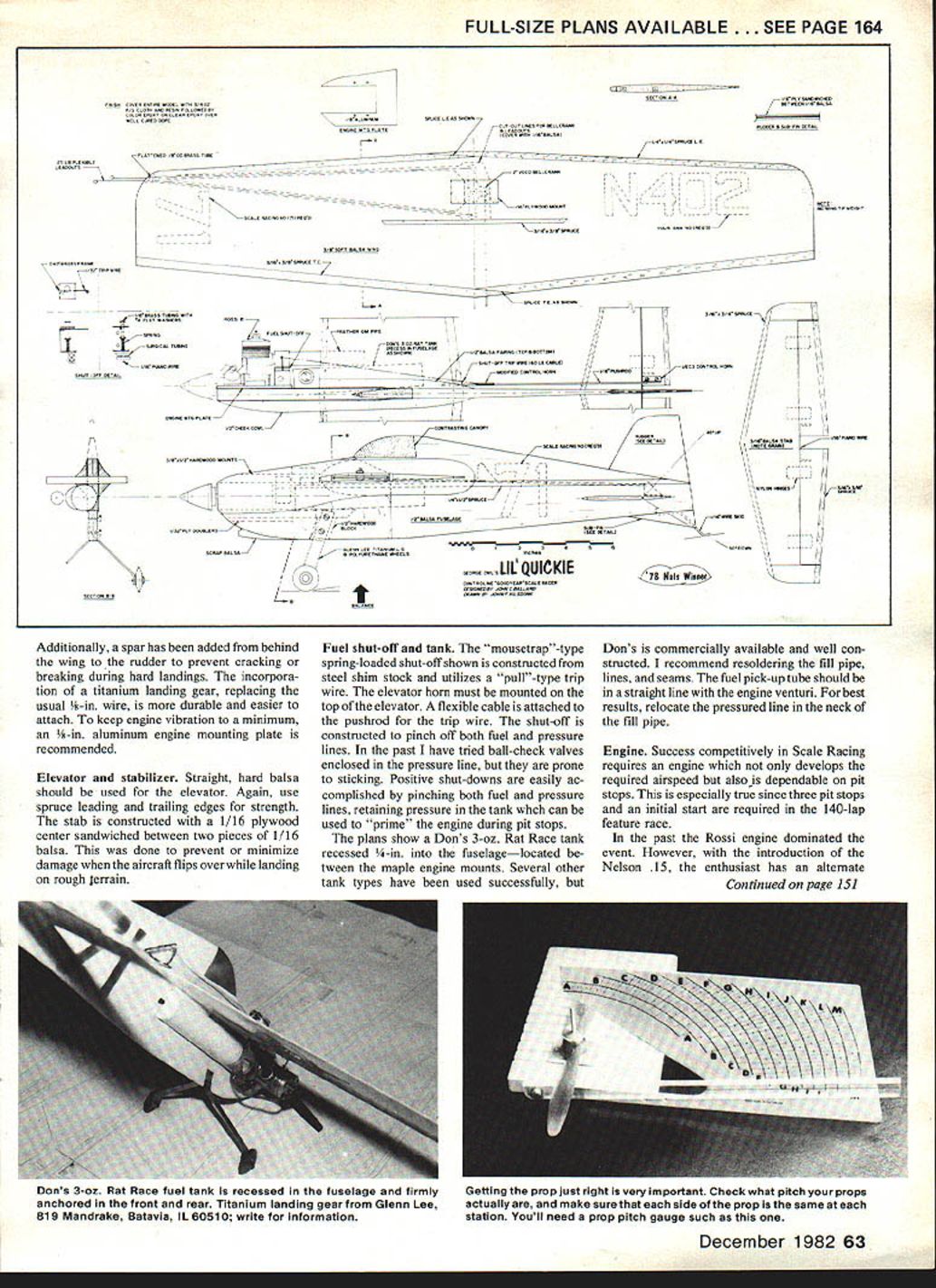71 Performance name game CL Scale Racing ones got itand enviable strings wins authors design tips can help put winners circle John Ballard COMPETITIVE PERFORMANCE Scale Racing Goodyear requires combination engine airplane pilot pit man Lii Quickie successful designs has dominated event years 1977 78 80 81 82 Racing requires airplane combines maneuverability quickness impeccable landing takeoff characteristics Lil Quickie has excellent size relationship wing body elevator addition ample fuselage area available engine fuel shut-off tank landing gear positioning performance design has enabled record record Open category Nats time 547 1978 160-lap race article intended acquaint CL Scale Racingenthusiast high-performance model incorporating latest construction tech niques competitive total system wing construction basically straight forward past have used built-up wing several failed pit man catches Ys balsa wing carved shape found best 3/16 x 4 spar necessity prevent cracking during fast shut-down Damage rocks pitting gloves can minimized utilizing spruce leading trailing edges spruce also gives wing additional rigidity study picture shows aluminum en gine mounting plate relative positioning Two crankshafts new-model Rossi fuel shut-off valve tank quick-fill upperone hasstock timing 72750 closing tanks till pipe has secured 1/16- lower has silver-soldered re wire bent form clamp timed 62-650—gives steadier running 62 Model Aviation Jfr Construction designed endure race hand ling mishandling combined ingredients fast pit stops high flight speed have put theauthors Lilauickieontopmanytimes Note flexible cable pushrod behind wing fuel shut-off trip wIre lead-out exit shown plans has found ideal Internal lines can easily installed carving hatch cover underneath side wing incorporating slotted buttons line construction Fuselage Proper selection hard straight grained -in balsa fuselage construction mandatory Ys-in fuselage traditionally has used -in stronger especially utilizing extra-long 3A x -in maple engine mounts engine fuel shut-oW tank can mounted securely long maple mounts Accurate prop balancing must highperformance modeling number choices balancing rigs balances shaft two knife-edge wheelson side FULL-SIZE PLANS AVAILABLE . SEE PAGE 164 Additionally spar has added behind wing rudder prevent cracking breaking during bard landings incorpora tion titanium landing gear replacing usual -in wire durable easier attach keep engine vibration minimum -in aluminum engine mounting plate recommended Elevator stabilizer Straight bard balsa should used elevator Again use spruce leading trailing edges strength stab constructed 1/16 plywood center sandwiched between two pieces 1/16 balsa done prevent minimize damage aircraft flips over landing rough terrain Fuel shut-off tank mousetrap-type spring-loaded shut-off shown constructed steel shim stock utilizes pull-type trip wire elevator horn must mounted top elevator flexible cable attached pushrod trip wire shut-off constructed pinch off both fuel pressure lines past have tried ball-check valves enclosed pressure line prone sticking Positive shut-downs easily ac complished pinching both fuel pressure lines retaining pressure tank whch can used prime engine during pit stops plans show Dons 3-oz Rat Race tank recessed -in fuselagelocated tween maple engine mounts Several other tank types have used successfully Dons commercially available well con structed recommend resoldering fill pipe lines seams fuel pick-up tube should straight line engine venturi best results relocate pressured line neck fill pipe Engine Success competitively Scale Racing requires engine develops required airspeed also dependable pit stops especially true since three pit stops initial start required 140-lap feature race past Rossi engine dominated event However introduction Nelson 15 enthusiast has alternate Continued page JSJ December 1982 63 1 t p080000 ~LIQIJICKIE Mats hsw Lf Dons 3-oz Rat Race fuel tank recessed fuselage firmly anchored front rear Titanium landing gear Glenn Lee 819 Mandrake Batavia IL 60510 write information Getting prop just right very important Check what pitch props actually make sure side prop same station Youll need prop pitch gauge such Aviation Road Fallbrook CA 92028 has avail able new series books called Detail Scale Series books softbound contain 73 pages chock full Scale builders details moderately priced $695 majority subjects series jet aircraft include F4 Phantom II Part II F-16 B Fighting Falcon F-Ill Aardvark F-5E F Tiger II F- 18 Hornet F-I 4A Tomcat F 105 Thunderchief two two-part books B- 17 Flying Fortress B-29 Superfortress books emphasize details generally wanted Scale modelers such cockpit interiors landing gear armament wheel wells avionics five-view scale drawings series books true Scale modeler should find extremely worthwhile Send items CL Scale Bill Boss 77-06 269 St New Hide Park NY 11040 LiIQuickie/Ballard Continued page 63 choice has proven compe titive standard Nelson 370 venturi recently introduced racing head capable outstanding performance Parts easily ob AT LAST LETE HANDBOOK ON RC HELICOPTERS Well-Known American Author Flier FOR THE AVERAGE MODELLER THIS IS THE FIRST COMPLETE HANDBOOK ON THE SUBJECT TO BE PUBLISHED IN THE USA IT COVERS THOROUGHLY HIstory 01 RC Helicopters Basic Theory Flight Descriptions Different Types Models Past Present Mechanical Design Operation Fixed Pitch Collective Pitch Bell/Hiller Mix etc Install Set Up Controls r Fly Forward Aerobatics Several Reference Sections Control Rods Fittings Metric vs American Threads Pictorial IllustratIons Helicopter Parts Pieces Publication Date mber 1982 PRE-PUBLICATION PRICE 5 AVAILABLE AT YOUR LOCAL HOBBY STORE NATIONWIDE ORDER YOUR COPIES NOW 23961 CRAFTSMAN RD CALABASAS CALIFORNIA 91302 213 9920195 SCALE DOCUMENTATIONCUSTOM FOAM WINGS d TAILS SCALt DRAWINGSPHOTOS BOOKLtTSCUSTOM SAILPLANE WINGSd TAILS LA MODtL PLANSSPRAY ADHESIVES 1982ZnK.LFIBERGLASS FUSELAGES AIRPL