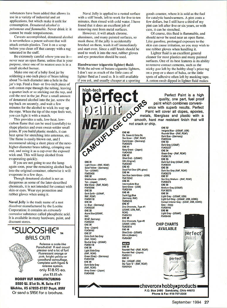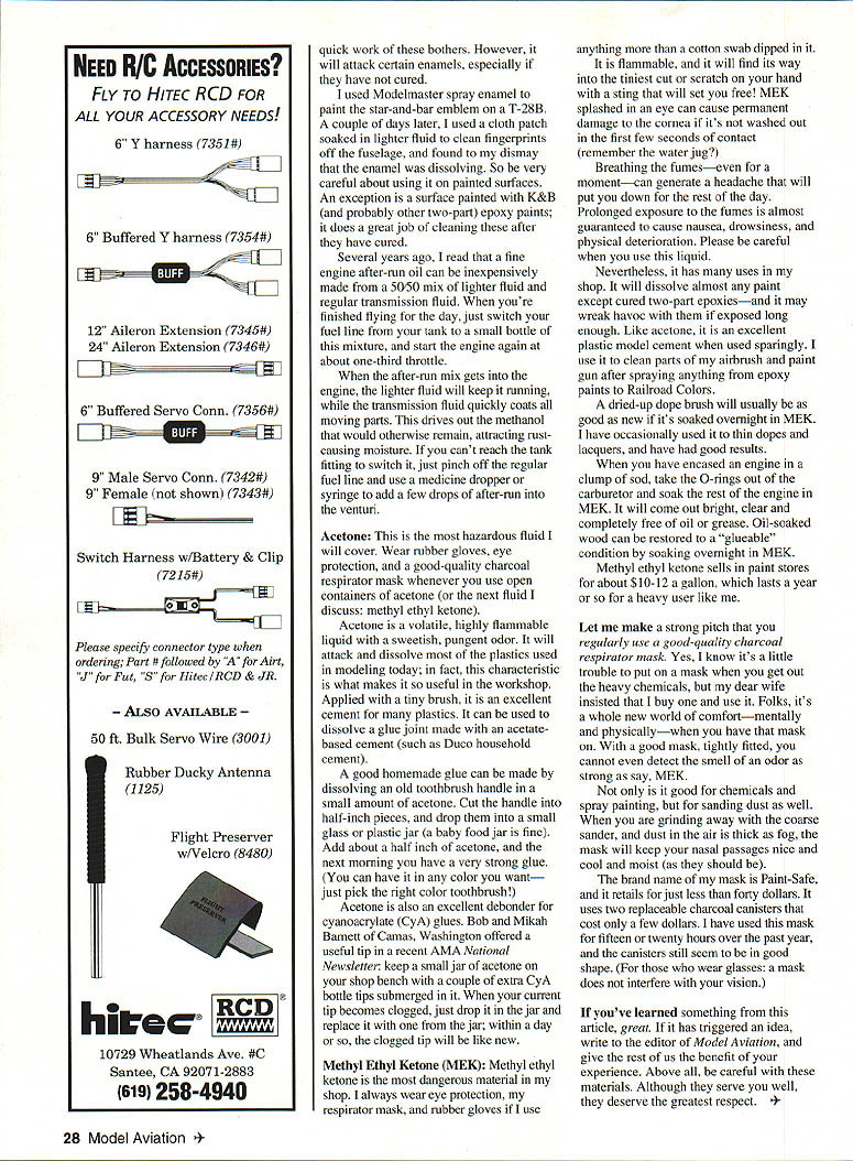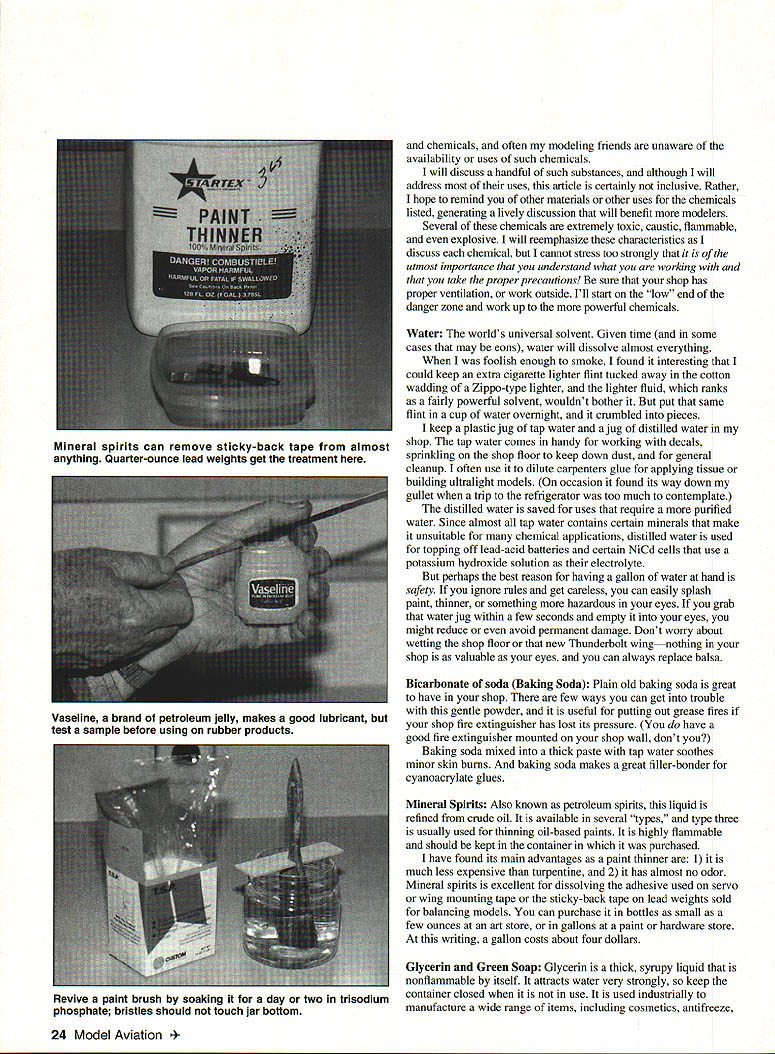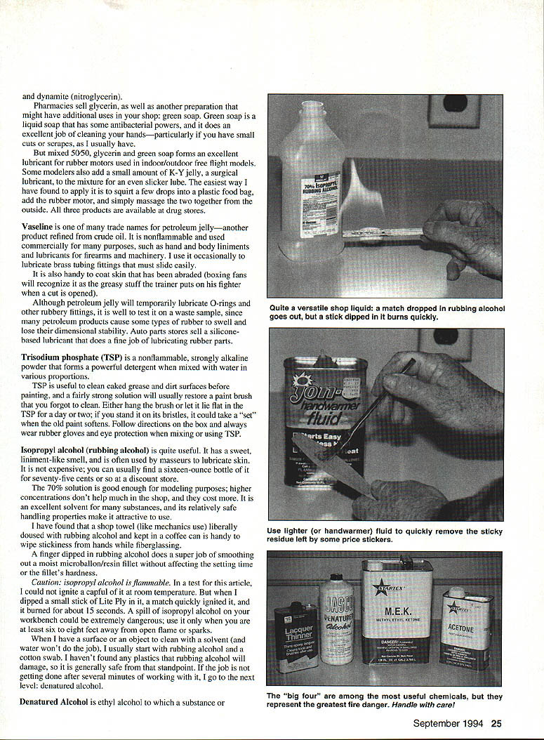 A Chemi Workshop U Graham Hicks t seems hangar talk frequently produces new better ways doing things During particularly productive recent discussion occurred during 45 years model building have found uses half-a-dozen liquids author wears safety gear apron rubber gloves goggles charcoal respirator mask Photos Clint Croghan author September 1994 23 chemicals often modeling friends unaware availability uses such chemicals will discuss handful such substances although will address uses article certainly inclusive Rather hope remind other materials other uses chemicals listed generating lively discussion will benefit modelers Several chemicals extremely toxic caustic flammable explosive will reemphasize characteristics discuss chemical cannot stress too strongly utmost importance understand what working take proper precautions sure shop has proper ventilation work outside Ill start low end danger zone work up powerful chemicals Water worlds universal solvent Given time some cases may eons water will dissolve almost everything foolish enough smoke found interesting could keep extra cigarette lighter flint tucked away cotton wadding Zippo-type lighter lighter fluid ranks fairly powerful solvent wouldnt bother put same flint cup water overnight crumbled pieces keep plastic jug tap water jug distilled water shop tap water comes handy working decals sprinkling shop floor keep down dust general cleanup often use dilute carpenters glue applying tissue building ultralight models occasion found its way down gullet trip refrigerator too much contemplate distilled water saved uses require purified water Since almost tap water contains certain minerals make unsuitable chemical applications distilled water used topping off lead-acid batteries certain NiCd cells use potassium hydroxide solution electrolyte perhaps best reason having gallon water hand safety ignore rules get careless can easily splash paint thinner something hazardous eyes grab water jug within few seconds empty eyes might reduce avoid permanent damage Dont worry about wetting shop floor new Thunderbolt wingnothing shop valuable eyes can always replace balsa Bicarbonate soda Baking Soda Plain old baking soda great have shop few ways can get trouble gentle powder useful putting out grease fires shop fire extinguisher has lost its pressure have good fire extinguisher mounted shop wall dont Baking soda mixed thick paste tap water soothes minor skin burns baking soda makes great filler-bonder cyanoacrylate glues Mineral Spirits Also known petroleum spirits liquid refined crude oil available several types type three usually used thinning oil-based paints highly flammable should kept container purchased have found its main advantages paint thinner 1 much less expensive turpentine 2 has almost no odor Mineral spirits excellent dissolving adhesive used servo wing mounting tape sticky-back tape lead weights sold balancing models can purchase bottles small few ounces art store gallons paint hardware store writing gallon costs about four dollars Glycerin Green Soap Glycerin thick syrupy liquid nonflammable itself attracts water very strongly keep container closed use used industrially manufacture wide range items including cosmetics antifreeze 24 Model Aviation ral spirits can remove sticky-back tape almost anything Quarter-ounce lead weights get treatment Vaseline brand petroleum jelly makes good lubricant test sample before using rubber products Revive paint brush soaking day two trisodium phosphate bristles should touch jar bottom dynamite nitroglycerin Pharmacies sell glycerin well another preparation might have additional uses shop green soap Green soap liquid soap has some antibacterial powers does excellent job cleaning handsparticularly have small cuts scrapes usually have mixed 5Q50 glycerin green soap forms excellent lubricant rubber motors used indoor/outdoor free flight models Some modelers also add small amount K-Y jelly surgical lubricant mixture slicker lube easiest way have found apply squirt few drops plastic food bag add rubber motor simply massage two together outside three products available drug stores Vaseline trade names petroleum jellyanother product refined crude oil nonflammable used commercially purposes such hand body liniments lubricants firearms machinery use occasionally lubricate brass tubing fittings must slide easily also handy coat skin has abraded boxing fans will recognize greasy stuff trainer puts fighter cut opened Although petroleum jelly will temporarily lubricate 0-rings other rubbery fittings well test waste sample since petroleum products cause some types rubber swell lose dimensional stability Auto parts stores sell siliconebased lubricant does fine job lubricating rubber parts Trisodium phosphate TSP nonflammable strongly alkaline powder forms powerful detergent mixed water various proportions TSP useful clean caked grease dirt surfaces before painting fairly strong solution will usually restore paint brush forgot clean Either hang brush let lie flat TSP day two stand its bristles could take set old paint softens Follow directions box always wear rubber gloves eye protection mixing using TSP Isopropyl alcohol rubbing alcohol quite useful has sweet liniment-like smell often used masseurs lubricate skin expensive can usually find sixteen-ounce bottle seventy-five cents discount store 70% solution good enough modeling purposes higher concentrations dont help much shop cost excellent solvent substances its relatively safe handling properties make attractive use have found shop towel like mechanics use liberally doused rubbing alcohol kept coffee can handy wipe stickiness hands fiberglassing finger dipped rubbing alcohol does super job smoothing out moist microballon/resin fillet affecting setting time fillets hardness Caution isopropyl alcohol flammable test article could ignite capful room temperature dipped small stick Lite Ply match quickly ignited it burned about 15 seconds spill isopropyl alcohol workbe