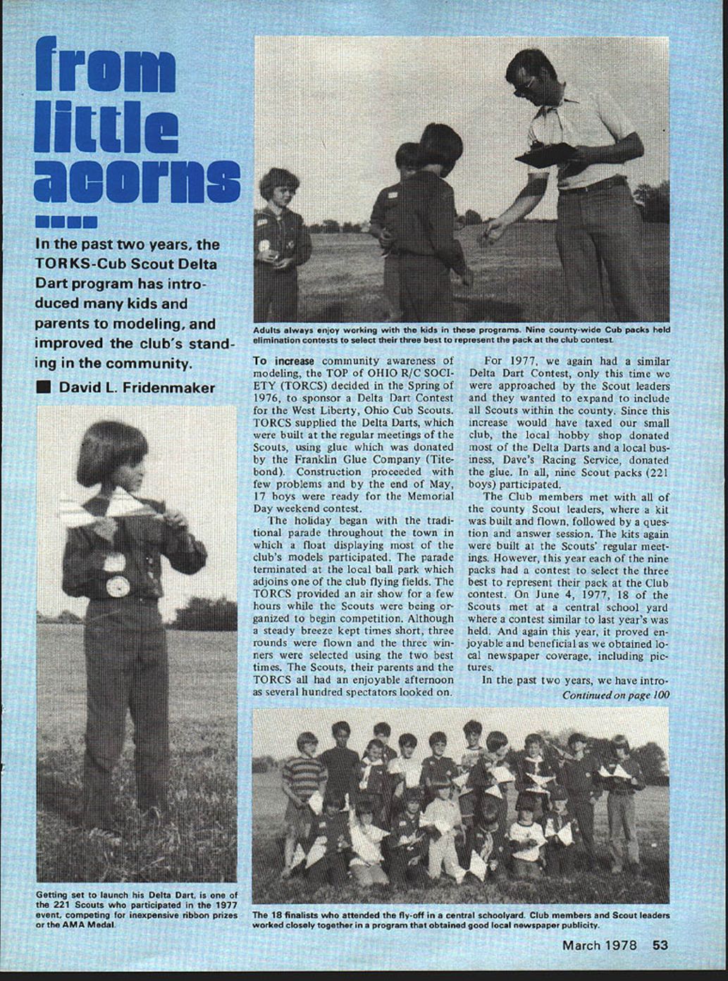 g Wa select thol inity f OH Lded fl1t0 Deltas1nc egular meeflop wida 3lue Con n proc end dy est Ut thi playing ticipated local ball club flying iiei n air show fo outs impetition t times sho th using heir pareni njoyable ctators lo{ all-important storage envelope using envelope record data about motor store motor between flights Stan assured can eliminate unknowns pre dict model performance quite well contest has lost because wrong motor used critical time Bud Tenny Box 545 Richardson TX 75080 FF Old-Timer/Haught continued page 52 type spark plug test engine like its sisters has run Herb required breaking After mounting engine stand filled tank recommended 4to-i fuel mixture unleaded gasoline SAE 70 oil Brown long stroke high torque engine normally swings 14-inch prop 6 8 pitch prop sup ply included 12- 13- 14-inch props following usual practice breaking engine light propeller load bolted 12-6 engine hand started easily after clocking three revolutions using Herbs recommended needle setting 2 turns instruction sheet calls short initial runs 5 10 seconds followed cool ing period since engine very tight found engine would run about 15 seconds stopping its own after couple tanks engine would con tinue run until fuel exhausted ran suggested ten tanks through engine rich settings before taking rpm reading tached engine 6400 rpm 12-6 Powerprop 13-5 Rev Up gave same reading final run 14-5 Rev Up indicated 6100 rpm tests run within 20 minutes ele vation 2150 feet temperature 500 F Part breaking-in done evening Flame exhaust parts suggested potential fire hazard closely cowled installations fact no doubt con tributing development accessory exhaust stacks Herb also has avail able did notice two minor faults engine First no built-in rachet sys tem prevent needle valve setting change vibration problem exist ed original Brown solved installing short piece fuel tubing tween needle valve proper needle valve body second item relation sharp edge cam cut prop drive washer scraping movable point could readily corrected stoning slight radius edge cam cut As engine belonged Herb did anything about very good engine good smooth power ease handling Herb also manufactures stocks complete line accessories ignition engines well made-to-order Hurle man engines both singles twins Herbs catalog nice addition library included appropriate cartoons Better get waiting list can fly Bud McNorgans contest next year Very First Thermal Central Indiana Aeromodelers CIA Informer Magazine editorialists remind us now first thermal resulting thrill derived therefrom Well too long ago remember saw young Don Jenkins get first max O&R 23 Playboy Jr last Sun day will remember scene year. now acne gone 5 oclock Clarence Haught Rt 5 Box 16 Coeur dAlene ID 83814 Acorns/Fridenmaker continued page 53 duced people both kids par ents modeling improved clubs standing within community great time doing Scouts have fun building flying Scout leaders have welcomed activi ties kids didnt have invest time planning prizes given just inexpensive ribbons pur 100 Model Aviation chased Scout supply stores pack contest AMA Medal set Club contest Scout parents proud six-foot trophy club wishing foster com munity acceptance would recom mend approaching local Scout groups may several kids potential future club members parents usually community leaders helps obtain keep flying sites minimize complaints etc doesnt take great deal money time Scouts great bunch kids work larger scale may beneficial AMA leadership investigate Scout modeling program national level PR program aimed age group would certainly fit AMAs Youth Program Scout hundred hooked models return would well worth invest ment R ocketeer Lid berg continued page 56 tate plastic windshield side windows after doping completed Mount engine timer wheels nearly ready fly Some photos show model Trexler air wheels wheels looked just right first test glide resulted blow out first landing powered flight took care other wheel Admit tedly Arizona boondocks must se vere test wheels model now has pair Williams l/4 wheels work nicely ROGs Details Add stabilizer platform incidence block hold down dowels wing stab type dether malizer set-up puts fuse closer CG avoiding trim upsets between long short fuses hooks line guide made pieces small paper clip wire snuffler tube also serves hold fuse get hold down rubberband hooked up Assemble model check balance point making sure its near indicated location Before going out fly check wing stab warps steam out necessary steam available put about 3/32 wash-in left main wing panel leading edge up 3/32 keep left wing up climb Try some test glides adding bit file card stock plywood scraps under front rear stab necessary Right turn glide preferable due natural left-turn-under-power tendency cabin model Offsetting portion upper fin should help open up climb turn establish right glide turn Initial power flights done near full power very short runs As get climb glide pat terns sorted out engine runs can made longer sure try some ROGs get feel effects wind speed direction Set up described model leaves ground foot two lays over about 100 left bank spirals up extremely tightly left engine cuts transition right glide occurs little fuss no loss altitude Some tips getting the 020 engine Use Cox Racing Fuel hotter mix Try running engine out head gasket Take time get needle valve setting just rightset nose pointing up 3040o Cornpared 20-second run allowed replica old-timers theres lot fuel available ground adjustments engine run consistent look air leakage needle valve spring can stretched little help seal needle hope enjoy Rocketeer rep lica much An older modeler told thought replica flew better full-scale version After thinking about statement decided check out wing loadings both models full size version weighed 18 oz wing loading 762 oz/sqft replica 5/4 oz has wing loading 473 oz/sq ft writing advertisers mention read about MA March 1978 101 COLORSBrushing Spray choice Hi-Gloaa Metallic F