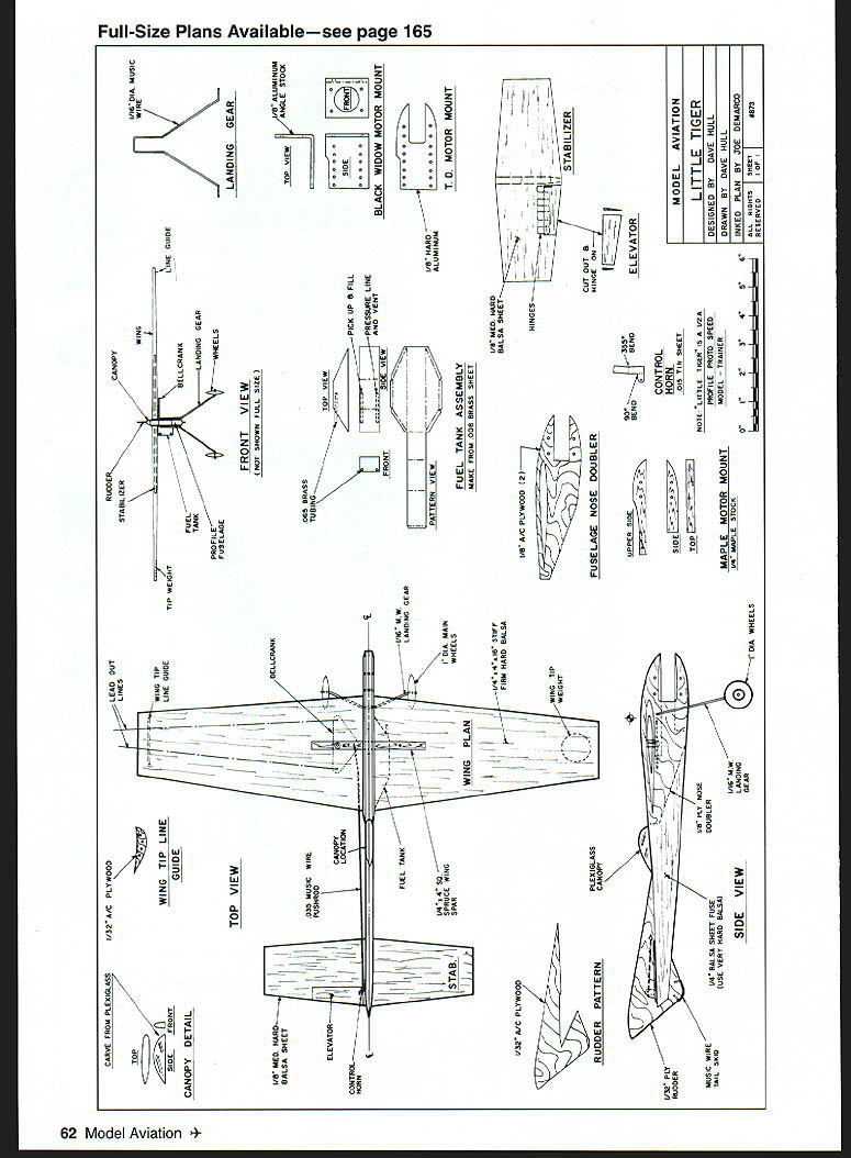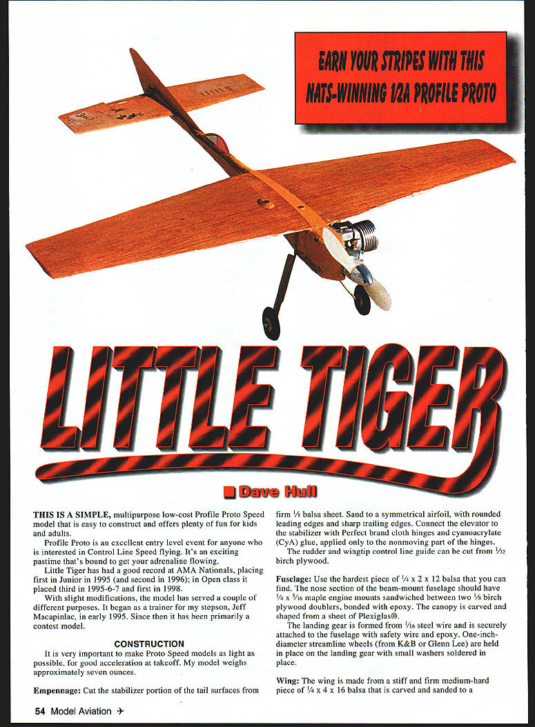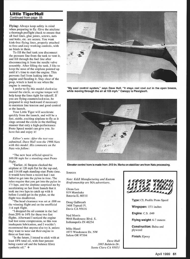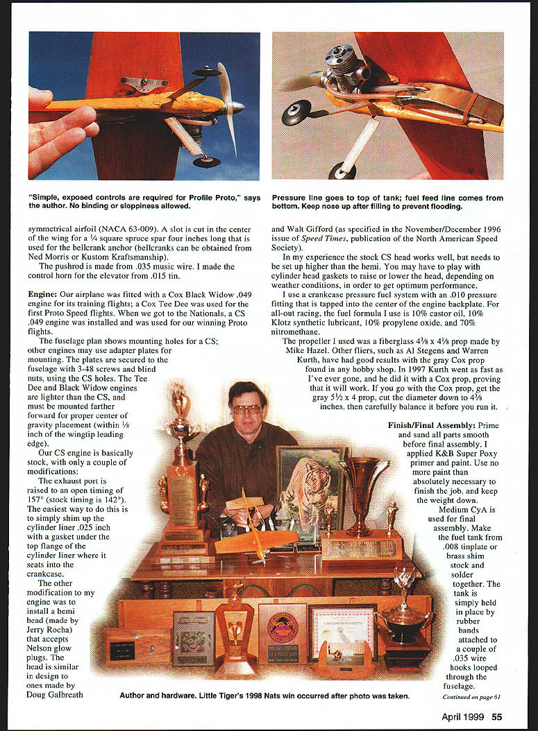 THIS IS SIMPLE multipurpose low-cost Profile Proto Speed model easy construct offers plenty fun kids adults Profile Proto excellent entry level event anyone interested Control Line Speed flying Its exciting pastime thats bound get adrenaline flowing Little Tiger has good record AMA Nationals placing first Junior 1995 second 1996 Open class placed third 1995-6-7 first 1998 slight modifications model has served couple different purposes began trainer stepson Jeff Macapinlac early 1995 Since has primarily contest model CONSTRUCTION very important make Proto Speed models light possible good acceleration takeoff model weighs approximately seven ounces Empennage Cut stabilizer portion tail surfaces firm /8 balsa sheet Sand symmetrical airfoil rounded leading edges sharp trailing edges Connect elevator stabilizer Perfect brand cloth hinges cyanoacrylate CyA glue applied nonmoving part hinges rudder wingtip control line guide can cut A2 birch plywood Fuselage Use hardest piece x 2 x 12 balsa can find nose section beam-mount fuselage should have x /16 maple engine mounts sandwiched between two 1/8 birch plywood doublers bonded epoxy canopy carved shaped sheet Plexiglas landing gear formed A6 steel wire securely attached fuselage safety wire epoxy One-inch diameter streamline wheels K&B Glenn Lee held place landing gear small washers soldered place Wing wing made stiff firm medium-hard piece x 16 balsa carved sanded 54 Model Aviation etrical airfoil NACA 63-009 slot cut center wing re spruce spar four inches long used belicrank anchor bellcranks can obtained Ned Morris Kustom Kraftsmanship pushrod made 035 music wire made control horn elevator 015 tin Engine airplane fitted Cox Black Widow 049 engine its training flights Cox Tee Dee used first Proto Speed flights got Nationals CS 049 engine installed used winning Proto flights fuselage plan shows mounting holes CS other engines may use adapter plates mounting plates secured fuselage 3-48 screws blind nuts using CS holes Tee Dee Black Widow engines lighter CS must mounted farther forward proper center gravity placement within 1/ inch wingtip leading edge CS engine basically stock couple modifications exhaust port raised open timing 1570 stock timing 1420 easiest way to simply shim up cylinder liner 025 inch gasket under top flange cylinder liner seats crankcase other modification engine install hemi head made Jerry Rocha accepts Nelson glow plugs head similar design ones made Doug Galbreath Walt Gifford specified November/December 1996 issue Speed Times publication North American Speed Society experience stock CS head works well needs set up higher hemi may have play cylinder head gaskets raise lower head depending weather conditions order get optimum performance use crankcase pressure fuel system 010 pressure fitting tapped center engine backplate all-out racing fuel formula use 10% castor oil 10% Klotz synthetic lubricant 10% propylene oxide 70% nitromethane propeller used fiberglass 43/s x 41/g prop made Mike Hazel Other fliers such Al Stegens Warren Kurth have good results gray Cox prop found hobby shop 1997 Kurth went fast Ive ever gone did Cox prop proving will work go Cox prop get gray 5 /2 x 4 prop cut diameter down 43/s inches carefully balance before run Finish/Final Assembly Prime sand parts smooth before final assembly applied K&B Super Poxy primer paint Use no paint absolutely necessary finish job keep weight down Medium CyA used final assembly Make fuel tank 008 tinplate brass shim stock solder together tank simply held place rubber bands attached couple 035 wire hooks looped through fuselage Continued page 6] April 1999 55 Simple exposed controls required Profile Proto says Pressure line goes top tank fuel feed line comes author No binding sloppiness allowed bottom Keep nose up after filling prevent flooding Author hardware Little Tigers 1998 Nats win occurred after photo taken Little TigerIHull Continued page 55 Flying Always keep safety mind preparing fly Give airplane thorough preflight check ensure fuel lines glue joints screws nuts bolts etc secure want kink-free flying lines properly attached free-and-easy working controls no binds fill fuel tank disconnect pressure line tank vent fill through fuel line after disconnecting needle valve assembly After filling tank like keep nose airplane pointed up until its time start engine prevents fuel leaking engine flooding Stay clear prop hard see engine running prefer fly model clockwise around circle engine torque will help keep lines tight takeoff flying counterclockwise prepared step backward necessary maintain line tension good control launch Little Tiger will accelerate quickly launch will fast stable exciting airplane fly zings around circle thrilling manner high-performance Proto Speed model can give So have fun enjoy Editors note After text submitted Dave Hull won 1998 Nats model comments Nats win follow new best official speed 10998 mph standing-start Proto flight Earlier Al Stegens clocked airplane 120 mph flat top end 11468 mph standing-start Proto time would have record failed get pylon time rules require get pylon 1 laps airplane surprised accelerating fast launch took two laps catch up before could get pylon flight disallowed head clearance set 008 winning flight unofficial 114 mph flight dropped oil content fuel 20% 14% two fast flights Afterward noticed engine lost some compression inadequate lubrication wouldnt recommend anyone else try unless want wear out engine three four runs future intend stick least 18% total oil four percent being castor oil balance Klotz synthetic oil 4Note K&B Manufacturing Kustom Kraftsmanship MA advertisers Glenn Lee 819 Mandrake Batavia IL 60510 Doug Galbreath 3408 Topsail P1 Davis CA 95616 Ned Morris 9044 Rushmore Blvd S Indianapolis IN 46234 Mike Hazel 1073 Windemere Dr NW Salem OR 97304 Dave Hull 3885 Baldwin Dr Santa Clara CA 95051 April 1999 61 coal control system says Dave Hull stays real cool out open breeze moving through air 105 mph 
