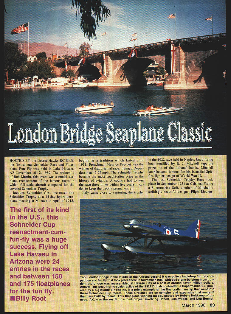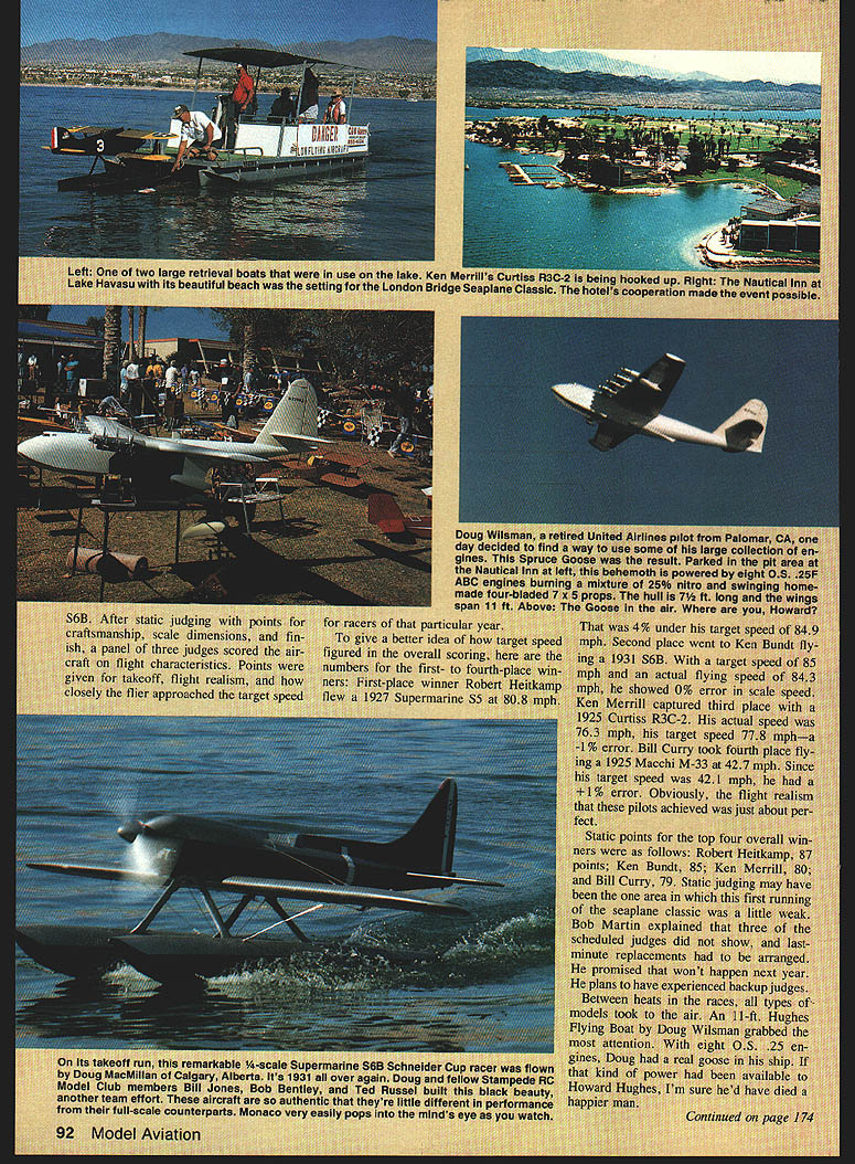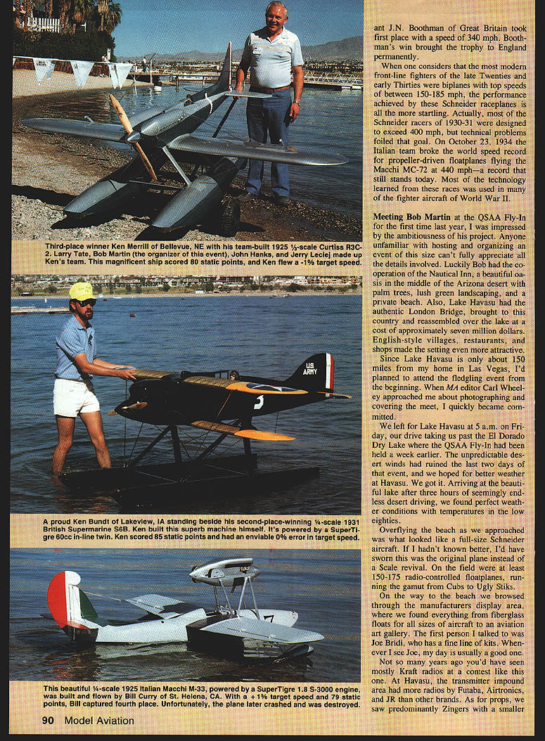 NO OCR TEXT N win brougnt oently Len OflC consid line fighters Thirties tween 150-18 iea e arive week ee dls U Wego after dire ions wiul ring b looked Ihada vival radio-a gamut luzo NO OCR TEXT ic judgin1 scale dim three ji aracter fli2ht e Ken U xi BrIdg4 partici er idea VCral] s e first n Upermari S achic sfor area Inc claw Performance Specialties owned operated World Pylon Racing Champion Dave Shadel customize maintain majority high performance engines used todays racing enthusiasts addition work racing engines also repair customize 05 Supertigre engines well providing warranty service repairs Bob Violeti Models KBV 72 82 complete line Webra engines custom engines used some top aerobatic racing pilots world interested World Class performance please contact us weekday between 10 am 5 pm West Coast time Well look forward hearing Please send $100 descrIptive brochure Visa & Mastercard accepted Aircraft Racing Headquarter6 PERFORMANCE SPECIALTIES Custom ABC Piston / Cylinder Assemblies True Chrome Plating Higher Performance & Longer Wear hrjbmuameSpecutiu QWJIW RADIO CON5I MOOLtE Available K&B 65 75 05 40 VFNRP 05 61 FSR 05 61 VF 0S Long Stroke 61 Rossi 40 65 81 Supertigre X-40 YS 60 FS/FR YS Long Stroke Others Coming Soon Performance Specialties PO Box 4003 Carlsbad CA 92008 619 729-1658 3 down4down5 down down6 down7down8down9down 10 downdown1 1down12down13 down 14down 15down down 16 down 17down18down19down20 down down2 1 down22rtn sa-F1 Comments Enter places sa-S executes open-Apple-F find C coordinates open-Apple-Y clear end line AY8 Cell AW8 first placing return open-Apple-B blank open-Apple9 end file return inserts place numbers 1 22 returns cell AW8 highest score Macro Tlrtnl 23/3rtn oa-LEVFOrtn oa-U right Comments Flight entry Col S-AR sa-T similar sa-G except three judges provided typically single-digit data Macro sa-F sa-B sa-E sa-S Comments CaIc find AW8 sort space place enitnuier us D Scratctt SOUARE CUT Tools will save time Remove stubborn die cuts cut own squares slots Made US quality machined nickel plated steel Order set today See Dealer Cataloger Order hf dont carry Square Cut Tools call tar call well pay shipping us Canadal C 0 0 totral SQUARE CUT Toals N Harbor City Blvd Melbourne FL 32935 Deulea/Dimtributer Inquirim Invited Florida Residents Add 6% Sales Tao sa utes open-Apple-K calculate sa-F go AW8 sa-B sort high top sa-E insert blank lines sa-S enter placings Macro Coa-YA1 rtnI Comments Home Al sa- executes open-Apple-F find C coordinates open-Apple-Y clear end line Al Cell Al top left spread sheet return Schneider Race/Root Continued page 92 Doug Wilber Cliff Adams Bo Limon gave fine formation flying demonstra tion Nutten Specials smoking away pilots made look easy course isnt Formation flying difficult feats Radio Control Bob Martin seems have thought everything two large retrieving boats ready go action young man scuba diving gear case anything sank bottom lake Thats exactly what happened Saturday Richard Pasquelittos Red Macchi MC-72 got lost sun crashed Macchi totally destroyed scuba diver no luck retrieving its costly Sachs Dolmer 42 two-cycle engine lake bottom Besides Pasquelittos Macchi two other crashes Saturday QSAA teams Sopwith Tabloid aileron servo failure Bill Currys fourth-placewinning Macchi M-33 went down after ra dio problems Having good fortune live area nine 10 months year bring great flying weather Ive attended variety conteststhe Scalemasters Tour nament Champions meets Eighth Air Force Fly-Ins Phoenix SAM Free Flight Championships QSAA Fly-Ins Schneider Seaplane Classic Races shows promise becoming yet another world-class meet western contest circuit Expecting least 40 entries next year Bob Martin plans let 415 342 5581 GOLDEN GATE HOBBIES PO BOX 282005 SAN FRANCISCO CA 94128 M/C OR COD CATALOG $ 200 OR FREE Will-I ORDERS HATORI BLUEPRINT SHOWS ALL EXHAUST ITEMS FULL SIZE 2FT X 4fT $ 5 HA TORT RA DIGICON IM-MSK WE NEED__________ ___________DEALERS 174 Model Aviation can make Quiet. VIBRA-DAMP BEAMS VIBRA-DAMP ALUM TABS HUSH FOAM DISC-LOCKS Send $1 complete brochure order direct PERFORMANCE PRODUCTS UNLIMITED / 7093 E Dodge Rd Mt Morris Ml 48458 313 631-4894 VISA/MO C 6 863 1225 C MONDAY-FRIDAY 86 I-800-FOR WA L Torders onlyWeekends Chance CHARGER MKII4ODLXBB FOX ENGINE SPECIALS 450LX B B6399$4299 a/mafI & spnne6699 OODLXBB w maIt&spnner7399 60 Eagle IV w/nuII9499 $6499 60 Eagle IV ABC w nuII9999 74 Eagle ABC w r,uII10999 C Span 60 5/2-Ibs Power 35-50 CPants OptI $549C F796minEpoxy Cqf- 5-az-$425 C 700*77-lOoz-$599 C l6oz-$875 C PECIAL $ Power 50-90 2-cycle 99C 7 t Span 60 7-lbsPACKS Cor 60-120 4-cycle Pants Optl $549KIT ASSEMBLY __________________OR WHAT 2 whls 6-azC C SCALE KITStank 2 pk #64 rubber bands 6fuel lineglassmotormt14 Miss Los Angeles B-2pk hinges 5/32 collars C C $14999 lakeCHARGER MKII 2/a whls 4 Marquart Charger OR WHAT200/n Off Floats12-oz tank 3 fuel line 5/32 VFloats Optionalcollars 1 pk hinges whi pantsC C $399936 bs8a $2399 Span 60 5-lbs Power 29-45 2 $2879NOVI 2 whls 3 fuel line glass motor mt 1 pk hinges Cor 40-60 4-cy.1mountrnghdw Includedwhl pants 10-oz tankC Send $100 latest catalogFREE water rudder kit floats NEW ACCESSORIESTERMSMC/VIsa C C0 PROPS 10-6 $149 11-7 & 11-7 $159 12-6 $225 13-6 $299Hndlg L4laIt Moucha EifodelsMaster Air Screw Spinner 2 dia black red ..... $399COD $35 CPO Box 112 0 Menominee M 49858PrIces Subject change noticeMlres add 4% Tax C •CCCCCCCCCCCCCCCCCCCCC Schneider races stand alone fun fly Im sure 1990 meet will prove fantastic years expect see Schneider races dupli cated other parts country pos sibly over world second astronaut put foot surface moon must have felt tremendous pride what hed accomplished Try may though cant remember name Lake Havasu Schneider classic will always remembered first hunch correct may day come thought finest well NMPRA Champs/Hager Continued page 100 Richard flew against Dave Shadel heat two Daves slowest time whole con test 113 1119 slowest Sunday smoke cleared Dav