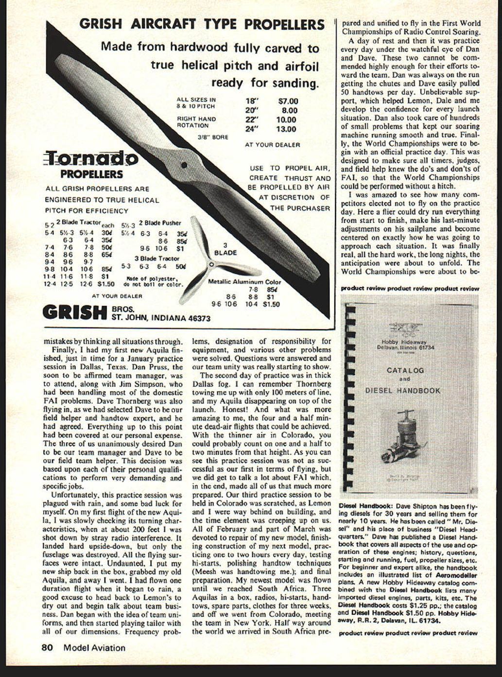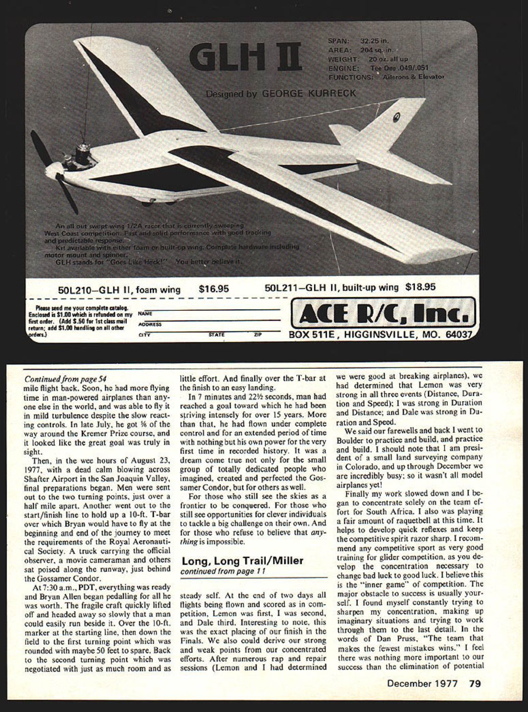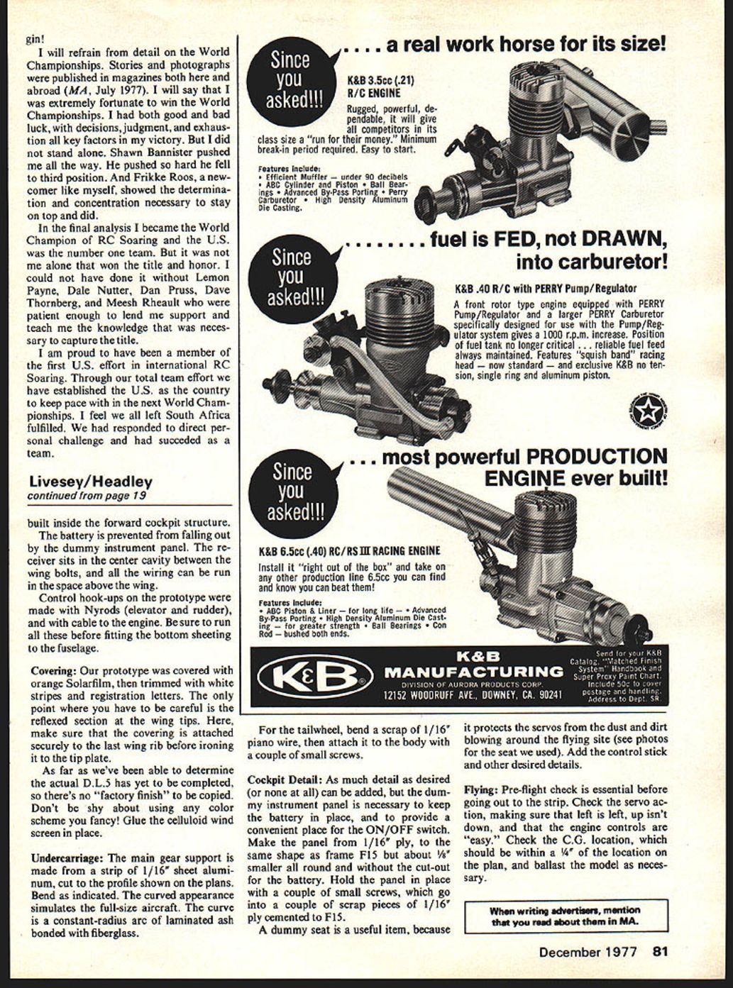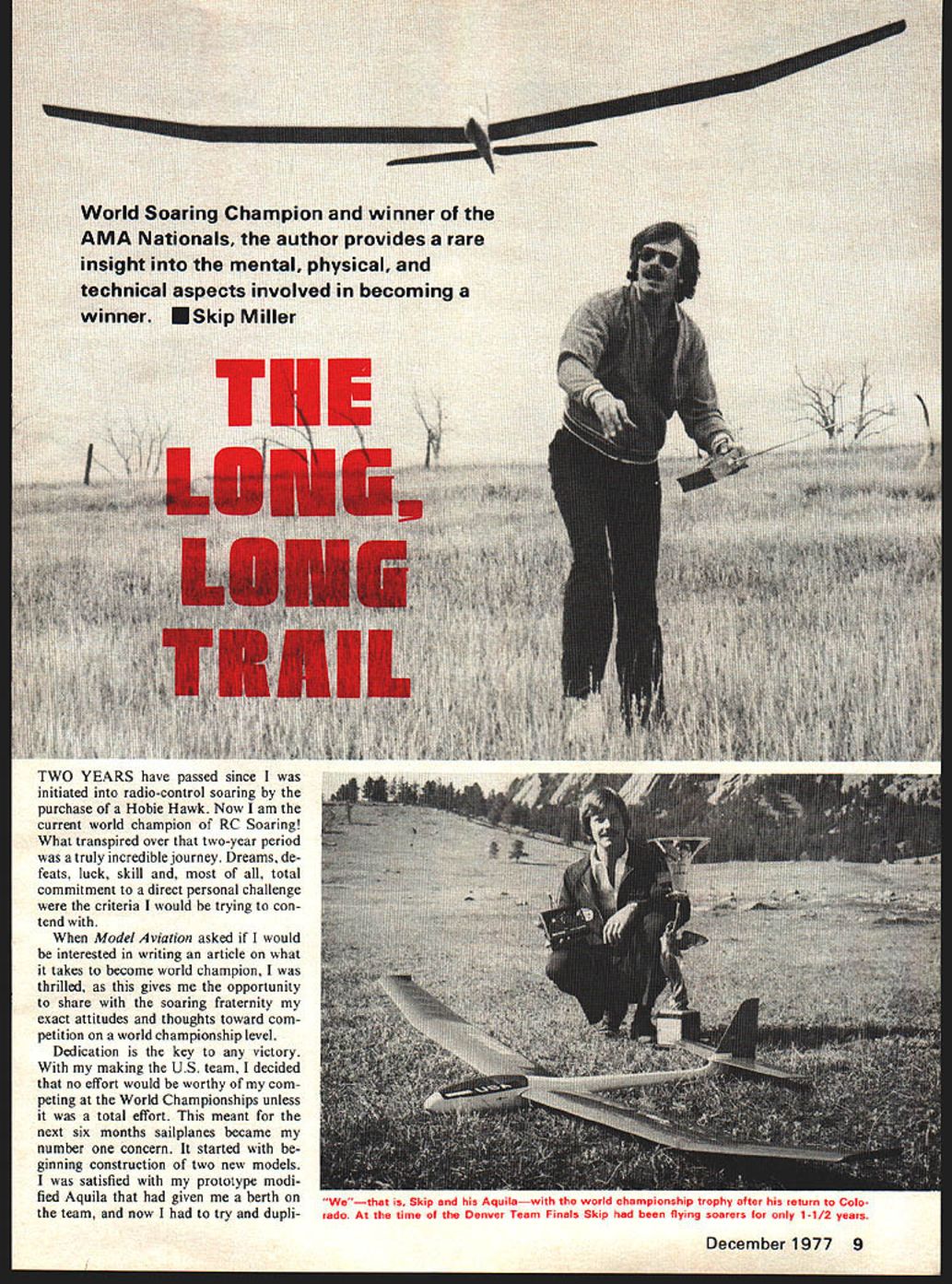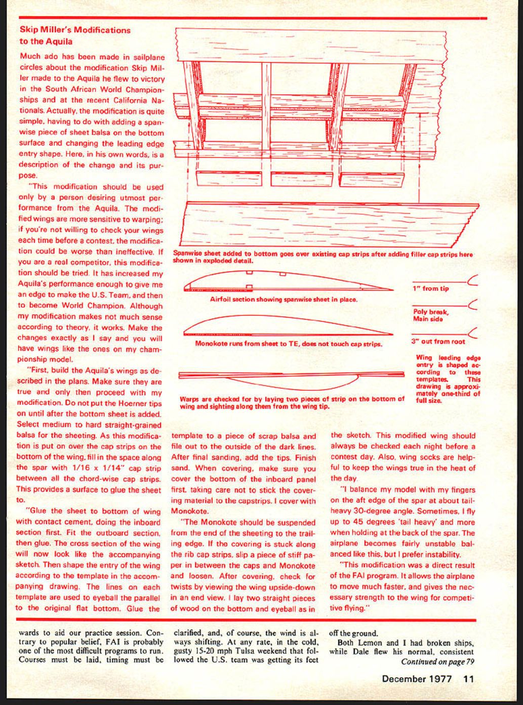 a Two YEARS have passed since initiated radio-control soaring purchase Hobie Hawk Now am current world champion RC Soaring What transpired over two-year period truly incredible journey Dreams de feats luck skill total commitment direct personal challenge criteria would trying con tend Model Aviation asked would interested writing article what takes become world champion thrilled gives opportunity share soaring fraternity exact attitudes thoughts toward com petition world championship level Dedication key victory making US team decided no effort would worthy com peting World Championships unless total effort meant next six months sailpianes became number concern started ginning construction two new models satisfied prototype modi fied Aquila given berth team now try dupli December 1977 9 U Wethat Skip Aquilawith world championship trophy after return Colo rado time Denver Team Finals Skip flying soarers 1-1/2 years cate model straining get identi cal model built before anything happened existing prototype Let clarify point Aquilas have slight ly modified airfoil given birth two days before FAI finals Den ver gambling modification would fact allow Aquila move Releasing Aquila its innumerable practice flights Skip virtually lived sailplsnes six month preparation period big event Pretoria Action pix Charles Wendt heading shot Cox bit faster stock Aquila also give strength necessary hold up rigorous speed run achieved sheeting bottom wing back main spar carving some Phillips Entry leading edge did wing panel flew stock panel other side fortunate because no trim changes necessary knew airfoil faster no longer flat bottom As time went corresponding Lemon Payne Dale Nutter telephone fairly frequently As little half years total soar ing experience would constantly pick brains pertaining FAI competition model design con struction Sometime October Dale called started ball rolling toward what led three structured practice sessions idea team effort starting emerge first practice ses sion slated Noveber Tulsa Oklahoma Dales home flying down Colorado Lemon driving Texas step necessary preparation World Champion ships model box would hold three complete ready-to-fly Aquilas reasonably portable could transport field also able safely undergo air travel risking models main ad vantage see dont have worry about damage models correctly built box Although finished first new model pro ceeded stash old Aquila original Hobie Hawk new box Meesh flew Tulsa teams first practice session flying much time building spare time first practice session went very well Mem bers Tulsoar club bent over back10 Model Aviation American team Lemon Payne Dale Nutter author held important practice sessions Tulsa Dallas attended Team Man ager Dan Pruss Jim Simpsoti handling domestic FAI mat ters Dave Thornberg hand tower nonpareil Nosing its pilots waiting hand Aquila flown Miller wing modification made two days before Team Finals last-minute change daring gamble make ship move bit faster stock Aquila beef up structure rigorous speed runs Skip Millers Modifications Aquila Much ado has made sailplane circles about modification Skip Mil ler made Aquila flew victory South African World Champion ships recent California Na tionals Actually modification quite simple having adding spanwise piece sheet balsa bottom surface changing leading edge entry shape own words description change its pur pose modification should used person desiring utmost per formance Aquila modi fied wings sensitive warping youre willing check wings time before contest modifica tion could worse ineffective real competitor modifica tion should tried has increased Aquilas performance enough give edge make US Team become World Champion Although modification makes much sense according theory works Make changes exactly say will have wings like ones cham pionship model First build Aquilas wings de scribed plans Make sure true proceed modification put Hoerner tips until after bottom sheet added Select medium hard straight-grained balsa sheeting As modifica tion put over cap strips bottom wing fill space along spar 1/16 x 1/14 cap strip between chord-wise cap strips provides surface glue sheet Glue sheet bottom wing contact cement doing inboard section first Fit outboard section glue cross section wing will now look like accompanying sketch shape entry wing according template accom panying drawing lines template used eyeball parallel original flat bottom Glue 1/ ~jitTt ___I _____ II IIii / Spanwise sheet added bottom goes over existing cap strips after adding filler cap strips shown exploded detail Airfoil section showing spanwise sheet place Monokote runs sheet TE does touch cap strips Warps checked laying two pieces strip bottom wing sighting along wing tip template piece scrap balsa file out outside dark lines After final sanding add tips Finish sand covering make sure cover bottom inboard panel first taking care stick cover ing material capstrips cover M onokote Monokote should suspended end sheeting trail ing edge covering stuck along rib cap strips slip piece stiff pa per between caps Monokote loosen After covering check twists viewing wing upside-down end view lay two straight pieces wood bottom eyeball K 1 tip Poly break Main side K 3 out root Wing leading edge entry shaped ac cording templates drawing approxi mately one-third full size sketch modified wing should always checked night before contest day Also wing socks help ful keep wings true heat day balance model fingers aft edge spar about tailheavy 30-degree angle Sometimes fly up 45 degrees tail heavy holding back spar airplane becomes fairly unstable bal anced like prefer instability modification direct result FAI program allows airplane move much faster gives nec essary strength wing competi tive flying wards aid practice session Con trary popular belief FAT probably difficult programs run Courses must laid timing must clarified course wind al ways shifting rate cold gusty 15-20 mph Tulsa weekend fol lowed US t