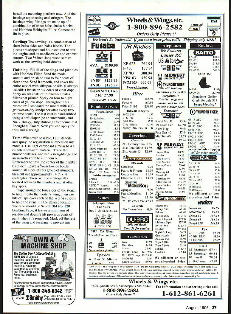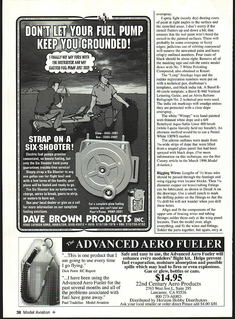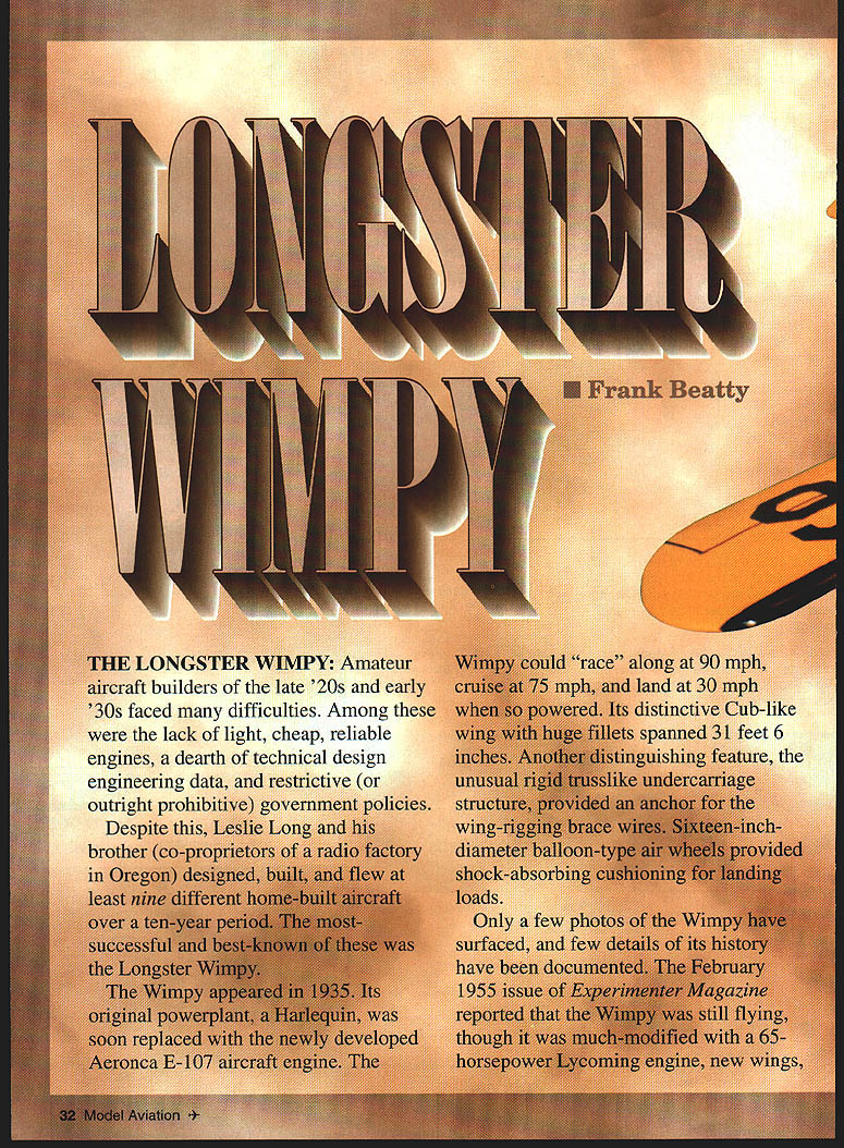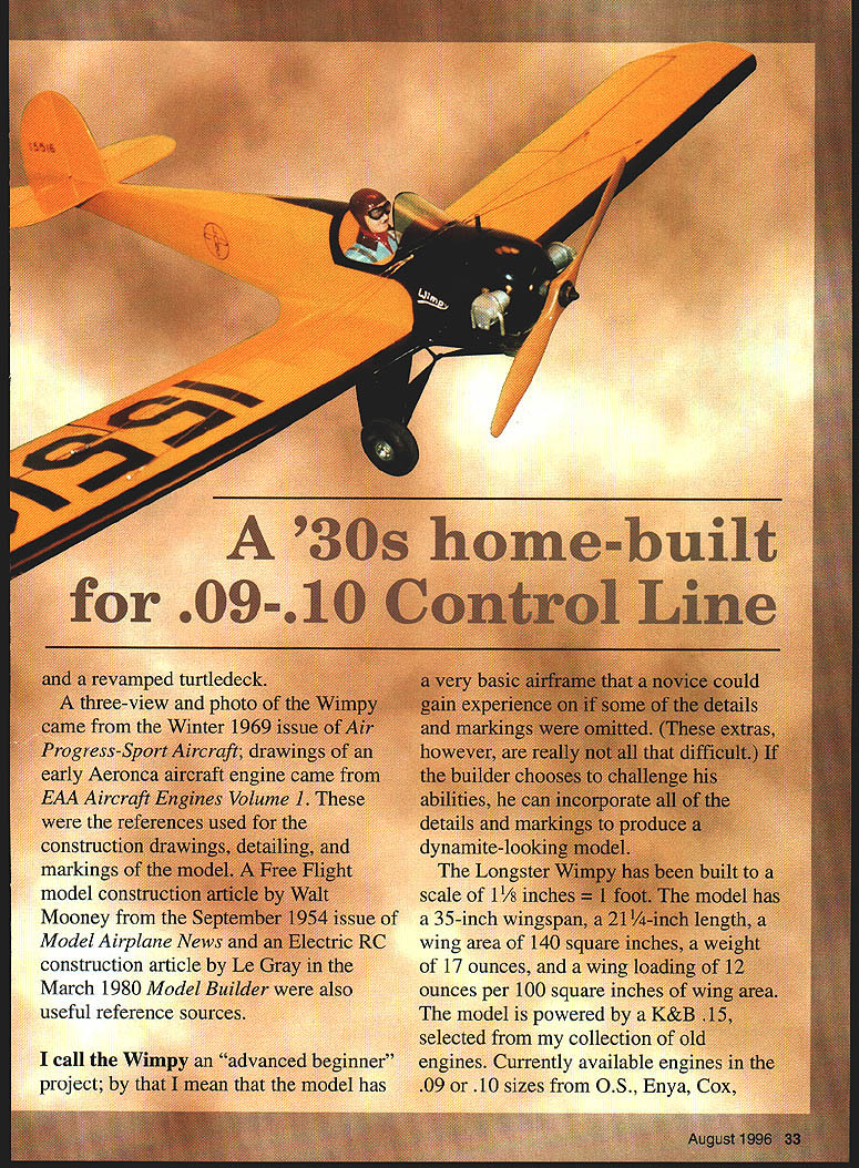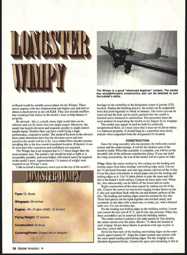 LONA Amateur raft builders late 20s early 30s faced difficulties Among lack light cheap reliable engines dearth technical design engineering data restrictive outright proh Despite brother co w h eatty along 90 land 30 mpn distincti feet 6 09ed turtle view r y Aero 4 Airer cons model c Mooney tlic Model Airplane News construction article March 1980 Model useful reference sources call project advanced beginner~ model has dy TheL scale 1 /8 35-inch wil RC wing area 1 17 ounces ounces per 100 square model powered K selected collection nes Currently available engine 09 10 sizes OS Enya Cox 0 Royal would suitable power plants Wimpy newer engines less displacement turn higher rpm deliver about much power old K&B also include mufflers would provide ballast models nose help balance properly advisedthis small clean light model can airborne can fly faster might expect Moreover model has largish elevators responds quickly small controlhandle inputs Hotshot fliers can have ball flying high performance responsive model pushrod location elevator horn crank determines fast elevators move sensitive model will fly Less-skilled fliers should consider installing less-sensitive pushrod location desired can relocated after experience confidence acquired Wimpy has tail moment 37 times longer nose moment arm models tail should kept light reasonably possible some ballast will almost surely required models nose Approximately 11/2 ounces weight required Wimpys nose like install temporary screw eye top models fuselage centerline designated center gravity CU location During building process model can suspended point regularly check its balance screw eye can removed hole can easily patched after model finished balanced satisfaction procedure beats usual method suspending model fingers its wingtips model may appeal built relatively inexperienced fliers must stress must flown unless balanced properly should hang somewhat nose-down attitude suspended designated CU location CONSTRUCTION Since wing assembly also incorporates bellcrank-control system undercarriage will trickiest part model build assembly complete will downhill side airframe-construction phase can build wing successfully rest model will piece cake Wing Make center section first cutting out leading trailing edges balsa leading- trailing-edge stock Cut out 3A2 plywood forward- rear-spar joiners two ribs Cover plans plastic waxed paper pin leading trailing edges Use /32 balsa shims raise spars ribs above boards work surface Cement parts well dry subassembly can lifted off board set aside Begin construction outer panels cutting out ribs Cement spruce basswood rigging locator blocks C ribs sand flush top bottom surfaces ribs leading trailing edges must notched ribs four pieces can taped together notched neatly accurately time razor saw better yet Dremel table saw Cut out balsa tips Pin leading trailing edges building surface Locate cement tips B C D ribs position dry assemblies can removed building surface center section joined outer panels first pinning center section over plans Blocks 17/32 thick located wingtip Secure blocks position tape pins cannot shift Bevel butt ends leading trailing edges outer panels approximately 80 Align center-section spar joiners outer-panel leading trailing edges Pin wingtips dihedral-alignment blocks Cement spars remaining ribs 34 Model Aviation 4The Wimpy good advanced beginner project model has straightforward construction can detailed suit builders skills position wing dry lift building board set aside Undercarriage Cut out 3A2-plywood landing-gear mounting plate drill four rows 1A6 holes Use X-Acto knife Dremel burr cut shallow grooves between adjacent pairs holes bottom side plate grooves will allow thread binds gear plate flush surface will also simplify finishing surface later Study first three steps undercarriage assembly procedure drawings Step Bend up bind main gear members including V strut platform button thread cement everything well Step Two Bind remaining A2 music wire members fine wire solder Step Three Fit plywood fairings gear shown epoxy everything well 3/is X 1/2 spruce basswood bellcrank support bolt can cemented platform time Fit cement landing-gear platform wing center section Make up bellcrank leadout wire assembly Pass leadouts through inboard wing ribs bolt bellcrank place Bend loops leadout wire ends now cover sharp ends tape prevent injuries Mount one-ounce lead weight outboard wingtip Drill 1A2 boles through riggingwire locator blocks Cover top bottom wings center section 1A6 sheet balsa Carve shape sand wing set aside until final assembly Fuselage Cut out /32 balsa fuselage sides mark bulkhead locations inside surfaces Cut out bulkheads may need modify spacing enginemount cutouts bulkheads 1 2 suit engine using Cement bulkheads 1 2 3 between fuselage sides Make sure sides aligned assembly square Chamfer fuselage ends cement well Fit cement remaining bulkheads position Slip 3/s-square maple engine mounts through bulkheads 1 2 epoxy place Fill spaces between engine mounts fuselage sides balsa extra strength Add filler-pipe extensions fuel tank necessary Locate tanks position balsa wedges epoxy will lock place Drill A6 hole through center cut 1/16 x 1/16 groove side -square x l/4 piece spruce basswood cement bulkhead 2 rigging locator Set fuselage aside now Tail Surfaces tail surfaces cut /32 sheet balsa Install Midwest 1/2A control horn elevators used tubingand-wire hinge system installation shown drawings Some readers might prefer use Klett RK-4 flex-point plastic hinges lighter important reducing ballast models nose perhaps easier some us use Its choice Cover rudder fin stabilizer elevators silkspan silk set aside Assembly Fit wing stabilizer fuselage check alignment cement place Make up install elevator pushrod Make sure control system does bind anywhere tail-skid assembly fuselage bottom sheeting can added plan have pilot cockpit August 1996 35 distinctive rigid trusslike undercarriage structure al