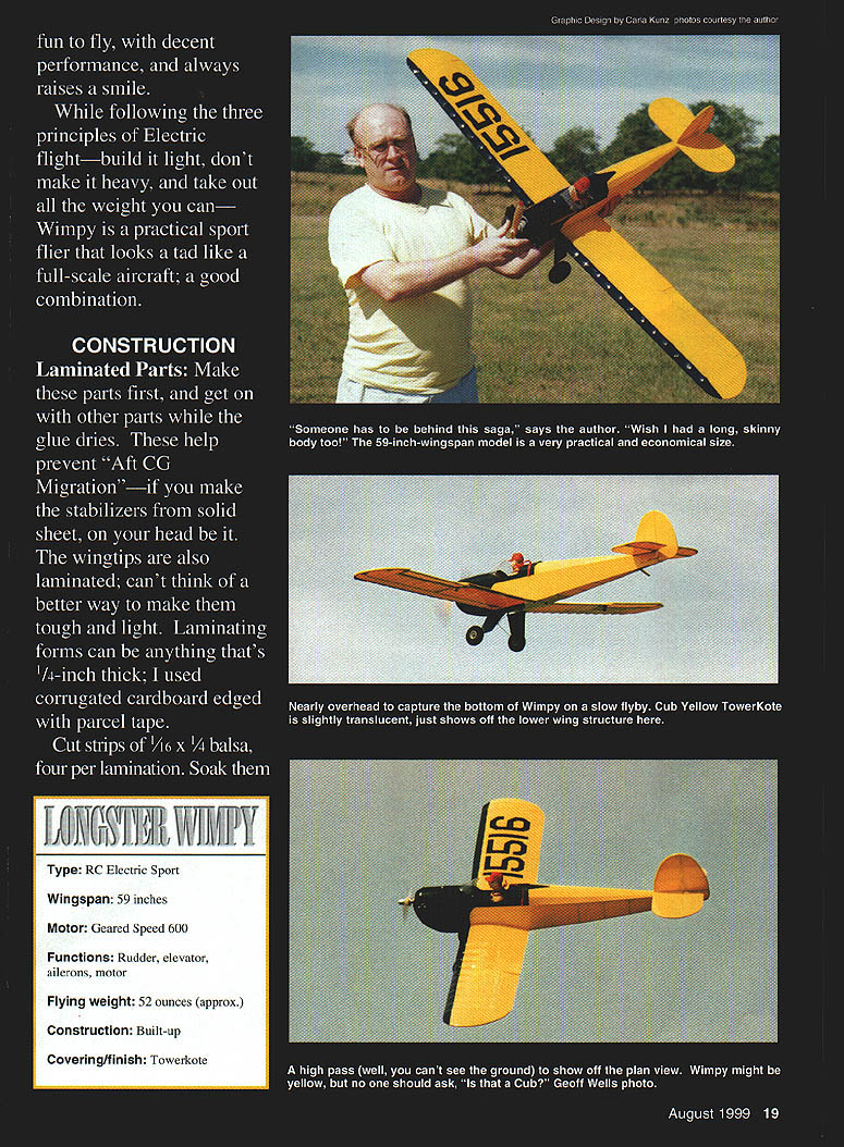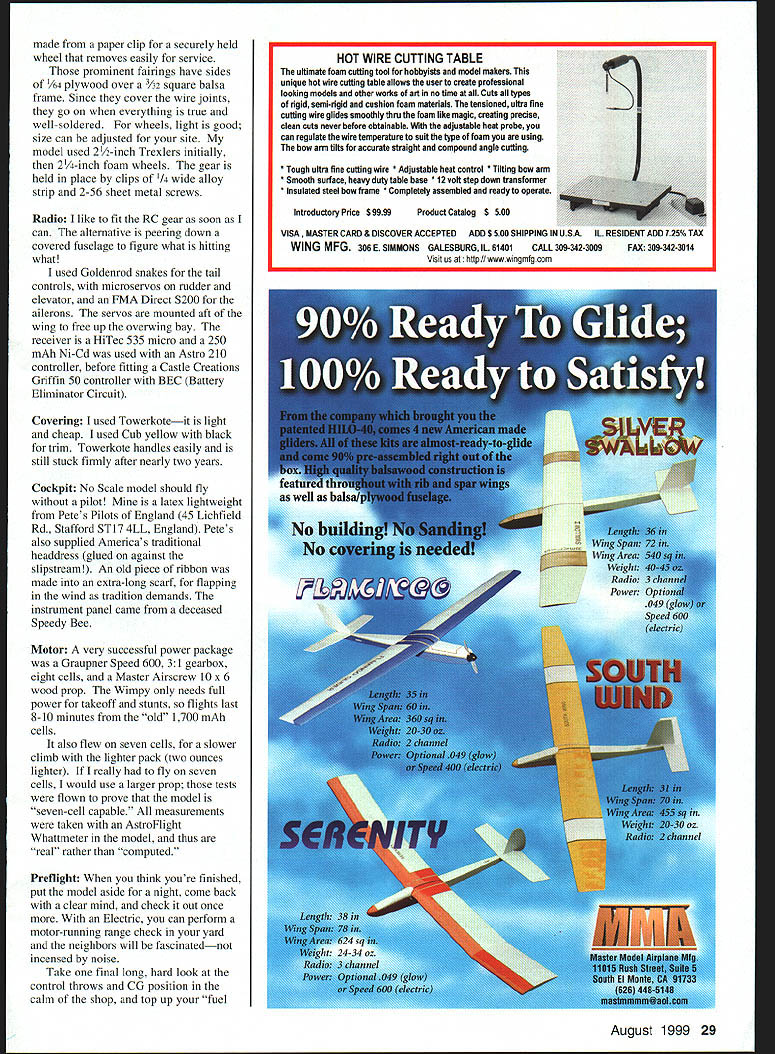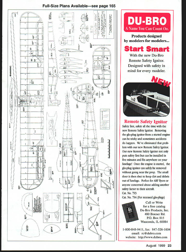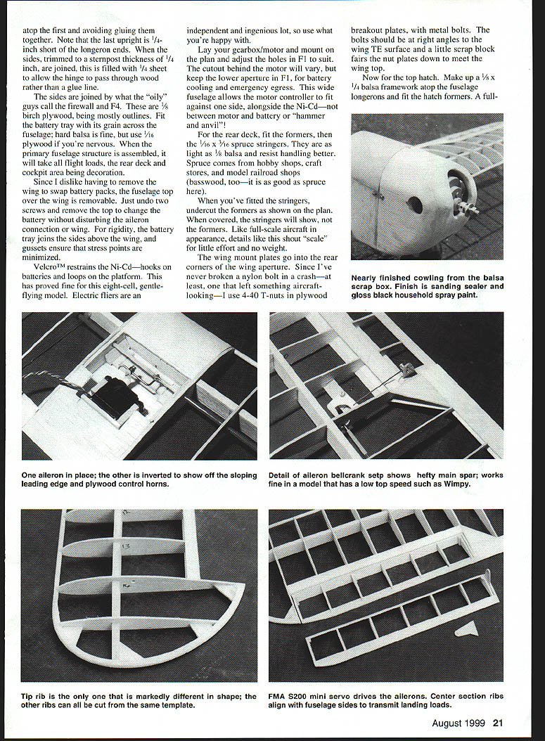 NO OCR TEXT Type RC Electric Sport Wingspan 59 inches Motor Geared Speed 600 Functions Rudder elevator ailerons motor Flying weight 52 ounces approx Construction Built-up Covering/finish Towerkote bathtub Make up 50% mixture white glue water wood soaks After half hour fish wood out dry off surplus water before spreading glue mating faces positioning strips together Really push together rolling gently large dowel works ensure fully glued together Wipe off excess glue Hold strips onto former center rubber bands masking tape work down around former lashing down go aim have together held onto former around Leave somewhere warm make up next carry until have two wingtips two tailplane tips fin rudder outline Yes messy slow cant better lightness strength Tail Feathers fuselage reflects family name long Great stability good balance Shon-nosed Electrics less problemthe Center Gravity CG pays attention 16-ounce battery Still tail long way aft hence laminated outlines sparse internal structure Pin down outlines spars add ribs sand smooth dry Round off edges bevel fin elevator LEs put little 1/64 plywood control horns go Glue fin place drill through tailplane fin LE TE insert short dowels keys used Mylar hinges feel free use favorite type Fuselage fuselage sides built traditional fashion making second 20 Model Aviation rear deck stringers 1/16 x /16 spruce show sharp edge through covering yet withstand handling now-complete hatch sits place Top deck formers scalloped between stringers show Tail units held clear tape set up controls fuselage uncovered Trexler wheels little oversize have high cute factor plus soak up longer grass little bumps atop first avoiding gluing together Note last upright 1/4. inch short longeron ends sides trimmed sternpost thickness 1/4 inch joined filled /4 sheet allow hinge pass through wood rather glue line sides joined what oily guys call firewall F4 birch plywood being mostly outlines Fit battery tray its grain across fuselage hard balsa fine use 1A6 plywood youre nervous primary fuselage structure assembled will take flight loads rear deck cockpit area being decoration Since dislike having remove wing swap battery packs fuselage top over wing removable Just undo two screws remove top change battery disturbing aileron connection wing rigidity battery tray joins sides above wing gussets ensure stress points minimized VelcroTM restrains Ni-Cdhooks batteries loops platform has proved fine eight-cell gentleflying model Electric fliers independent ingenious lot use what youre happy Lay gearbox/motor mount plan adjust holes Fl suit cutout behind motor will vary keep lower aperture Fl battery cooling emergency egress wide fuselage allows motor controller fit against side alongside Ni-Cdnot between motor battery hammer anvil rear deck fit formers A6 x spruce stringers light /s balsa resist handling better Spruce comes hobby shops craft stores model railroad shops basswood tooit good spruce youve fitted stringers undercut formers shown plan covered stringers will show formers Like full-scale aircraft appearance details like shout scale little effort no weight wing mount plates go rear corners wing aperture Since Ive never broken nylon bolt crashat least left something aircraftlookingI use 4-40 T-nuts plywood breakout plates metal bolts bolts should right angles wing TE surface little scrap block fairs nut plates down meet wing top Now top hatch Make up Vs x 1/4 balsa framework atop fuselage longerons fit hatch formers fullAugust1999 21 Nearly finished cowling balsa scrap box Finish sanding sealer gloss black household spray paint aileron place other inverted show off sloping Detail aileron bellcrank setp shows hefty main spar works leading edge plywood control horns fine model has low top speed such Wimpy Tip rib markedly different shape other ribs can cut same template FMA S200 mini servo drives ailerons Center section ribs align fuselage sides transmit landing loads LOrIG5TER wirwv ereck VIoodard 4 LNINATION5 t FUr SKIN 7 zr i 5TINOE- 16 MEU 164LA 3BASA ALA LOVI - SeRVCEI TOP EOTfOM LSAW hTR VI Th1 AM WVN A5 ThE RANO~ FA CIA WLEi [viI53I ThAT IE1AIL - PLr FUSEL~ 2J13LE 77 L5A Th xv II 9K Full-Size Plans Availablesee page 165 Al uiA l IWL II ii________ Il 4 Ii AlA 1 -I 12 \Al i4 Li liii 4k IA IA Al lA liiI AlI iI j--] Ajil Ai -A1 At111 -1 iJ iii 11k 1 -pl &I II 4 K~ Fl • mJIfl ] [v32]UJ AI0 Products designed modelers modelers. Start Smart new Du-Bro Remote Safety Ignitor Designed safety mind modeler Remote Safety Ignitor Safety first safety time new Remote Safety Ignitor Removing gb-plug ignitor started engine can tricky sometimes accidents happen Weve eliminated prob lem new Remote Safety Ignitor new Remote Safety Ignitor puts safety first can installed five minutes fits anywhere fuselage Once engine started gb-plug ignitor can safely removed going near prop small door shut keep dirt debris out fuselage Perfect ARE flyers anyone concerned about adding another safety factor aircraft Cat No 793 Cat No 794 recessed gb-plugs Call Write free catalog Du-Bro Products Inc 480 Bonner Rd PO Box 815 Wauconda IL 60084 1-800-848-9411 fax 847-526-1604 email rc@dubrocom website http//wwwdubrocom August 1999 23 IA pI______ r. t II AA[ Al 1 length top stringer stabilizes glue 1/st plywood deck /64 plywood great because light bends easily withstands handling would crack balsa affix plywood coat frame white glue place plywood roll along will go position puts glue plywood Separate two check mating areas thinly fully coated glue leave set dry heat up iron use old film iron lost its nonstick coating position decking framework Youll find can iron plywood down onto frame top longeron heat melts glue seals plywood down great technique might want have practice run some scrap wood first cowling pondered over fiberglass brown paper white glue over foam used good old balsa cowling opportunity clear out scrap wood make up large box nose remove wood isnt cowl-shaped Once shape right give cowl few coats san