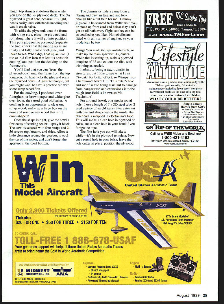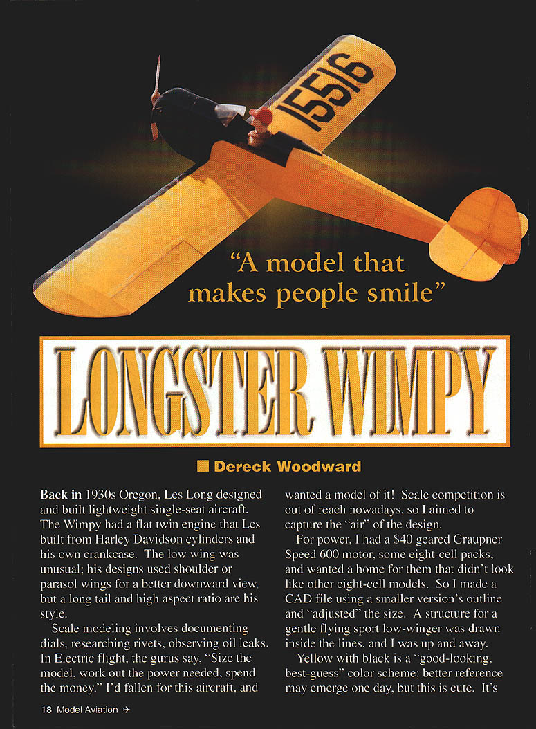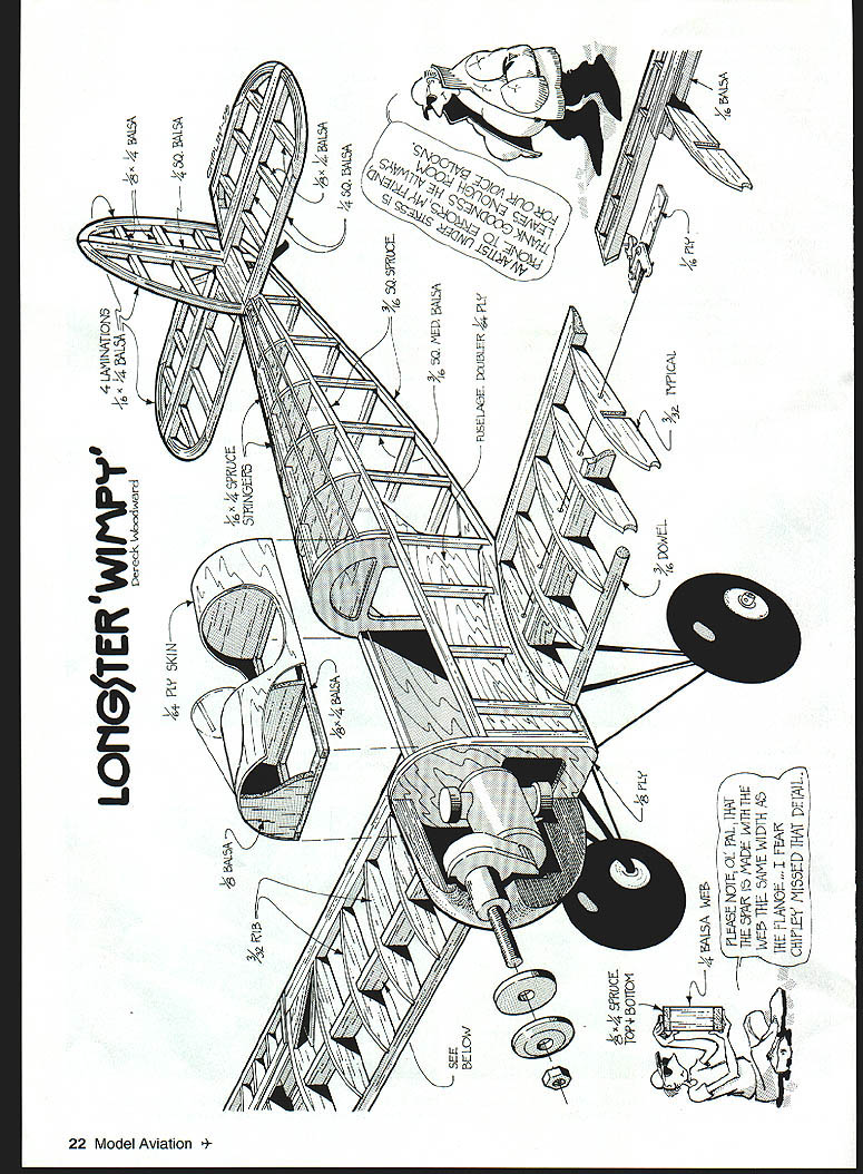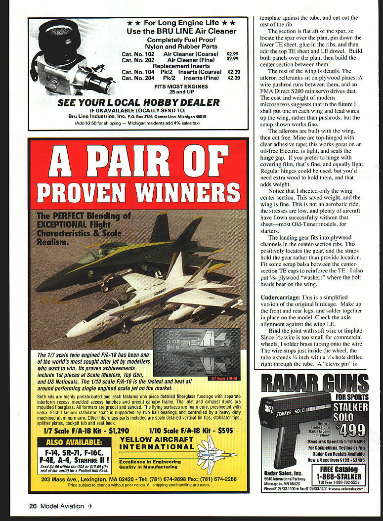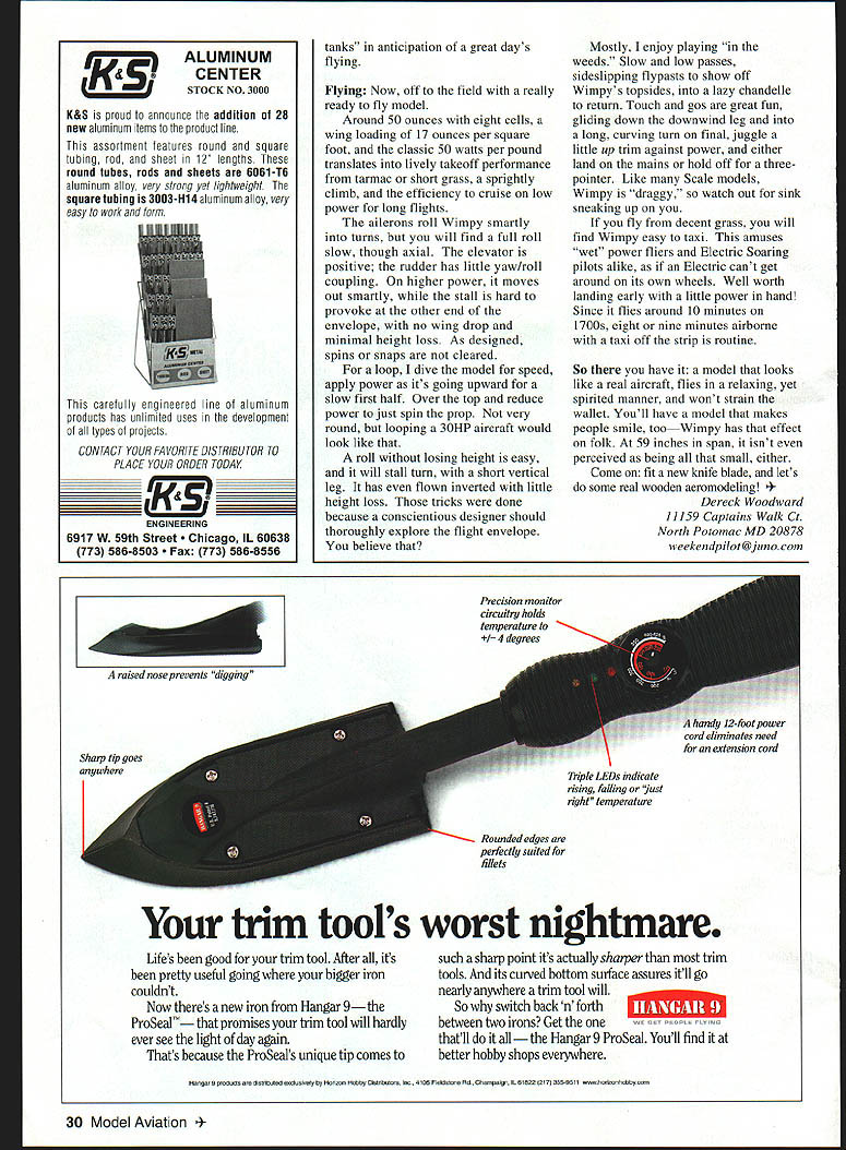NO OCR TEXT Type RC Electric Sport Wingspan 59 inches Motor Geared Speed 600 Functions Rudder elevator ailerons motor Flying weight 52 ounces approx Construction Built-up Covering/finish Towerkote bathtub Make up 50% mixture white glue water wood soaks After half hour fish wood out dry off surplus water before spreading glue mating faces positioning strips together Really push together rolling gently large dowel works ensure fully glued together Wipe off excess glue Hold strips onto former center rubber bands masking tape work down around former lashing down go aim have together held onto former around Leave somewhere warm make up next carry until have two wingtips two tailplane tips fin rudder outline Yes messy slow cant better lightness strength Tail Feathers fuselage reflects family name long Great stability good balance Shon-nosed Electrics less problemthe Center Gravity CG pays attention 16-ounce battery Still tail long way aft hence laminated outlines sparse internal structure Pin down outlines spars add ribs sand smooth dry Round off edges bevel fin elevator LEs put little 1/64 plywood control horns go Glue fin place drill through tailplane fin LE TE insert short dowels keys used Mylar hinges feel free use favorite type Fuselage fuselage sides built traditional fashion making second 20 Model Aviation rear deck stringers 1/16 x /16 spruce show sharp edge through covering yet withstand handling now-complete hatch sits place Top deck formers scalloped between stringers show Tail units held clear tape set up controls fuselage uncovered Trexler wheels little oversize have high cute factor plus soak up longer grass little bumps atop first avoiding gluing together Note last upright 1/4. inch short longeron ends sides trimmed sternpost thickness 1/4 inch joined filled /4 sheet allow hinge pass through wood rather glue line sides joined what oily guys call firewall F4 birch plywood being mostly outlines Fit battery tray its grain across fuselage hard balsa fine use 1A6 plywood youre nervous primary fuselage structure assembled will take flight loads rear deck cockpit area being decoration Since dislike having remove wing swap battery packs fuselage top over wing removable Just undo two screws remove top change battery disturbing aileron connection wing rigidity battery tray joins sides above wing gussets ensure stress points minimized VelcroTM restrains Ni-Cdhooks batteries loops platform has proved fine eight-cell gentleflying model Electric fliers independent ingenious lot use what youre happy Lay gearbox/motor mount plan adjust holes Fl suit cutout behind motor will vary keep lower aperture Fl battery cooling emergency egress wide fuselage allows motor controller fit against side alongside Ni-Cdnot between motor battery hammer anvil rear deck fit formers A6 x spruce stringers light /s balsa resist handling better Spruce comes hobby shops craft stores model railroad shops basswood tooit good spruce youve fitted stringers undercut formers shown plan covered stringers will show formers Like full-scale aircraft appearance details like shout scale little effort no weight wing mount plates go rear corners wing aperture Since Ive never broken nylon bolt crashat least left something aircraftlookingI use 4-40 T-nuts plywood breakout plates metal bolts bolts should right angles wing TE surface little scrap block fairs nut plates down meet wing top Now top hatch Make up Vs x 1/4 balsa framework atop fuselage longerons fit hatch formers fullAugust1999 21 Nearly finished cowling balsa scrap box Finish sanding sealer gloss black household spray paint aileron place other inverted show off sloping Detail aileron bellcrank setp shows hefty main spar works leading edge plywood control horns fine model has low top speed such Wimpy Tip rib markedly different shape other ribs can cut same template FMA S200 mini servo drives ailerons Center section ribs align fuselage sides transmit landing loads LOrIG5TER wirwv ereck VIoodard 4 LNINATION5 t FUr SKIN 7 zr i 5TINOE- 16 MEU 164LA 3BASA ALA LOVI - SeRVCEI TOP EOTfOM LSAW hTR VI Th1 AM WVN A5 ThE RANO~ FA CIA WLEi [viI53I ThAT IE1AIL - PLr FUSEL~ 2J13LE 77 L5A Th xv II 9K Full-Size Plans Availablesee page 165 Al uiA l IWL II ii________ Il 4 Ii AlA 1 -I 12 \Al i4 Li liii 4k IA IA Al lA liiI AlI iI j--] Ajil Ai -A1 At111 -1 iJ iii 11k 1 -pl &I II 4 K~ Fl • mJIfl ] [v32]UJ AI0 Products designed modelers modelers. Start Smart new Du-Bro Remote Safety Ignitor Designed safety mind modeler Remote Safety Ignitor Safety first safety time new Remote Safety Ignitor Removing gb-plug ignitor started engine can tricky sometimes accidents happen Weve eliminated prob lem new Remote Safety Ignitor new Remote Safety Ignitor puts safety first can installed five minutes fits anywhere fuselage Once engine started gb-plug ignitor can safely removed going near prop small door shut keep dirt debris out fuselage Perfect ARE flyers anyone concerned about adding another safety factor aircraft Cat No 793 Cat No 794 recessed gb-plugs Call Write free catalog Du-Bro Products Inc 480 Bonner Rd PO Box 815 Wauconda IL 60084 1-800-848-9411 fax 847-526-1604 email rc@dubrocom website http//wwwdubrocom August 1999 23 IA pI______ r. t II AA[ Al 1 length top stringer stabilizes glue 1/st plywood deck /64 plywood great because light bends easily withstands handling would crack balsa affix plywood coat frame white glue place plywood roll along will go position puts glue plywood Separate two check mating areas thinly fully coated glue leave set dry heat up iron use old film iron lost its nonstick coating position decking framework Youll find can iron plywood down onto frame top longeron heat melts glue seals plywood down great technique might want have practice run some scrap wood first cowling pondered over fiberglass brown paper white glue over foam used good old balsa cowling opportunity clear out scrap wood make up large box nose remove wood isnt cowl-shaped Once shape right give cowl few coats san