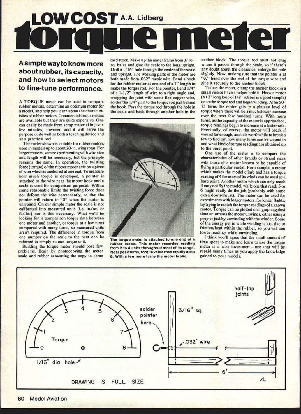 and select motors fine-tune pertormance TORQUE meter can used compare rubber motors determine optimum motor model help learn about character istics rubber motors Commercial torque meters available quite expensive can easily made scrap material just few minutes however will serve purpose quite well both teaching device practical tool meter shown suitable rubber motors used models up about 20-in wing span larger motors some experimenting wire size length will necessary principle remains same operation twisting force torque rubber motor acts piece wire anchored end measure much torque developed pointer attached wire near motor hook scale used comparison purposes Within some reasonable limits twisting force does deform wire permanently pointer will return 0 motor unwound simple meter scale calibrated measured units ie in/oz ft/lbs nor necessary What well looking comparison torque data between motor another torque few tums compared turns measured units arent required difference torque number scale next can referred simply torque unit Building torque meter should pose few problems Begin photocopying meter scale rubber cementing copy some card stock Make up meter frame 3/16 sq balsa glue scale long upright Drill 1/16 hole through center scale upright working parts meter both made 032 music wire Bend hook rubber motor end 7 length make torque rod pointer bend 1/4 1-1/2 length wire right angle wrapping joint some fine copper wire solder 1/4 part torque rod just behind hook Pass torque rod through hole scale back through another hole I anchor block torque rod must drag passes through scale theres doubt about clearance enlarge hole slightly Now making sure pointer 0 bend over end torque wire glue securely anchor block use meter clamp anchor block small vise have helper hold Hook motor 12 long loop 1/8 rubber good sample torque rod begin winding After 50 75 turns motor gets plateau level torque will much slower increase over next few hundred turns turns capacity motor approached torque readings begin increase faster rate Eventually course motor will break wound far enough worthwhile break few find out turns can wound what kind torque readings obtained up burst point use meter compare characteristics other brands strand sizes motor known capable flying particular model example motor makes model climb has torque reading 4 its winds can used base point Another motor can reach 3 may fly model reads 5 6 might really job probably some extra down-thrust meter can used experiments longer motors longer flights trying match torque readings known motor Torque can plotted graph against time turns motor unwinds either using prop just unwinding winder Some energy put winding lost due friction/heat within rubber will see lower readings unwinding think youll agree small amount time spent make learn use torque meter wise investmentone will repaid times apply knowledge gained models 3/16 sq /-032 wire joints half-la solder pointer H 1/16 dia hole 6 ADRAWING IS FULL SIZE 60 Model Aviation dJ -r le wayto know about rubber its capacity torque meter attached end 0 rubber motor motor recorded reading 2 4 units throughout its range Near peakturns torque value rose rapidly up 8 few turns motor broke 008