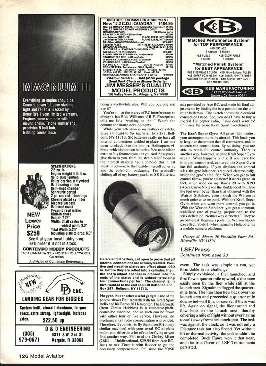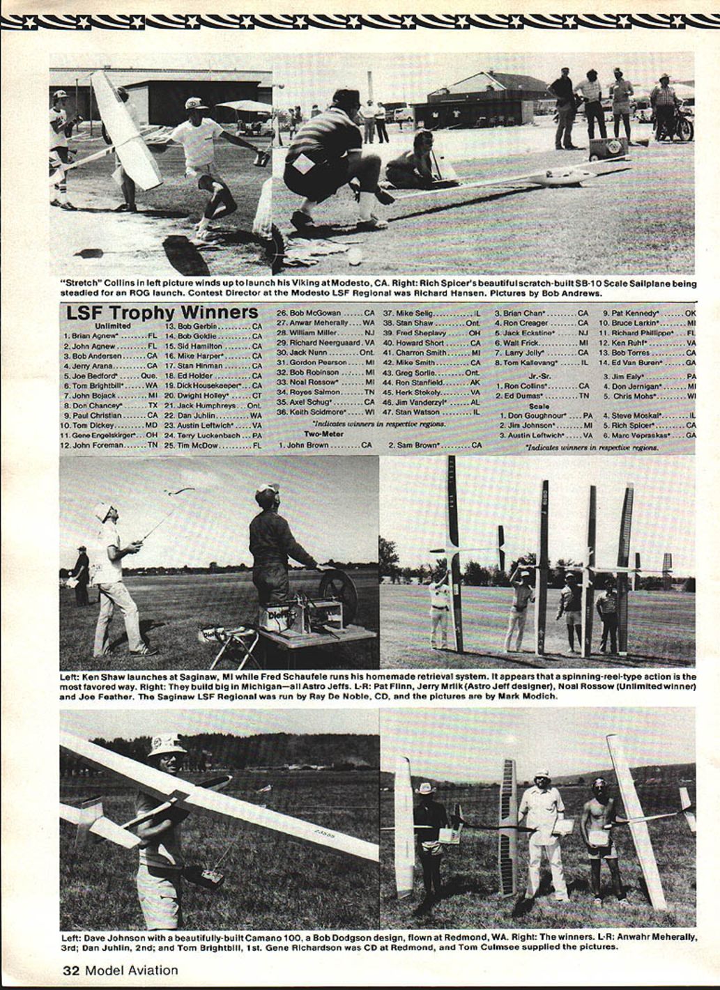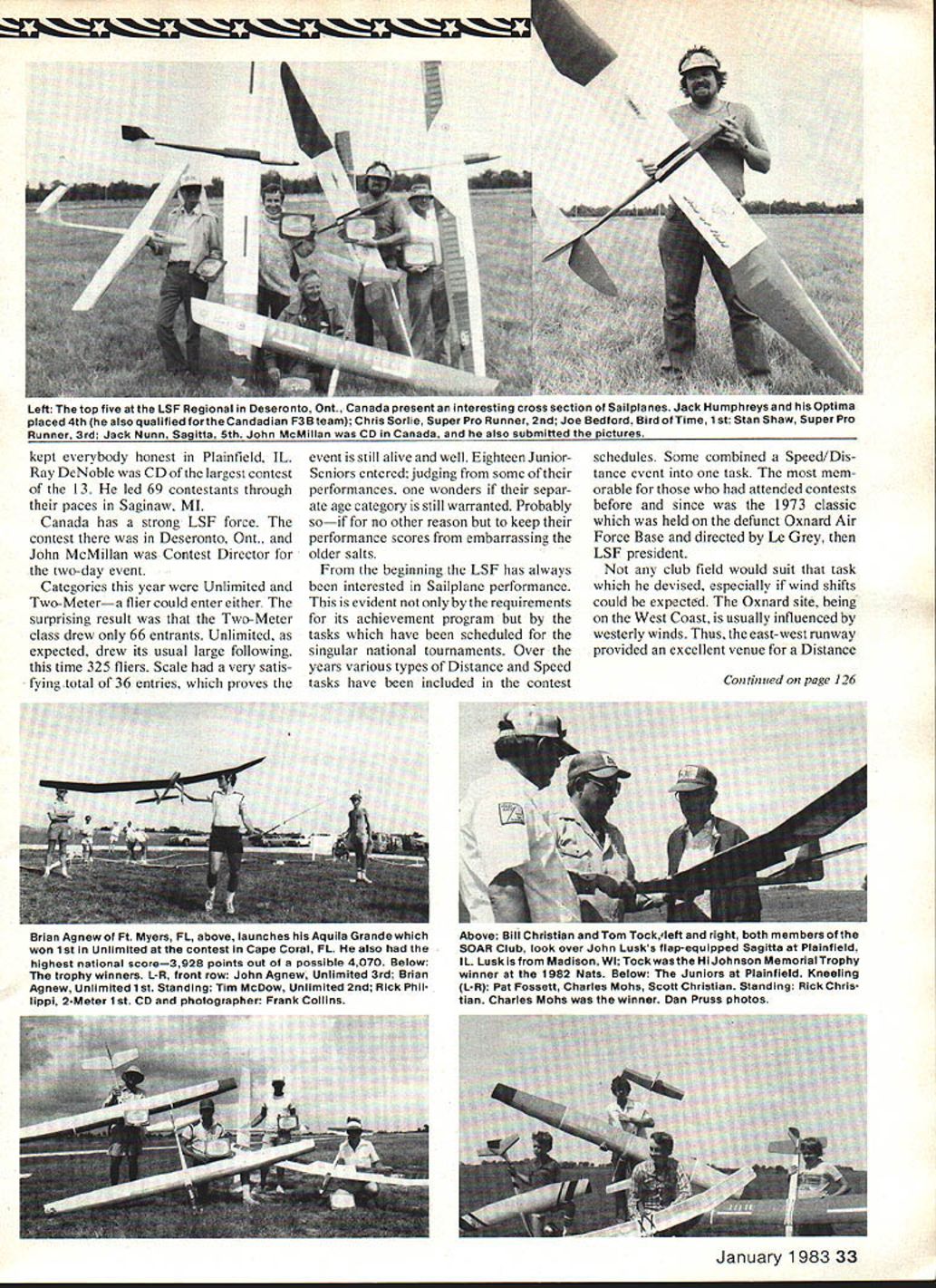THE LONGEST-RUNNING annual RC Soaring event world League Silent Flight Tournament Starting 1970 handful members newly-formed League Silent Flight first contest won Les Anderson LSF/013 Up through 1976 contests held California hosted club dedicated support LSF tournament 1976 won Don ments other parts country 1977 ethe regional tournaments replaced single sievent 1978 12 regionals held 1979 single tournament again held planebut Lewis University site andMidwest return national event Edberg L s ias nauonaibrought about idea scheduling event West Coastmainly becauseregionals other year qualifica clamoring membership thetions having met order compete opportunity compete similar tourna-in off-years annual tournament Skip Left Connie Jones fine-tunes Jantar Scale entry Center L-R Don Chancey Ron Stanfield congratulate other placing Unlimited eventbut Chancey ended up winning guys did bang-up job running RC Soaring Nats Right Chancey winning Pantera has controls rudder elevator ailerons spoilers Photos submitted Jim Simpson CD Dallas TX Left winners Chapel Hill TN Kneeling L-R Eddie Dumas 1St Junior Ed Van Buren 1st 2-Meter Standing John Foreman 2nd Unlimited Marc Vepraskas 1St Scale James Vanderzyl 1st Unlimited Roy Salmon 3rd Unlimited Plaques gold silver bronze 1st 2nd 3rd Right Davey Systems line retriever frequent use atthe different sites Picture shows retrieverwith respect winch John Foreman CD site reported retriever allowed possibility launch minute Photos Stan Koch Miller won 197 1980 14 regionals produced field 1981 event Ken Bates 1981 grand champion tournaments five-day multi-task event brings us 1982 scheduleagain year regionals Thirteen clubs volunteered host event 1982 covered USA 12 contests plus Canada California scheduled threeand justifiably since quarter LSFs membership has California addresses Contest Directors John Brown tournament Anaheim Richard Hansen Modesto Bill Rutherford Bakers field Washington State Gene Richard son headed eventwhile Frank Collins kept things going Florida between no lesser efforts Ken Ruhf CD Fort Lee VA John Vogel Allison PA Jerry Zeigenfuse helped satisfy strong eastern contingent ofLSFers holding another Pennsylvania contest Birdsboro John Foreman served area holding contest Chapel Hill TN Jim Simpson did likewise Dallas TX Jim Slater Above Fred Sheplevy launches Aquila XL second atAlli- Above Some organizersbless emat Birdsboro PA Lois son Park PA Trees behind no doubt kept everyone alert Below Carl Zeigenfuse checks scores Carl Luff Donnie Goughnours T-shirt Engelskirger age 12 launches Viking placed fourth Happiness . sums up Below Don Goughnours Astir CS-77 Allison Park pictures submitted John Vogel CD site won Scale Birdsboro ohotos submitted Ierrv ZoiaAnfuA tfl 32 Model Aviation Stretch Collins left plctuie wnu up king Modesto CA Right Rich Spicers beautiful scratch-built SB-i 0 Scale Sailplane being steadied ROG launch Contest Director Modesto 1SF Regional Richard Hansen Pictures Bob Andrews McGowanCA.GA ir Mehetuly -.WACA UUmNJ l.guaardVA- MI inOat CA tearsonMt IL haonMl RoaaowMl 1-N ~Imon ug ---Iadama wetiw No-Eater CA onaw uauncnes oagnaw w-u ,u ,,iemade retrieval system appears spinning-reel-type action ravored way Right build big Michiganall Astro Pat Flinn Jerry Mrlik Astro Jeff designer Noal Rossow Unlimited winner Joe Feather Saginaw 1SF Regional run Ray Dc noble CD pictures Mark Modich Left Dave Johnson beautifully-built Camano 100 Bob Dodgson design tiown Heomona WA ignt inners L-R Anwahr Meherally 3rd Dan Juhlin 2nd Tom Brightbill 1st Gene Richardson CD Redmond Tom Culmsee supplied pictures kept everybody honest Plainfield IL Ray DeNoble CD largest contest 13 led 69 contestants through paces Saginaw MI Canada has strong LSF force contest Deseronto Ont. John McMillan Contest Director two-day event Categories year Unlimited Two-Metera flier could enter either surprising result Two-Meter class drew 66 entrants Unlimited expected drew its usual large following time 325 fliers Scale very satis fying total 36 entries proves event still alive well Eighteen JuniorSeniors entered judging some performances wonders separ ate age category still warranted Probably soif no other reason keep performance scores embarrassing older salts beginning LSF has always interested Sailplane performance evident requirements its achievement program tasks have scheduled singular national tournaments Over years various types Distance Speed tasks have included contest schedules Some combined Speed/Dis tance event task mem orable attended contests before since 1973 classic held defunct Oxnard Air Force Base directed Le Grey LSF president club field would suit task devised especially wind shifts could expected Oxnard site being West Coast usually influenced westerly winds Thus east-west runway provided excellent venue Distance Continued page 126 January 1983 33 Left top five LSF Regional Deseronto Ont Canada present interesting cross section Sailpianes Jack Humphreys Optima placed 4th also qualified forthe Candadian F3B team Chris Sorlie Super Pro Runner 2nd Joe Bedford Bird Time 1 st Stan Shaw Super Pro Runner 3rd Jack Nunn Sagitta 5th John McMillan CD Canada also submitted pictures Brian Agnew Ft Myers FL above launches Aquila Grande Above Bill Christian Tom Tockleft right both members won 1st Unlimited contest Cape Coral FL also SOAR Club look over John Lusks flap-equipped Sagitta Plainfield highest national score3928 points out possible 4070 Below IL LuskisfromMadisonWITockwastheHiJohnsonMemorialTrophy trophy winners L-R front row John Agnew Unlimited 3rd Brian winner 1982 Nats Below Juniors Plainfield Kneeling Agnew Unlimited 1st Standing Tim McDow Unlimited 2nd Rick Phil- L-R Pat Fossett Charles Mohs Scott Christian Standing Rick Chris lippi 2-Meter 1st CD photographer Frank Collins tian Charles Mohs winner Dan Pruss photos III B7ivht4 lb 6 oz ignition liIler bearing flywheel Ball bearing rear Hemi-head chamber Schneurle ported 2 pc con rodbearings Chro