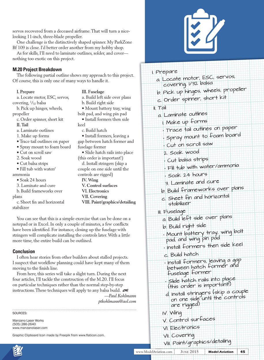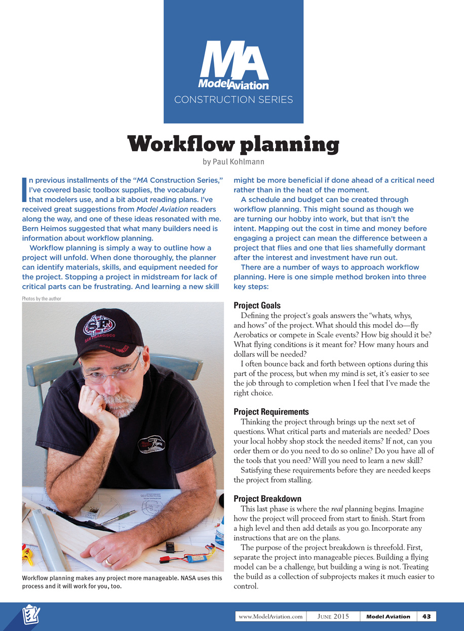 In previous installments of the “MA Construction Series,” we’ve covered basic toolbox supplies, the vocabulary that modelers use, and a bit about reading plans. I’ve received great suggestions from Model Aviation readers along the way, and one of these ideas resonated with me. Bern Heimos suggested that what many builders need is information about workflow planning.