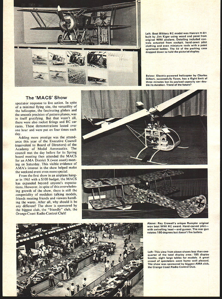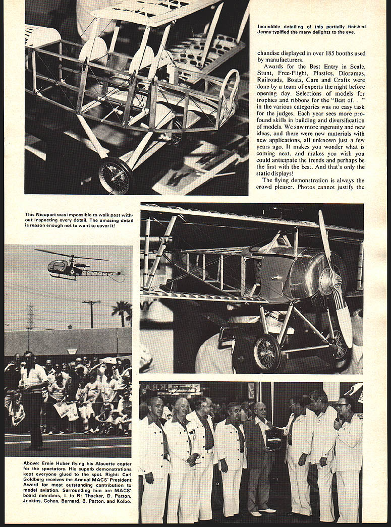 on May 1 2 biggest yet national scene Aerial view Anaheim Convention Cen terMACS Show held building right PIACW Show Text Harry Apojan Photographs RDCooley SUPPOSEDLY picture worth thousand words spite seeing photos activity Annual Model Crafts Show Anaheim sunny California cannot comprehend sights sounds being Only actually witnessing tender lov ing care used compose attractive dis plays actually talking touching meeting modeling friends can appre ciate pleasure being Saturday Sunday May 1 2 reward 12 months preparation MACS promoters Dick Bernard Lou Kolbo Don Patton John Thacker Orange Coast R/C Club coo per ation Southern California Hobby Industries Association members Si Cohen George Jenkins Bruce Patton enthusiastic response participants supporters show 640 models crafts display addition endless attractive mer Upper Col Bob Thackers original RC de Havil land 88 Comet won best RC Scale Award brilliant red white trim immacu late detailingnote cockpit canopy Above Messerschmitt Bt 109E Ray Smith best CLpadded cockpit real plane details re tracting gear bomb release hand-sewn clothes pilot cockpit-actuated controls Best Show Award went Don Harris RC modified EAA PJ-60 bipe Weight 8-1/2 lb. 80 power Red exhaust using food coloring dye No2 Covered 100% polyester 36 Model Aviation limited RC Toledo show Anaheim California Above Ernie Huber flying Alouette copter spectators superb demonstrations kept everyone glued spot Right Carl Goldberg receives Annual MACS President Award outstanding contribution model aviation Surrounding him MACS board members R Thacker D Patton Jenkins Cohen Barnard B Patton Kolbo Incredible detailing partially finished Jenny typified delights eye chandise displayed over 185 booths used manufacturers Awards Best Entry Scale Stunt Free-Flight Plastics Dioramas Railroads Boats Cars Crafts done team experts night before opening day Selections models trophies ribbons Best ous categories no easy task judges year sees pro found skills building diversification models saw ingenuity new ideas new materials new applications unknown just few years ago makes wonder what coming next makes wish could anticipate trends perhaps first best thats static displays flying demonstration always crowd pleaser Photos cannot justify Nieuport impossible walk past out inspecting detail amazing detail reason enough want cover MACS Show Left Best Military RC model Hanroit H-D1 built Jim Kiger using wood paint original WWI airplane Detailing included con trols actuated cockpit hand-sewn pilot clothing miniature tools paint splattered ladder lid packing case dropped down hold pictorial display Below Electric-powered helicopter Charles Gilbert successfully flown has flight limit three minutes its payload capacity can dou ble its duration Trend future spectator response live action spite minimal flying site versatility helicopter fascinating gliders smooth precision pattern planes itself gratifying wasnt also rocket firings RC car races demonstrations lasted over hour put four times day Adding prestige attend ance year Executive Council equivalent Board Directors Academy Model Aeronautics council met day before its Spring board meeting attended MACS AMA District X west coast meet ing Saturday visible evidence AMAs interest show helped make weekend event special first show airplane hang ar 1965 $100 budget MACS has expanded beyond anyones expecta tions However spite overwhelm ing growth show still congeniality modelers talking models friends meeting friends viewers handl ing wares After should different show sponsored biggest club friendly club Orange Coast Radio Control Club Above Ray Crowells unique Rumpler original won best WWI RC award Hand-carved pilot swivelling headand gunner rear gun rotates 180 degrees doesnt fire bullets Left This view above shows less quarter total display area 185 display booths eight large tables models great crowd spectators went home well pleased show sponsored biggest AMA club Orange Coast Radio Control Club