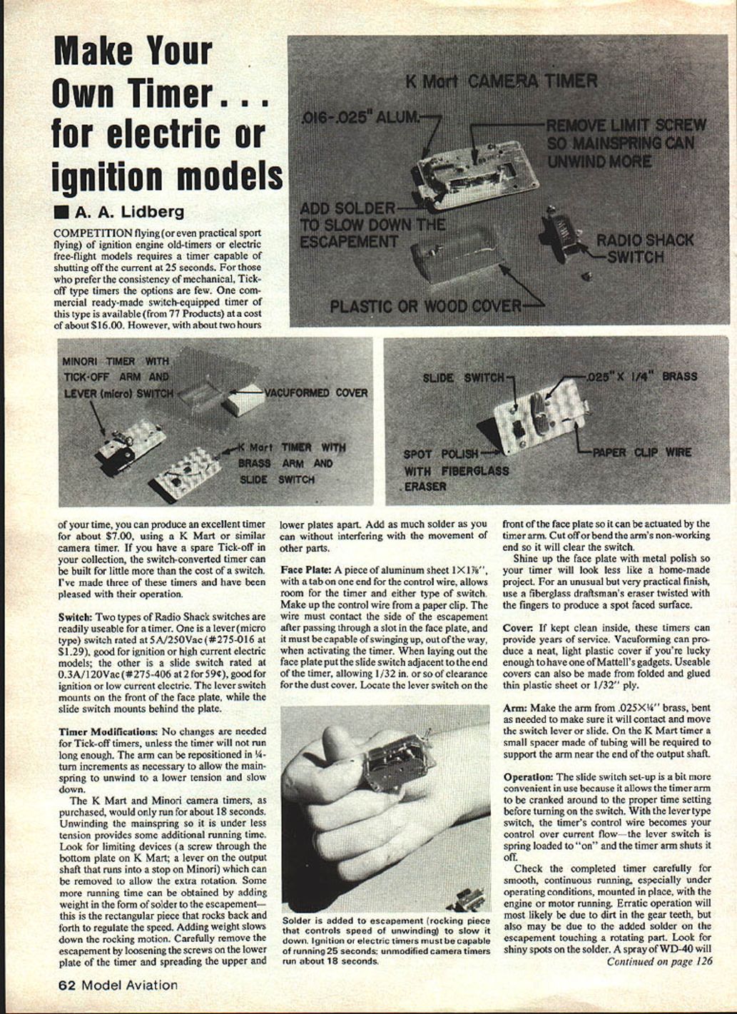 Make Own Timer. electric ignition models A Lid berg COMPETITION flying practical sport flying ignition engine old-timers electric free-flight models requires timer capable shutting off current 25 seconds prefer consistency mechanical Tickoff type timers options few com mercial ready-made switch-equipped timer type available 77 Products cost about $1600 However about two hours time can produce excellent timer about $700 using K Mart similar camera timer have spare Tick-off collection switch-converted timer can built little cost switch Ive made three timers have pleased operation Switch Two types Radio Shack switches readily useable timer lever micro type switch rated 5AI25OVac *275-016 $129 good ignition high current electric models other slide switch rated 03A/l2OVac #275-406 2 59g good ignition low current electric lever switch mounts front face plate slide switch mounts behind plate Timer Modifications No changes needed Tick-off timers unless timer will run long enough arm can repositioned turn increments necessary allow main spring unwind lower tension slow down K Mart Minori camera timers purchased would run about 18 seconds Unwinding mainspring under less tension provides some additional running time Look limiting devices screw through bottom plate K Mart lever output shaft runs stop Minori can removed allow extra rotation Some running time can obtained adding weight form solder escapement rectangular piece rocks back forth regulate speed Adding weight slows down rocking motion Carefully remove escapement loosening screws lower plate timer spreading upper Face Plate piece aluminum sheet iXi h tab end control wire allows room timer either type switch Make up control wire paper clip wire must contact side escapement after passing through slot face plate must capable swinging up out way activating timer laying out face plate put slide switch adjacent end timer allowing 1/32 clearance dust cover Locate lever switch Solder added escapement rocking piece controls speed unwinding slow down Ignition electric timers must capable running 25 seconds unmodified camera timers run about 18 seconds front face plate can actuated timer arm Cut off bend arms non-working end will clear switch Shine up face plate metal polish timer will look less like home-made project unusual very practical finish use fibergiass draftsmans eraser twisted fingers produce spot faced surface Cover kept clean inside timers can provide years service Vacuforming can pro duce neat light plastic cover youre lucky enough have ofMattells gadgets Useable covers can also made folded glued thin plastic sheet 1/32 ply Arm Make arm 025X brass bent needed make sure will contact move switch lever slide K Mart timer small spacer made tubing will required support arm near end output shaft Operation slide switch set-up bit convenient use because allows timer arm cranked around proper time setting before turning switch lever type switch timers control wire becomes control over current flowthe lever switch spring loaded timer arm shuts off Check completed timer carefully smooth continuous running especially under operating conditions mounted place engine motor running Erratic operation will likely due dirt gear teeth also may due added solder escapement touching rotating part Look shiny spots solder spray WD-40 will Continued page 126 62 Model Aviation lower plates apart Add much solder can interfering movement other parts 6 Owning RADIO CONTROL BUYERS GUIDE Like Having Information 260 Manufacturers Catalogs Guide has illustrations descrip tions prices 2400 radio control items information industry master catalog organized indexed cross-indexed easy reference Included latest model cars sailboats power boats aircraft radio systems tools books building materials engines accessories New 6th EdItion has 280 81/2 x 11 pages information must serious modeler Suggested Retail $995 Better Hobby Shops Direct Yes rush copy new 6th edition Radio Control Buyers Guide Please check El Enclosed $1100 $995 retail plus $105 postage US Oanada Only dians send US Funds El Charge El Mastercharge D Visa Charge no__________________ Exp Date_________ Return H/c Buyers Guide 7 clifton House Olifton VA 22024 tient sold Bill Moore Anthony Kansas experiences graphical ly illustrate versatility design Bill Winter has asked relate no instructor kind available small village Bill three friends used Super Brig vehicle learn fly RC Although ever flown RC model bravely got together Sunday afternoon proceeded self instruct themselves Unable successfully take off dirt road flying least initially opted hand launch model after several ground loops Note recommend flying short grass hand launching Incredible may seem before sunset successfully taking off flying landing Super Brig! sure model exhibited some dinged wing tips scratched up nose several elastic bands popped off wheel pants long gone model nonetheless still flyable survived extraordinary flying session smoothing Out inevitable overcontrols beginners correcting its attitude getting re oriented forgiving errors flown model before would find story unbelievable must absolutely true single day highly stable extremely rugged relatively viceless model intro duced four total strangers joys hobby-sport love much know no higher recommendation prospective builder Timer Lid berg continued page 62 help clean lubricate timer Ignition electric models may have own peculiar characteristics provide own kinds satisfactions too Try might like em Note K Mart timers normally sell $496 bargain now marked down about $4 Other materials cited K&S aluminum sheet brass strip hobby shop Letters Editor continued page 12 before us happily punch away multiple functions little button transmitter visit area please join us day flying activities Vince Pacifico Plainview NY letter personal side Vince expressed some interesting thoughts hence its presence Besides often hit infamous oak tree Vince remember great guys names deleredand others Say hello Ships Pa
