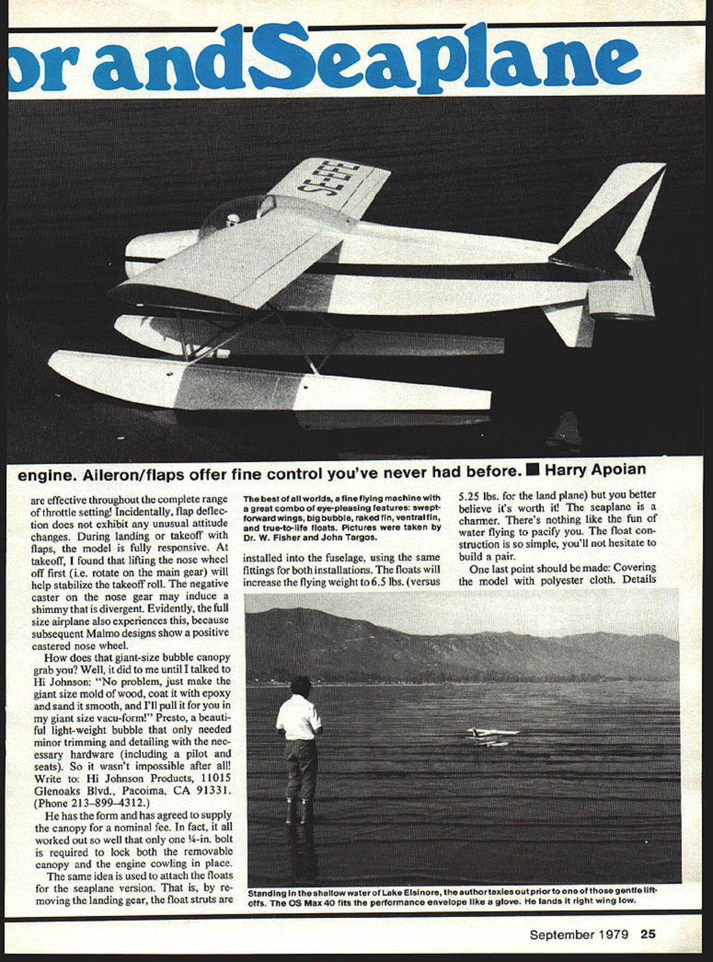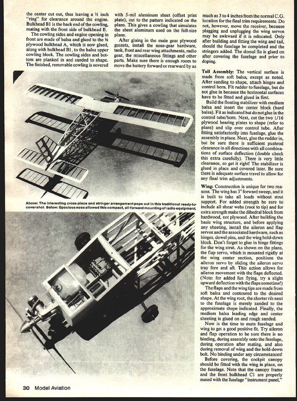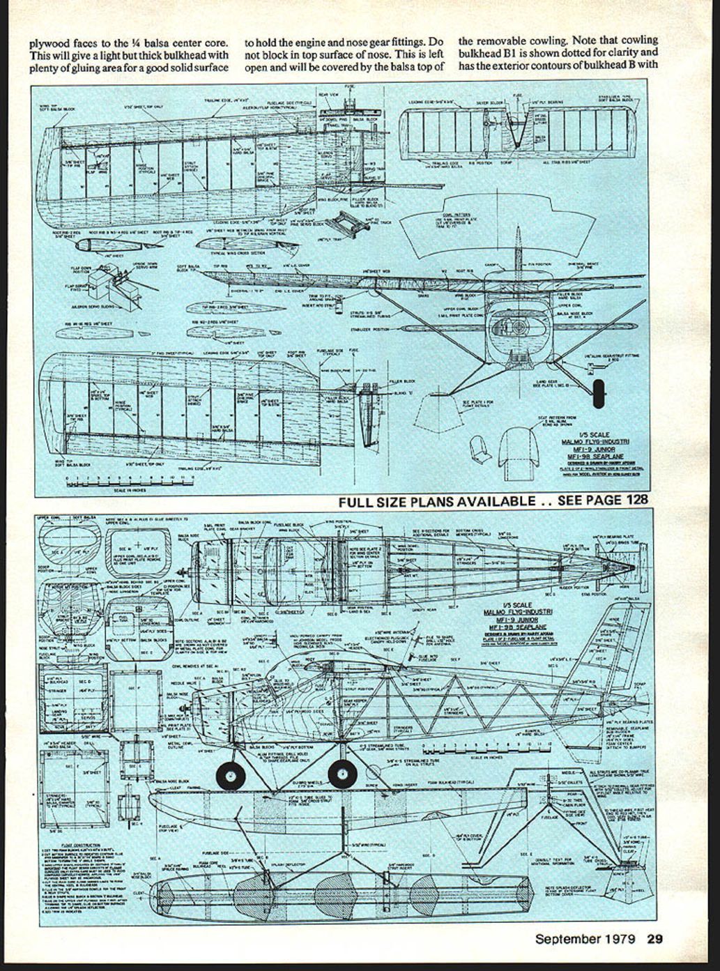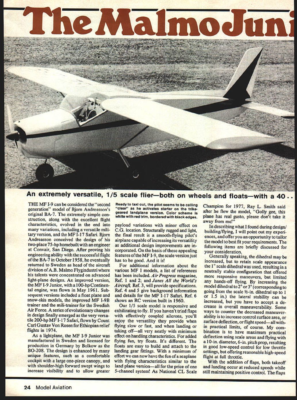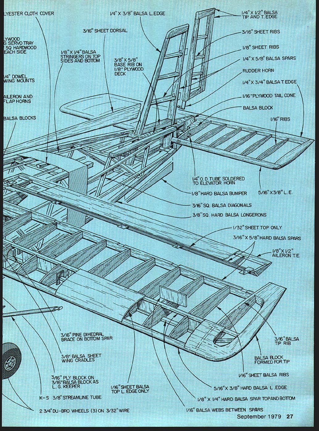 The An extremely versatile 1/5 scale flierboth wheels floatswith 40. THE ME 1-9 can considered second generation model Bjom Andreasson s original BA-7 extremely simple con struction along excellent flight characteristics evolved end variations including versatile mili tary version MF 1-17 Safari Bjorn Andreasson conceived design two-place 75-hp homebuilt engineer Convair San Diego After proving engineering ability successful flight BA-7 October 1958 eventually returned Sweden head aircraft division AB Malmo Flygindustri talents concentrated advanced light-plane designs An improved version MF 1-9 Junior 100-hp Continen tal engine flown May 1961 Sub sequent versions included float plane snow-skis models improved MF I-9B trainer mili-trainer Swedish Air Force series evolutionary changes design finally emerged very versa tile 200-hp ME 1-17 Safari flown Count Carl Gustav Von Rosen Ethiopian relief flights 1974 As lightplane MF 1-9 Junior manufactured Sweden licensed production Germany Bolkow BO-208 design enhanced unique features such comfortable cockpit large one-piece canopy shoulder-high forward swept wings increase visibility allow greater Ready taxi Out pilot seems calling clear activates starter trike geared landplane version Color scheme white red trim bordered black edges payload variations minor effect CG location Structurally rugged light final result smooth-flying pilots airplane capable increasing its versatility additional design improvements corporated basis appealing features ME 1-9 scale version just has good additional information about various ME models list references has included Air Progress magazine Ref 1 2 lanes Worlds Aircraft Ref 3 will provide specifications Ref 4 5 give background information details MF 1-17 Safari Ref 6 shows RC version built 1960 1/5 scale model responsive exhilirating fly havent tried flaps effectively coupled ailerons youll enjoy versatility provide flying slow fast landing taking offall very neatly minimum effect handling characteristics added flying fun try floats Its different floats easy build attach landing gear fittings minimum effort can now have fun seaplane flying characteristics similar land plane versionall price 5-channel system As National CL Scale Champion 1977 Ray L Smith said after flew model Golly gee plane has real gusto please dont take away describing what found during design building/flying will point out experi ences offer opportunity tailor model best fit requirements following items briefly discussed consideration Generally speaking dihedral may increased retain scale appearance 10 scale dihedral used resulting neutrally stable configuration offered responsive maneuvers limited hands-off flying increasing model dihedral 20 30 corresponding going scale -in dihedral up 1 15 lateral stability can increased have accept de crease overall maneuverability Some ways counter decreased maneuver ability increase control surface area surface deflection flight speedall practical limits course com bination have maximum practical deflection using scale areas flying 10-in diameter 6-in pitch prop resulting good low-speed control low throttle settings offering reasonable high-speed flight full throttle addition flaps both takeoff landing occur reduced speeds still maintaining positive control flaps 24 Model Aviation engine Aileron/flaps offer fine control youve never before U Harry Apoian effective throughout complete range throttle setting Incidentally flap deflec tion does exhibit unusual attitude changes During landing takeoff flaps model fully responsive takeoff found lifting nose wheel off first ie rotate main gear will help stabilize takeoff roll negative caster nose gear may induce shimmy divergent Evidently full size airplane also experiences because subsequent Malmo designs show positive castered nose wheel does giant-size bubble canopy grab Well did until talked Hi Johnson No problem just make giant size mold wood coat epoxy sand smooth Ill pull giant size vacu-form Presto beauti ful light-weight bubble needed minor trimming detailing nec essary hardware including pilot seats So wasnt impossible after Write Hi Johnson Products 11015 Glenoaks Blvd Pacoima CA 91331 Phone 2138994312 has form has agreed supply canopy nominal fee fact worked out well -in bolt required lock both removable canopy engine cowling place same idea used attach floats seaplane version re moving landing gear float struts 525 lbs land plane better believe its worth seaplane charmer Theres nothing like fun water flying pacify float con struction simple youll hesitate installed fuselage using samebuild pair fittings both installations floats will last point should made Covering increase flying weight 65 lbs versusthe model polyester cloth Details best worlds fineflying machine great combo eye-pleasing features sweptforward wings big bubble raked fin ventral fin true-to-life floats Pictures taken Dr W Fisher John Targos September 1979 25 oL8nun iii iru~uu.uwwau,, lE. offs OS Max 40 fits purruru1Iuce envelope like glove lands right wing low C-2 I/4fR BALSA FORMER R CANOPY RIM ALUMINUM CANOPY CLIP JOINS 10 C-I 25 3/8SQ BALSA PINE 8LOCI LOOKING UP SHEET TOP C HEAD c-i IS BACK L ONLY BOTH HOf FORWARD Y BOLT 4 NO OCR TEXT FLT CONSTRUCliON l/8PLwro0 LG METAL RETAJN UMER 5/32 WIRES LOO OLLETS / / A/7 about using detail -- issue Model Aviation 1914 ckbum land/sea ver sion polyester covering sure 100% polyester easy apply heat shrinkable easy dope very tough yet light inexpensive well worth try resulting nice wrinkle-free durable covering texture real airplane fabric Construction Notes basically normal built-up framework covered die polyester cloth paintea wnn Dutyrate dope However some special requirements building assembly will described detail Fuselage normal truss-type structure used two sides laid up indicated plans Note 3/16 X 3/16 diagonal members recessed 3/16 below 3/8 X 3/8 longerons refer body cross-sections E F allow recessing tringers However glue stringers 