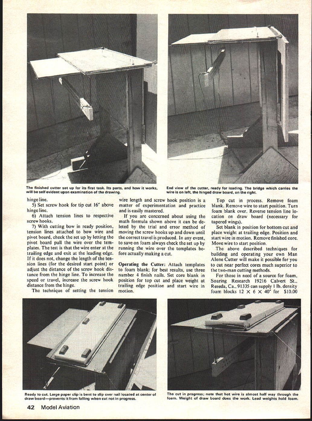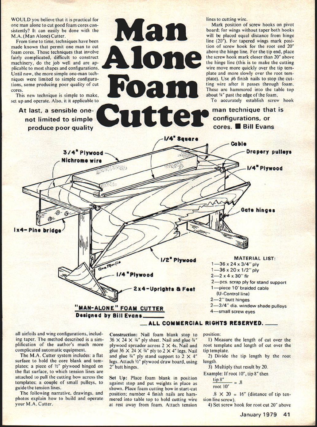 WOULD believe practical man alone cut good foam cores con sistently can easily done MAMan Alone Cutter time time techniques have made known permit man cut foam cores techniques involve fairly complicated difficult construct machinery job well ap plicable shapes configurations Until now simple one-man tech niques limited simple configura tions some producing poor quality cut cores new technique simple make set up operate Also it applicable Man Alone Foam lines cutting wire Mark position screw hooks pivot board wings taper both hooks will placed equal distance hinge line 20 tapered wings mark posi tion screw hook root end 20 above hinge line tip end place screw hook mark closer 20 above hinge line make cutting wire move quickly over tip tem plate slowly over root tem plate Use #6 finish nails stop cut ting wire after passes through foam hammered table top about edge foam accurately establish screw hook last sensible one-man technique produce poor quality Cuttercores U Bill Evans limited simpleconfigurations 114 Squsre Drapery pulleys l/4 Plywood / Gate hinges 1x4 Pine bridge LIST l/4Plywood 2x4Uprlghts 8 Feet MAN-ALONE FOAM CUTTER Designed Bill Evans........ l/2 Plywood MATERIAL 136 x 24 x 3/4 ply 136x20x 1/2 ply 22 x4x 30 fir 2pcs scrap ply stand support 1piece 10 braided cable U-Control line 22 butt hinges 23/4 dia window shade pulleys 4small screw eyes ALL COMMERCIAL RIGHTS RESERVED airfoils wing configurations includ ing taper method described sim plification authors much complicated automatic equipment MA Cutter system includes flat surface hold core blank tem plates piece ood hinged flat surface tension lines attached pull cutting bow across templates couple small pulleys guide tension lines following narrative drawings photos explain build operate MA Cutter Construction Nail foam blank stop 36 X 24 sheet Nail glue ood spreader across 2 X 4s Nail glue 36 X 24 x 2 gs Nail glue stand support 2 X 4 legs Attach ood draw board using 2 butt hinges Set Up Place foam blank position against stop put weights place shown Place foam cutting bow start-cut position number 4 finish nails ham mered table top hold cutting wire rest away foam Attach tension position 1 Measure length cut over root template length cut over tip template 2 Divide tip length root length 3 Multiply result 20 Example If root 10 tip 8 tip8 ot 10 8 20 istance tip ten sion line screw 4 Set screw hook root cut 20 above January 1979 41 hinge line 5 Set screw hook tip cut 16 above hinge line 6 Attach tension lines respective screw hooks 7 With cutting bow ready position tension lines attached bow wire pivot board check set up letting pivot board pull wire over tem plates test wire enter trailing edge exit leading edge does change length ten sion lines desired start point adjust distance screw hook dis tance hinge line increase speed travel increase screw hook distance hinge technique setting tension wire length screw hook position matter experimentation practice easily mastered concerned about using math formula shown above can de leted trial error method moving screw hooks up down until correct travel produced event save foam always check set up running wire over templates fore actually making cut Operating Cutter Attach templates foam blank best results use three number 4 finish nails Set core blank position top cut place weight trailing edge position start wire motion Top cut process Remove foam blank Remove wire start position Turn foam blank over Reverse tension line lo cation draw board necessary tapered wings Set blank position bottom cut place weight trailing edge Position start wire motion Remove finished core Move wire start position above described techniques building operating own Man Alone Cutter will make possible cut near perfect cores much superior two-man cutting methods need source foam Soaring Research 19216 Calvert St Reseda Ca 91335 can supply 1 lb density foam blocks 12 X 6 X 40 $1000 42 Model Aviation finished cutter Set U its first task Its parts works will self evident upon examination drawing End view cutter ready loading bridge carries wire left hinged draw board right Ready cut Large paper clip bent slip over nail located center draw boardprevents falling cut progress cut progress note hot wire almost half way through foam Weight draw board does work Lead weights hold foam Another view cutting wire draw line cable pulley wire atop Strip lightly nailed board aligns block foam post paid CAresidents ad 6% shown January February March 1978 issues ModelAviation recommended see top Cut completed photo Having exited foam hot wire stops against nails three-part article Foam Technioues hold alignment strip cutter also turns out tapered cores accurately Weight hinged draw board pulls heated wire through foam Note cable runs over drapery pulley corner board