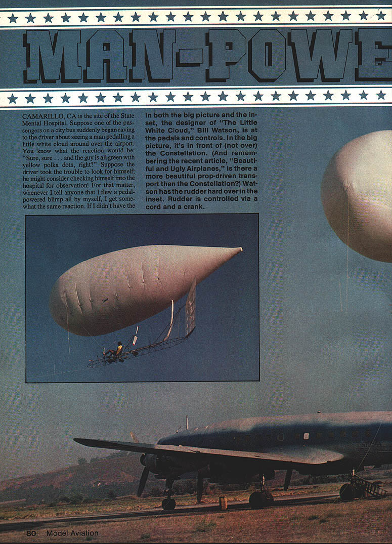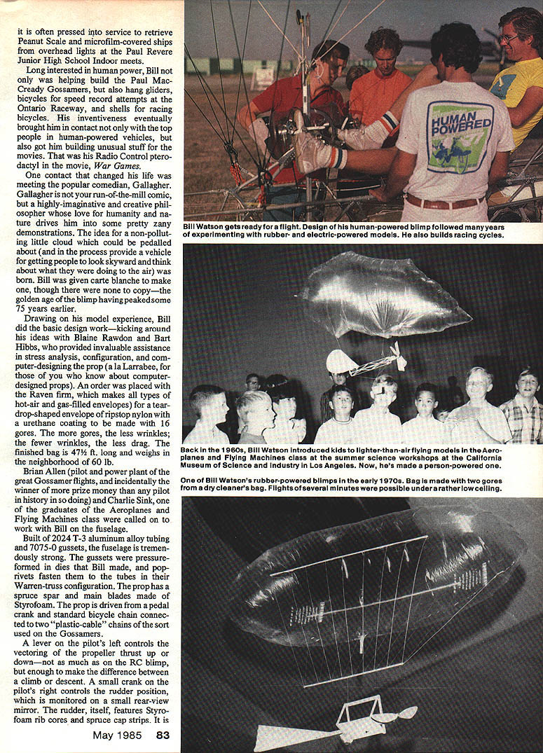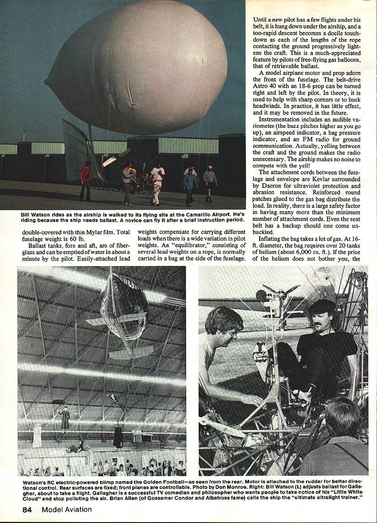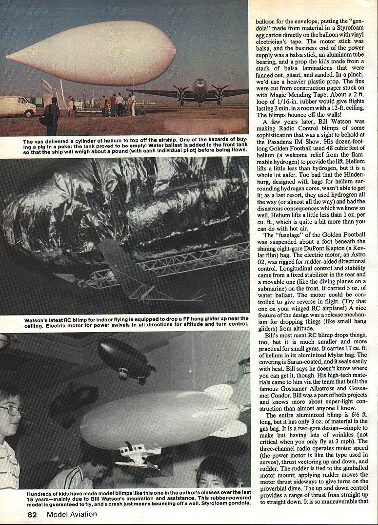 NO OCR TEXT NO OCR TEXT balloon envelope putting gon dola made material Styrofoam egg carton directly balloon vinyl electricians tape motor stick balsa business end power supply balsa stick aluminum tube bearing prop kids made stack balsa laminations fanned out glued sanded pinch wed use heavier plastic prop fins cut construction paper stuck Magic Mending Tape About 2-ft loop 1/16-in rubber would give flights lasting 2 min aroom 12-ft ceiling blimps bounce off walls few years later Bill Watson making Radio Control blimps some sophistication sight behold Pasadena IM Show dozen-footlong Golden Football used 48 cubic feet helium welcome relief flam mable hydrogen provide lift Helium lifts little less hydrogen whole lot safer Too bad Hinden burg designed bags helium sur rounding hydrogen cores wasnt able get last resort used hydrogren way almost way disastrous consequences know well Helium lifts little less 1 oz per cu ft quite bit can hot air fuselage Golden Football suspended about foot beneath shining eight-gore DuPont Kapton Key lar film bag electric motor Astro 02 rigged rudder-aided directional control Longitudinal control stability came fixed stabilizer rear movable like diving planes submarine front carried 5 oz water ballast motor could con trolled give reverse flight Try winged RC airplane nice feature design release mechan ism dropping things like small hang gliders altitude Bills rcent RC blimp drops things too much smaller practical small gyms carries 17 cu ft helium its aluminized Mylar bag oovering Saran-coated seals easily heat Bill says doesnt know can get though high-tech mate rials came him via team built famous Gossamer Albatross Gossa mer Condor Bill apart both projects knows about super-light oon struction almost anyone know entire aluminized blimp 6 ft long has 3 oz material gas bag two-gore designsimple make having lots wrinkles critical fly 3 mph three-channel radio operates motor speed power motor like type used servos thrust vectoring up down rudder rudder tied gimballed motor mount applying rudder moves motor thrust sideways give turns proverbial dime up down control provides range thrust straight up straight down maneuverable 82 Model Aviation van delivered cylinder helium top off airship hazards ot buy ing pig poke tank proved empty Water ballast added front tank ship will weigh about pound individual pilot before being flown Watsons latest RC blimp Indoor flying equipped drop PF hang glider up nearthe ceiling Electric motor power swivels directions altitude turn control miunareds kids have made model blimps like authors classes over last 15 yearsmainly due Bill Watsons inspiration assistance rubber-powered model guaranteed fly crash just means bouncing off wall Styrofoam gondola often pressed illto service retrieve Peanut Scale microfilm-covered ships overhead lights Paul Revere Junior High School Indoor meets Long interested human power Bill helping build Paul Mac Cready Gossamers also hang gliders bicycles speed record attempts Ontario Raceway shells racing bicycles inventiveness eventually brought him contact top people human-powered vehicles also got him building unusual stuff movies Radio Control ptero dactyl movie War Games contact changed life meeting popular comedian Gallagher Gallagher run-of-the-mill comic highly-imaginative creative phil osopher love humanity na ture drives him some pretty zany demonstrations idea non-pollut ing little cloud could pedalled about process provide vehicle getting people look skyward think about what doing air born Bill given carte blanche make though copythe golden age blimp having peaked some 75 years earlier Drawing model experience Bill did basic design workkicking around ideas Blame Rawdon Bart Hibbs provided invaluable assistance stress analysis configuration com puter-designing prop ala Larrabee know about computerdesigned props An order placed Raven firm makes types hot-air gas-filled envelopes tear drop-shaped envelope ripstop nylon urethane coating made 16 gores gores less wrinldes fewer wrinides less drag finished bag 47 ft long weighs neighborhood 60 lb Brian Allen pilot power plant great Gossamer ffights incidentally winner prize money pilot history doing Charlie Sink graduates Aeroplanes Flying Machines class called work Bill fuselage Built 2024 T-3 aluminum alloy tubing 7075-0 gussets fuselage tremen dously strong gussets pressureformed dies Bill made poprivets fasten tubes Warren-truss configuration prop has spruce spar main blades made Styrofoam prop driven pedal crank standard bicycle chain connec ted two plastic-cable chains sort used Gossamers lever pilots left controls vectoring propeller thrust up downnot much RC blimp enough make difference between climb descent small crank pilots right controls rudder position monitored small rear-view mirror rudder itself features Styro foam rib cores spruce cap strips May1985 83 F- NW Back 19605 Bill Watson introduced kids lighter-than-air flying models Aero planes Plying Machines class summer science workshops California Museum Science industry Los Angeles Now hes made person-powered Bill Watsons rubber-powered blimps early 1970s Bag made two gores drycleaners bag Flightsof several mlnuteswere possible undera ratheriowceiling Bill Watson rides airship walked its flying site Camarillo Airport Hes riding because ship needs bailast novice can fly after brief Instruction period double-covered thin Mylar film Total weights compensate carrying different fuselage weight 60 lb loads wide variation pilot Ballast tanks fore aft fiber- weights An equilibrator consisting glass can emptied water about several lead weights rope normally minute pilot Easily-attached lead carried bag side fuselage Until new pilot has few flights under belt hung down under airship too-rapid descent becomes docile touch down lengths rope contacting ground progressively light ens craft much-appreciated feature pilots free-flying gas balloons retrievable ballast model airplane motor prop adorn fro