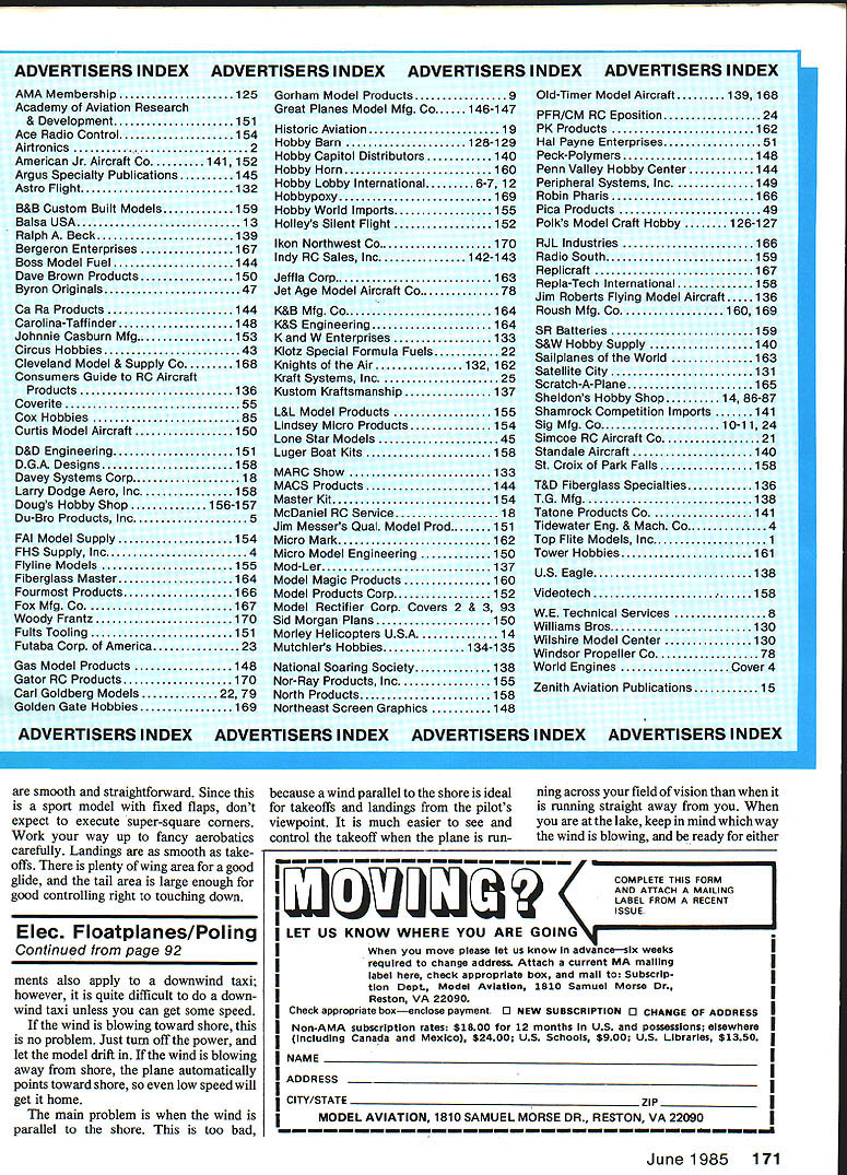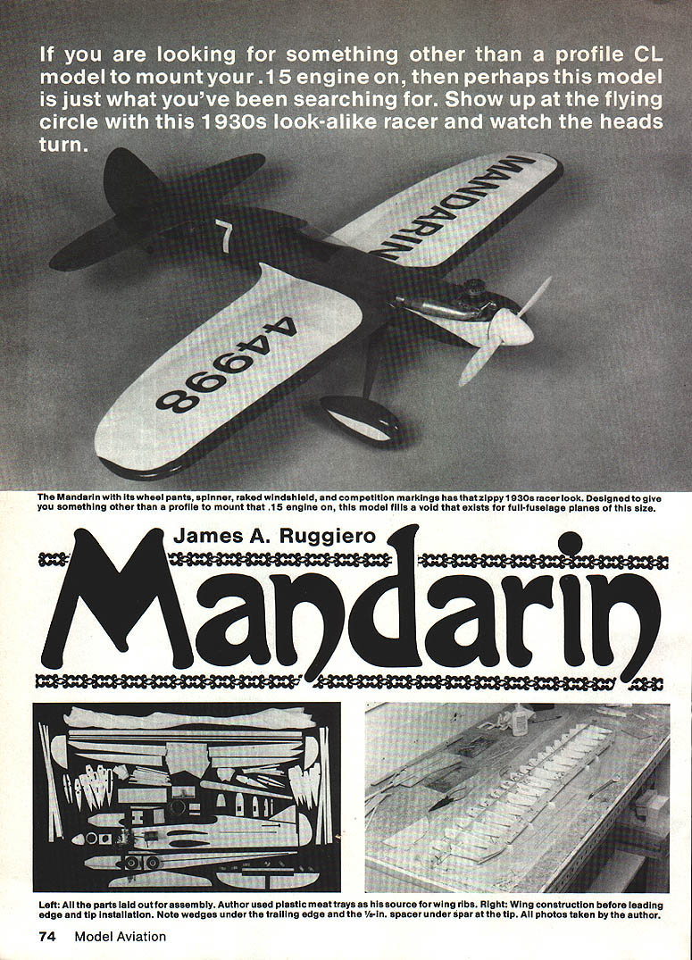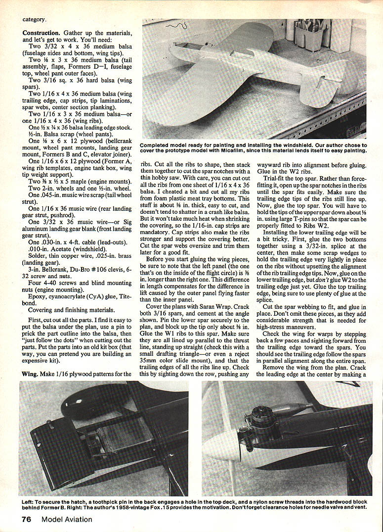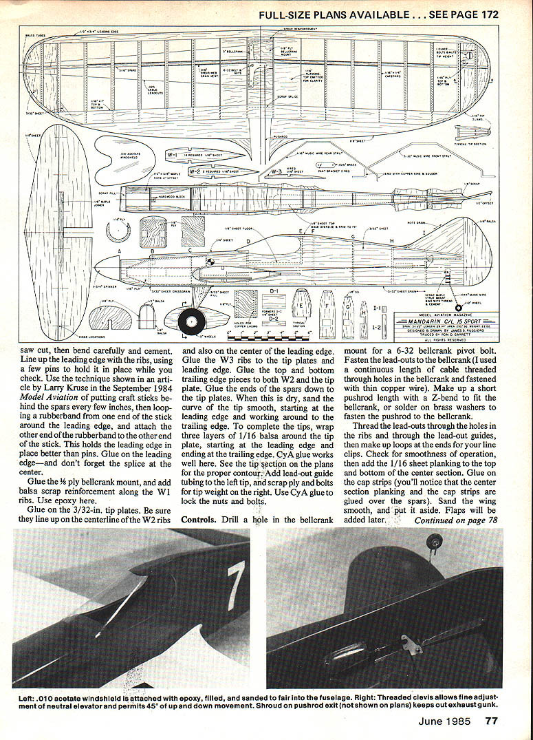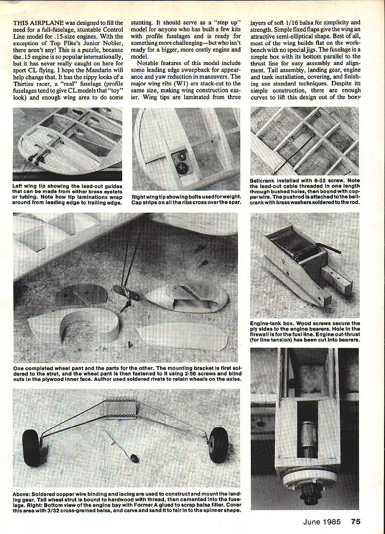 - jnaarin i pants spinner raked windshield competition marl. something other profile mount 15 engine model fills James Ruggiero has racer look Designed full-fuselage planes Left parts laid out assembly Author used plastic meat trays source wing ribs Right Wing construction before leading edge tip installation Note wedges under trailing edge 1/a-in spacer under spar tip photos taken author 74 Model Aviation THIS AIRPLANE designed fill need full-fuselage stuntable Control Line model 15-size engines exception Top Flites Junior Nobler arent puzzle because 15 engine popular internationally has never really caught sport CL flying hope Mandarin will help change has zippy looks Thirties racer real fuselage profile fuselages tend give CL models toy look enough wing area some stunting should serve step up model anyone has built few kits profile fuselages ready something challengingbut isnt ready bigger costly engine model Notable features model include some leading edge sweepback appear ance yaw reduction maneuvers major wing ribs Wi stack-cut same size making wing construction eas ier Wing tips laminated three layers soft 1/16 balsa simplicity strength Simple fixed flaps give wing attractive semi-elliptical shape Best of wing builds flat work bench no special jigs fuselage simple box its bottom parallel thrust line easy assembly align ment Tail assembly landing gear engine tank installation covering finish ing use standard techniques Despite its simple construction enough curves lift design out boxy Above Soldered copper wire binding lacing used construct mount land ing gear Tail wheel strut bound hardwood thread cemented fuse lage Right Bottom view engine bay Former glued scrap balsa filler Cover area 3/32 cross-gralned balsa carve sand itto fair spinner shape Belicrank installed 6-32 screw Note lead-out cable threaded length through bushed holes bound cop perwire pushrod lsattachedtothe bellcrank brass washers soldered rod Engine-tank box Wood screws secure ply sides engine bearers Hole firewall forthe fuel line Engine out-thrust line tension has cut bearers June1985 75 L5fl wing tip snowing lead-out guides can made either brass eyelets tubing Note tip laminations wrap Rightwlngtipshowingboltsusedforweight around leading edge trailing edge Cap strips ribs cross overthe spar completed wheel pant parts other mounting bracket first sol dered strut wheel pant fastened using 2-56 screws blind nuts plywood inner face Author used soldered rivets retain wheels axles category Construction Gather up materials lets get work Youll need Two 3/32 x 4 x 36 medium balsa fuselage sides bottom wing tips Two x 36 medium balsa tail assembly flaps Formers DI fuselage top wheel pant outer faces Two 3/16 sq x 36 hard balsa wing spars Two 1/16 x 4 x 36 medium balsa wing trailing edge cap strips tip laminations spar webs center section planking Two 1/16 x 3 x 36 medium balsaor 1/16 x 4 x 36 wing ribs 36 balsa leading edge stock -in Balsa scrap wheel pants x 12 plywood bellcrank mount wheel pant mounts landing gear mount Formers B C elevator joiner 1/16x6x 12 plywood Former wing rib templates engine tank box wing tip weight support Two 5 maple engine mounts Two 2-in wheels -in wheel 045-in music wire scrap tail wheel strut 1/16 x 36 music wire rear landing gear strut pushrod 3/32 x 36 music wireor Sig aluminum landing gear blank front landing gear strut 030-in x 4-ft cable lead-outs 010-in Acetate windshield Solder thin copper wire 025-in brass landing gear 3-in Bellcrank Du-Bro #106 clevis 632 screw nuts Four 4-40 screws blind mounting nuts engine mounting Epoxy cyanoacrylate CyA glue Tite bond Covering finishing materials First cut out parts find easy put balsa under plan use pm prick part outline balsa just follow dots cutting out parts Put parts old kit box way can pretend building expensive kit Wing Make 1/16 plywood patterns ribs Cut ribs shape stack together cut spar notches thin hobby saw care can cut out ribs sheet 1/16 x 4 x 36 balsa cheated bit cut ribs foam plastic meat tray bottoms stuff about k easy cut doesnt tend shatter crash like balsa wont take much heat shrinking covering 1/16-in cap strips mandatory Cap strips also make ribs stronger support covering better Cut spar webs oversize trim later good fit Before start gluing wing pieces sure note left panel thats inside flight circle /8 longer thanthe right difference length compensates difference lift caused outer panel flying faster inner panel Cover plans Saran Wrap Crack both 3/16 spars cement angle shown Pin lower spar securely plan block up tip about Wi ribs spar Make sure lined up parallel thrust line standing up straight check small drafting triangleor reject 35mm color slide mount trailing edges ribs line up Check sighting down row pushing wayward rib alignment before gluing Glue W2 ribs Trial-fit top spar Rather forcefitting open up spar notches ribs until spar fits easily Make sure trailing edge tips ribs still line up Now glue top spar will have hold tips upper spar down about using large T-pins spar can properly fitted Ribs W2 Installing lower trailing edge will bit tricky First glue two bottoms together using 3/32-in splice center make some scrap wedges hold trailing edge very lightly place ribs upsetting alignment rib trailing edge tips Now glue lower trailing edge dont glue W2 trailing edge just yet Glue top trailing edge being sure use plenty glue splice Cut spar webbing fit glue place Dont omit pieces add considerable strength needed high-stress maneuvers Check wing warps stepping back few paces sighting forward trailing edge toward spars should see trailing edge follow spars parallel alignment along entire span Remove wing plan Crack leading edge center making Left secure hatch toothpick pin back engages hole top deck nylon screw threads hardwood block behind Former B Right authors 1 gsa-vIntage Fox 15 provIdes motivation Dont forget clearance holes needlevalve vent 76 Model Aviation Completed model ready painting Installing windshield 