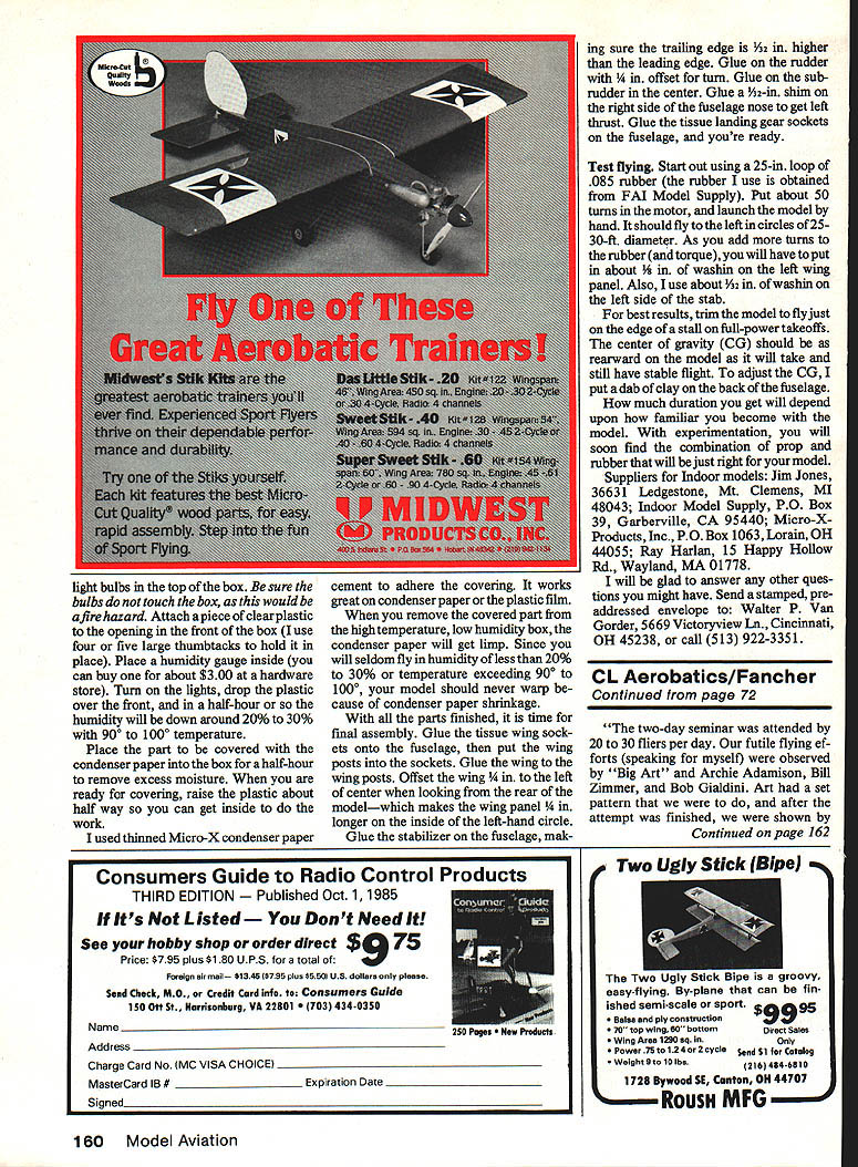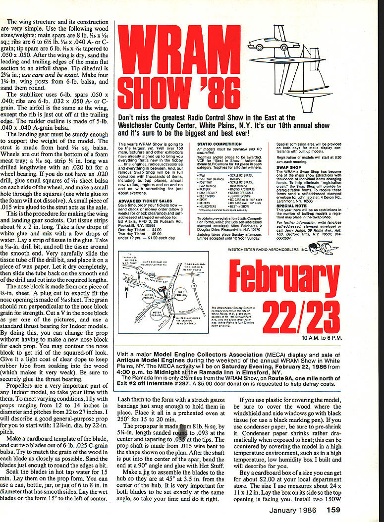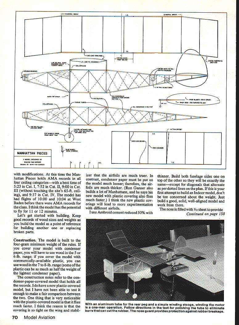 Our author poses two versions model older right covered condenser paperand holds several AMA Indoor records newer left covered plastic writing has yet chance prove Itself competition article intended give starting point com bining yourown pieces fora strong competitor popular class Indoor models Manha ttan Pieces EWalter P Van Gorder whove never built models manner before what completed set cardboard templates looks like use careful record size weight building materials makes easy build duplicate modelsor spare parts repairs 68 Model Aviation cope varying conaitions ana iying sites Wait has assortment props range 1 2-1 4-in dimeterand 22-27-in pitch Prop building detailed text Three views nose block thrust bearing assembly V-notch allows different props fitted avoiding necessity building nose biockforeach prop Affixthethrust bearing glue coatthe nose biockwith cleardopeto prevent rubber lube absorption THIS ARTICLE written hope Manhattan Cabin class Indoor Rubber will become popular has especially since specifications now AMA rule book have Ed Whitten thank intro ducing Manhattan Cabin about 10 years ago tryingto create class having mixture Scale pure duration con cepts did see Manhattan Cabin model until 1977 have hooked ever since original rules have held up very well two changes time written model can now covered plastic film no microfilm con denser paper covering allowed original rules other change allows use 1 2-in-maxinium-span stabilizer great improvement model presented like Indoor models made up pieces various models have tried Thats named Manhattan Pieces first Man hattan copy John Triolos Sky scraper bit heavy five grams second model copy Jim Millers Cabin Fever started mix ing parts came up another model did much better latest version uses John Triolos fuselage modification rear hook position Jim Millers wing modified swept-back tips John Triolos prop Left holder four national records version covered condenser paper has hardware prove its worth Right same design covered plastic has appearance being covered microfilm microfilm covering allowed Manhattan rules January1986 69 Completed bare bones ready covering may wish experiment both types covering discussed text see best suits flying style site conditions OIOOOOAL EREAK01060501- WR Lvoowpos oo CE AND TE ROWWOs CELLOP5ARE TISSUE Tunes 1~ II /AsOSA7WWsLl5W WOOl 02AOAOOLO FOE CUT WOOLS FROMOI5WIFW A/ILK FOAM SWAT TRAY ALOE WOWEL OTBOWO i1p TE 5TLOWJt/WOTOEsTO I/0F15 OFFSET KOEOAO5AR5 .OOOIOSO5ISS -I Te modifications time Man hattan Pieces holds AMA records four ceiling categorieswith best time 523 Cat 752 Cat II 900 Cat III touching sites 65-ft ceil ing 937 Cat IV model has flights 1000 1004 West Baden before AMA records class think model has potential fly 11 12 minutes Lets get started building Keep good records wood sizes weights build model point reference building another replacing broken parts Construction model built four-gram minimum weight rules cover model condenser paper will have use wood 5 6-lb range cover model commercially-available plastic can use wood 7 8-lb range some plastic can much half weight lightest condenser paper construction notes refer con denser-paper-covered model holds records have new plastic-oovered model have able test enough make fair oomparison between two thing very noticeable plastic-covered model flies much faster think reason covering tight wing stabil izer airfoils much truer contrast condenser paper must put model much looser therefore air foils much thicker Rod Ganser also builds lot Manhattans says new model plastic covering also flies much faster think new plastic cov erings will lead experimentation different airfoils use Ambroid cement reduced 50% thinner Build both fuselage sides top other will exactly sameexcept diagonals alternate per dotted lines plan first attempt build Indoor model dont too concerned about weight Just build good solid well-aligned model work nose filled with Y32 sheet provide Continued page 158 70 Model Aviation 11W SO WE POST ROIWEES TOIT / 0000 lISA OTOOT cEcLOAse VW SO FiLL AIL IIWWL WITS IIAE00TWA FLTWOWLRR -I //I /V15EIA ALIOATUSDS KALLD0000WSLO kODROOFFE 505 SOURS IWSOITSOTTEDUSES c ASIAW 06 PROp WOW O5STWEREDTO005 _________ALL WAAORAL5 Wol/Of MANHATTAN PIECES MOCEL DESIOFEED ST WALTER TAM SOSOER aluminum tube rear peg simple winding stooge winding motor one-man operation Foiiow directions text polishing tube eliminate burrs can cut rubber nose guard provides protection against rubber breakage PILOTS TS RIOR TS T THE MOST SUPERIOR PILOT FIGURE ON THE MARKET LIGHTEST WEIGHT MOST REALISTIC AVAILABLE GIVE YOUR PLANE PILOT. FOR YOUR NEWEST OLDEST OR NEXT CREATION R YOURS TODAY FULL FIGURES CIVILIANWWII MILITARY 1/3 Scale $19951/5 Navy $1395 1/4ScaIe14951/6AAF1195 1 /5 Scale 1295 Plus 1/12 Scale895$250 shipping 1/12 Chopper 895each figure KNIGHTS OF THE AIR 1400 Rte 22 West Friendship MD 21794 301-489-5050 FL Y ME WINDSOCK Attaches antenna mast clips clips included Available frequency colors Give frequency number order 5u&H 65 Foreign orders add S8H $150 Calif Residents add 6% tax Product Brochure Free order Jet fla Products PO Box 484 Lake Elsinore CA 92330 714 674-1151 help underwrite costs host club may win very first contest will gain experience enjoy camaraderie associated competition Soon will winning share trophies ten sion meet never goes completely away us make mistakes contests natural No ridi culed seriously rate foul up crash front friends least riding thing personal injury remote injured pride give competition try may like us become hopelessly hooked Found Lost model has found near site La Junta SAM Champs no description model other number A9663 model AMA has no record number its yours can claim model identifying Nels C Larsen Jr 601 Elm St Lajunta CO 81050 Clarence Haught 3226 Honeysuckle Dr Coeur dAlene ID 83814 New AIIy/Mcllrath Continued page 67 accurate word satisfactory tried too optimistic past great-sounding plans like almost al ways went 