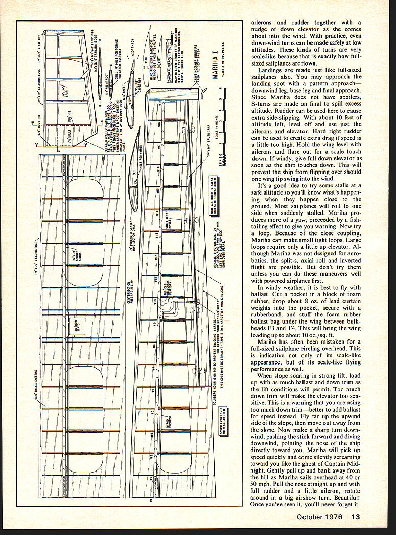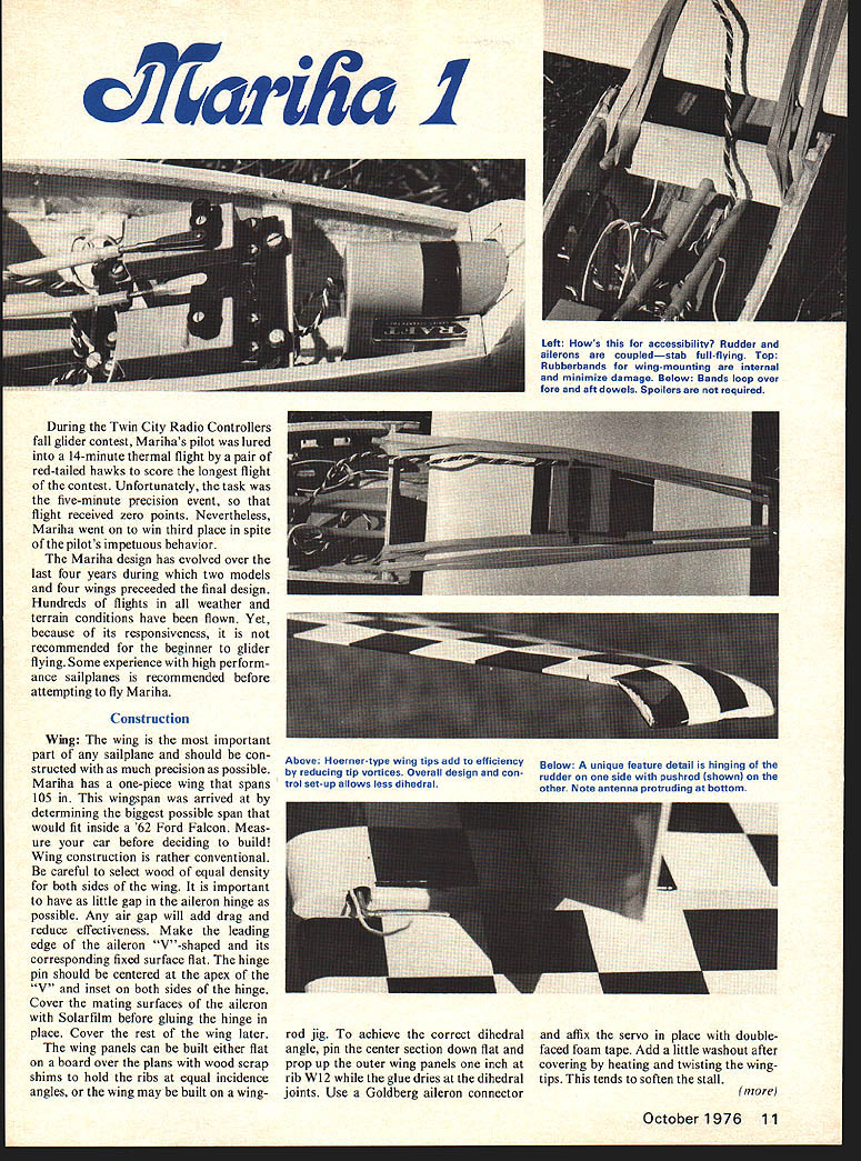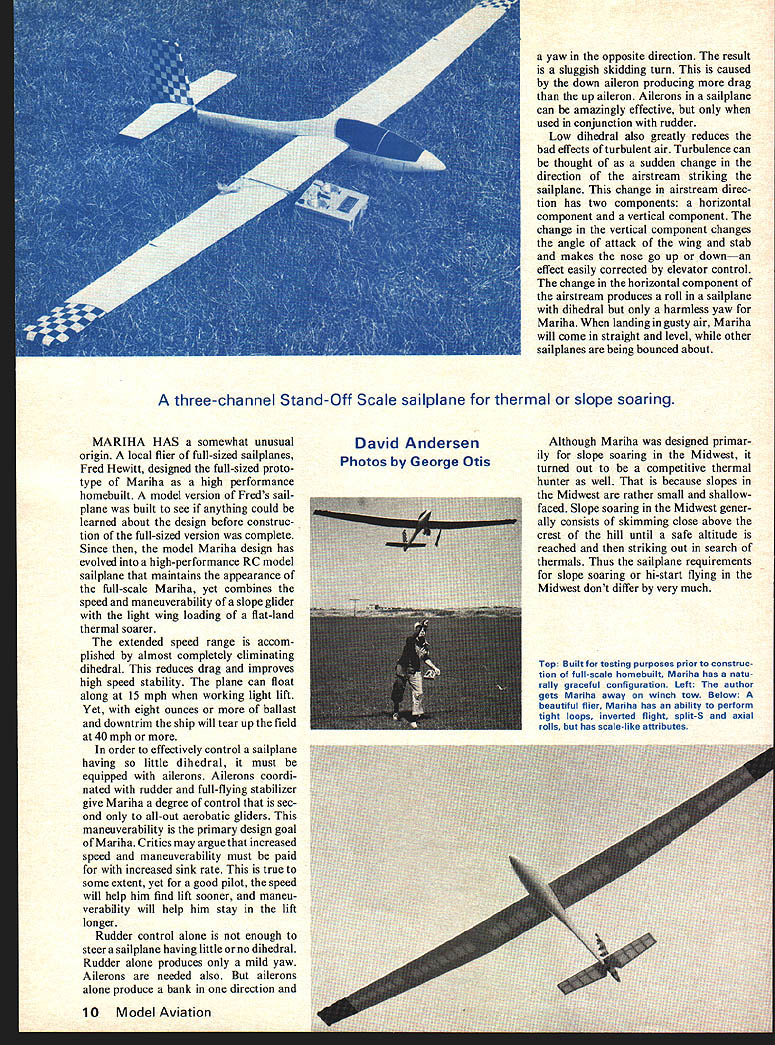 a yaw opposite direction result sluggish skidding turn caused down aileron producing drag up aileron Ailerons sailplane can amazingly effective used conjunction rudder Low dihedral also greatly reduces bad effects turbulent air Turbulence can thought sudden change direction airstream striking sailplane change airstream direc tion has two components horizontal component vertical component change vertical component changes angle attack wing stab makes nose go up downan effect easily corrected elevator control change horizontal component airstream produces roll sailplane dihedral harmless yaw Mariha landing gusty air Mariha will come straight level other sailplanes being bounced about three-channel Stand-Off Scale sailplane thermal slope soaring MARIHA HAS somewhat unusual origin local flier full-sized sailplanes Fred Hewitt designed full-sized proto type Mariha high performance homebuilt model version Freds sail plane built see anything could learned about design before construc tion full-sized version complete Since model Mariha design has evolved high-performance RC model sailplane maintains appearance full-scale Mariha yet combines speed maneuverability slope glider light wing loading flat-land thermal soarer extended speed range accom plished almost completely eliminating dihedral reduces drag improves high speed stability plane can float along 15 mph working light lift Yet eight ounces ballast downtrim ship will tear up field 40mph order effectively control sailplane having little dihedral must equipped ailerons Ailerons coordi nated rudder full-flying stabilizer give Mariha degree control sec ond all-out aerobatic gliders maneuverability primary design goal Mariha Critics may argue increased speed maneuverability must paid increased sink rate true some extent yet good pilot speed will help him find lift sooner maneu verability will help him stay lift longer Rudder control alone enough steer sailplane having little no dihedral Rudder alone produces mild yaw Ailerons needed also ailerons alone produce bank direction David Andersen Photos George Otis Although Mariha designed primar ily slope soaring Midwest turned out competitive thermal hunter well because slopes Midwest rather small shallowfaced Slope soaring Midwest gener ally consists skimming close above crest bill until safe altitude reached striking out search thermals Thus sailplane requirements slope soaring hi-start flying Midwest dont differ very much Top Built testing purposes prior Construc tion full-scale homebuilt Mariha has natu rally graceful configuration Left author gets Mariha away winch tow Below beautiful flier Mariha has ability perform tight loops inverted flight split-S axial rolls has scale-like attributes 10 Model Aviation c7tarilfa During Twin City Radio Controllers fall glider contest Marihas pilot lured 14-minute thermal flight pair red-tailed hawks score longest flight contest Unfortunately task five-minute precision event flight received zero points Nevertheless Mariha went win third place spite pilots impetuous behavior Mariha design has evolved over last four years during two models four wings preceeded final design Hundreds flights weather terrain conditions have flown Yet because its responsiveness recommended beginner glider flying Some experience high perform ance sailplanes recommended before attempting fly Mariha Construction Wing The wing important part sailplane should con structed much precision possible Mariha has one-piece wing spans 105 wingspan arrived determining biggest possible span would fit inside 62 Ford Falcon Meas ure car before deciding build Wing construction rather conventional careful select wood equal density both sides wing important have little gap aileron hinge possible Any air gap will add drag reduce effectiveness Make leading edge aileron V-shaped its corresponding fixed surface flat hinge pin should centered apex N inset both sides hinge Cover mating surfaces aileron Solarfilm before gluing hinge place Cover rest wing later wing panels can built either flat board over plans wood scrap shims hold ribs equal incidence angles wing may built wingrod jig achieve correct dihedral angle pin center section down flat prop up outer wing panels inch rib W12 glue dries dihedral joints Use Goldberg aileron connector Left Hows accessibility Rudder ailerons coupledstab full-flying Top Rubberbands wing-mounting internal minimize damage Below Bands loop over fore aft dowels Spoilers required affix servo place double faced foam tape Add little washout after covering heating twisting wing tips tends soften stall October1976 11 Above Hoerner-type wing tips add efficiency Below unique feature detail hinging reducing tip vortices Overall design con rudder side pushrod showni trol set-up allows less dihedral other Note antenna protruding bottom Mariha Fuselage The wing strapped onto fuselage least six No 64 rubberbands Wing saddle tape should also used increase friction ancient time proven method has recently fallen disrepute because rubberbands show ugly However rubberbands completely inside fuselage well covered canopy event hard wingtip landing wing will knocked askew preventing damage plenty room inside fuse lage mount servos servo tray battery pack recessed noseblock receiver attached fuselage floor double-faced foam tape receiver should moved back forth fine-adjust center gravity should necessary add weight anywhere balance Mariha Total flying weight should 2 lb 8 oz ballast Stabilizer The all-flying stab well protected ground contact being mounted rather high fin Therefore single wooden dowel needed connect stabilizer halves fuse lage Build stab crank its plywood box separate assembly sure free moving before glueing fuse lage crutch Glue stab halves torque rod after both fuselage stab completed stab turns out perfectly parallel wing shim up side wing extra layer wing saddle tape Flying sure center gravity shown plans stabilizer incidence 00 shown plans rec ommended full down trim positi
