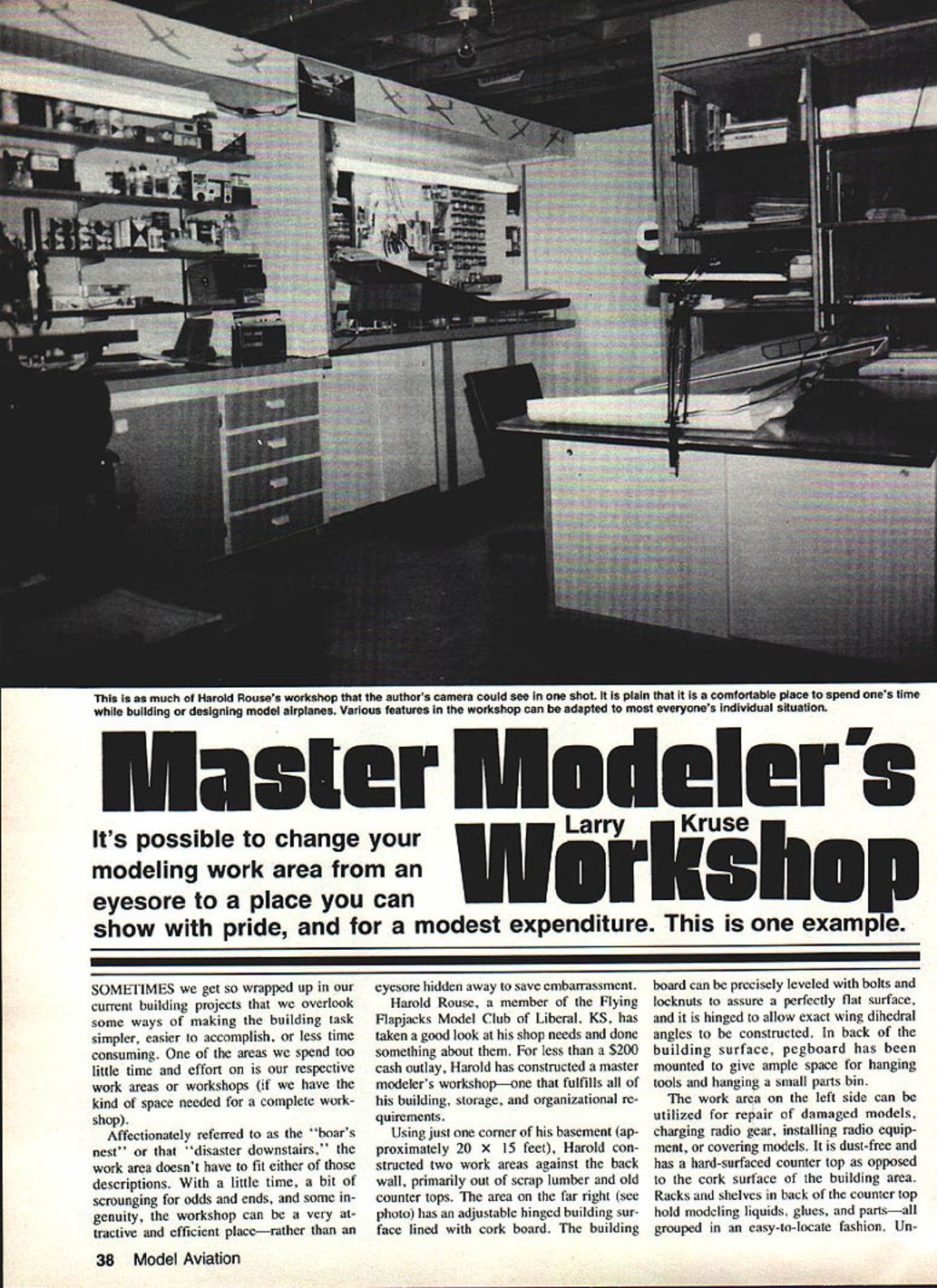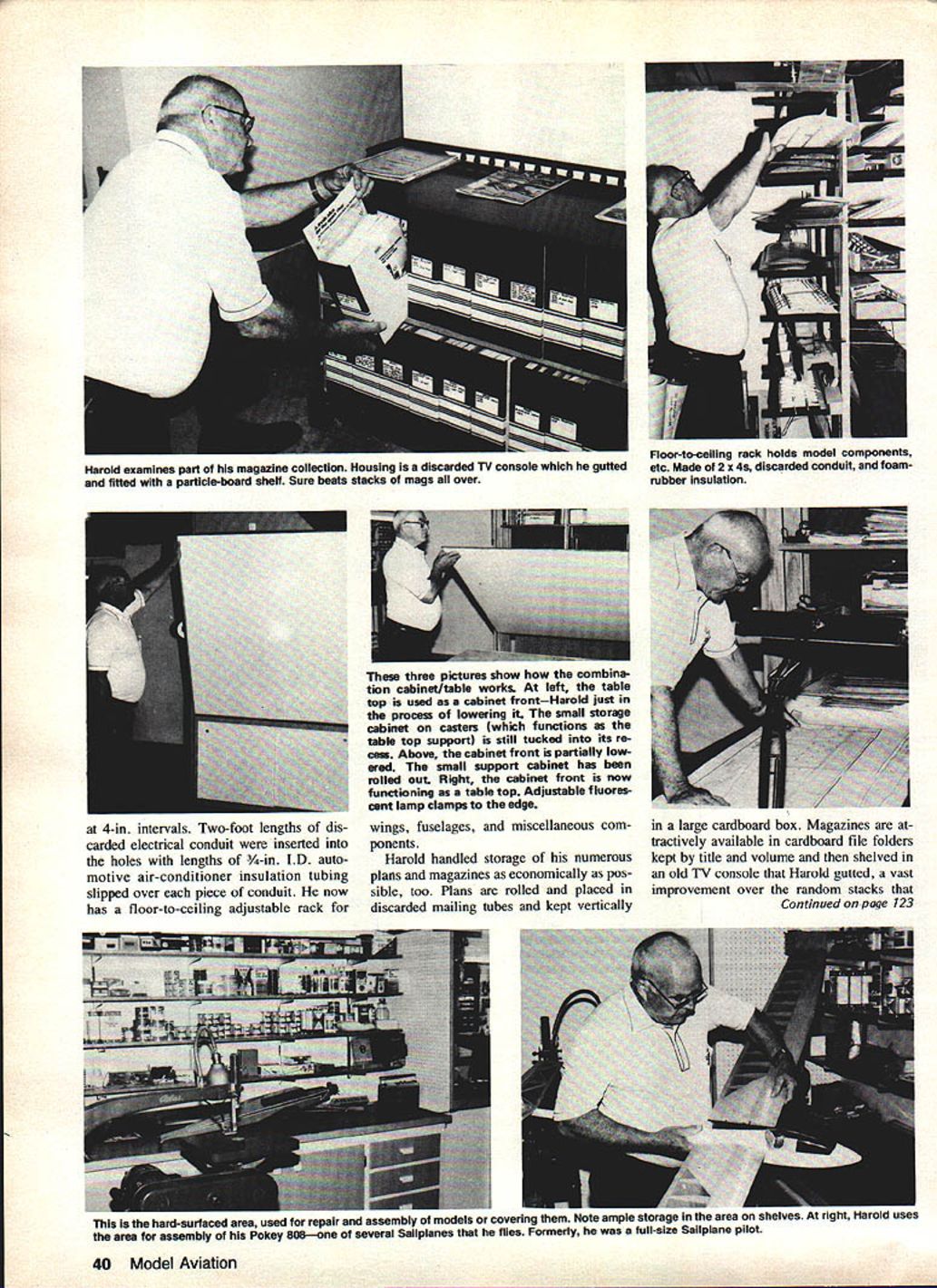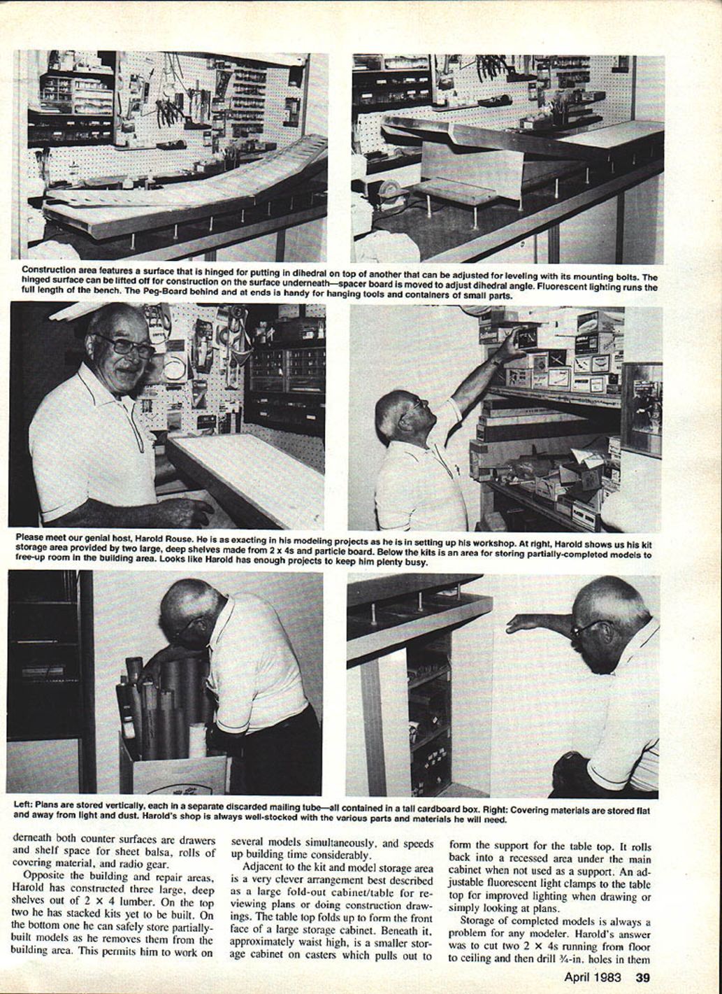 This much Harold Rouses workshop authors camera could see snot ia piain srai comlonaule place spend ones time building designing model airplanes Various features workshop can adapted everyones individual situation ur eyesore place can show pride modest expenditure SOMETIMES get wrapped up current building projects overlook some ways making building task simpler easier accomplish less time consuming areas spend too little time effort respective work areas workshops have kind space needed complete work shop Affectionately referred boars nest disaster downstairs work area doesnt have fit either descriptions little time bit scrounging odds ends some genuity workshop can very tractive efficient placerather eyesore hidden away save embarrassment Harold Rouse member Flying Flapjacks Model Club Liberal KS has taken good look shop needs done something about less $200 cash outlay Harold has constructed master modelers workshopone fulfills building storage organizational re quirements Using just corner basement ap proximately 20 X 15 feet Harold con structed two work areas against back wall primarily out scrap lumber old counter tops area far right see photo has adjustable hinged building sur face lined cork board building board can precisely leveled bolts locknuts assure perfectly flat surface hinged allow exact wing dihedral angles constructed back building surface pegboard has mounted give ample space hanging tools hanging small parts bin work area left side can utilized repair damaged models charging radio gear installing radio equip ment covering models dust-free has hard-surfaced counter top opposed cork surface building area Racks shelves back counter top hold modeling liquids glues partsall grouped easy-to-locate fashion Un38 Model Aviation Its possible change modeling work area N S derneath both counter surfaces drawers shelf space sheet balsa rolls covering material radio gear Opposite building repair areas Harold has constructed three large deep shelves out 2 X 4 lumber top two has stacked kits yet built bottom can safely store partiallybuilt models removes building area permits him work several models simultaneously speeds up building time considerably Adjacent kit model storage area very clever arrangement best described large fold-out cabinet/table re viewing plans doing construction draw ings table top folds up form front face large storage cabinet Beneath approximately waist high smaller stor age cabinet casters pulls out form support table top rolls back recessed area under main cabinet used support An ad justable fluorescent light clamps table top improved lighting drawing simply looking plans Storage completed models always problem modeler Harolds answer cut two 2 X 4s running floor ceiling drill 3/4-in holes April 1983 39 Construction area features surface hinged putting dihedral top another can adjusted leveling its mounting bolts hinged surface can lifted off Construction surface underneathspacer board moved adjust dihedral angle Fluorescent lighting runs full length bench Peg-Board behind ends handy hanging tools containers small parts j Please meet genial host Harold Rouse exacting modeling projects setting up workshop right Harold shows us kit storage area provided two large deep shelves made 2 x 4s particle board Below kits area storing partially-completed models free-up room building ares Looks like Harold has enough projects keep him plenty busy Left Plans stored vertically separate discarded mailing tubeall contained tall cardboard box Right Covering materials stored flat away light dust Harolds shop always well-stocked various parts materials will need Floor-to-ceiling rack holds model components etc Made 2 x 4s discarded conduit foamrubber Insulation 4-in intervals Two-foot lengths dis- wings fuselages miscellaneous corn- large cardboard box Magazines atcarded electrical conduit inserted ponents tractively available cardboard file folders holes lengths -in ID auto- Harold handled storage numerous kept title volume shelved motive air-conditioner insulation tubing plans magazines economically pos- old TV console Harold gutted vast slipped over piece conduit now sible too Plans rolled placed improvement over random stacks has floor-to-ceiling adjustable rack discarded mailing tubes kept vertically Continued page 123 40 Model Aviation Harold examines part magazine collection Housing Isa discarded TV console gutted fitted particle-board shelf Sure beats stacks mags over three pictures show combine tion cabinet/table works left table top used cabinet frontHarold just procern lowering small storage cabinet casters functions table top support still tucked its re oem Above cabinet front partially low ered small support cabinet has rolled out Right cabinet front now functioning table top Adjustable fluores cent lamp clamps edge hard-suraceo area used repair assembly models covering Note ample storage area snelves r rEyuI r ares assembly Pokey 808one several Sailpianes flies Formerly full-size Sailplane pilot transmitters pulse-timing 15 ins s less industry standard should able plug servo youve got set assuming have right plug first-look standpoint system looks like exceptionally good value money great way sample new RC channels five years hard work members AMA Frequency Committee have provided Kudos Tower Hobbies having guts ready Day George M Myers 70 Froehlich Farm Rd Hicksvjlle NY 11801 Hinges/Peltz Continued page 36 sand away just enough surface between piece tubing allow piece covering material slide through easily See Fig 8 covering plane control sur faces run covering material around piece tubing completely enclose will hide its aluminum color will also serve strengthen hinge con siderably See Fig 9 make optional gap seals suggested high-movement surfaces large bevel angles follow steps Cut piece drafting Mylar use acetate will buckle changing hu midity temperature exact length control surface twice de sired width strip width deter mined moving control surface its maximu