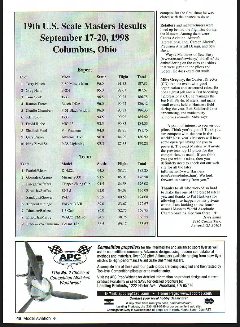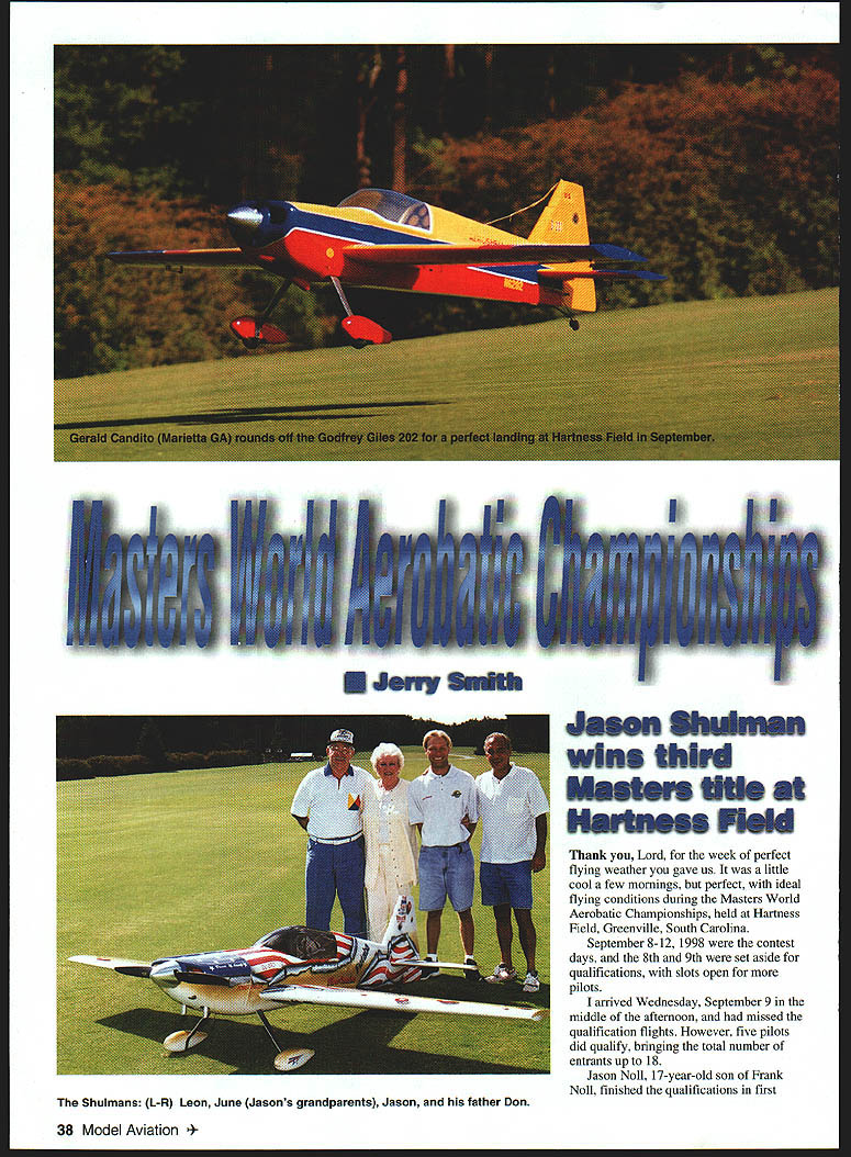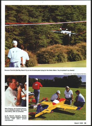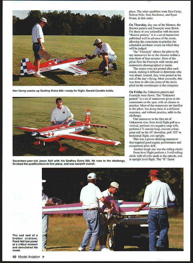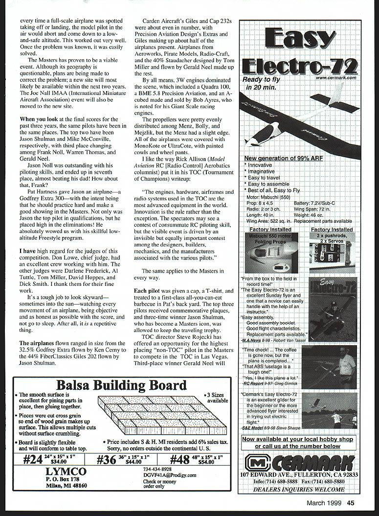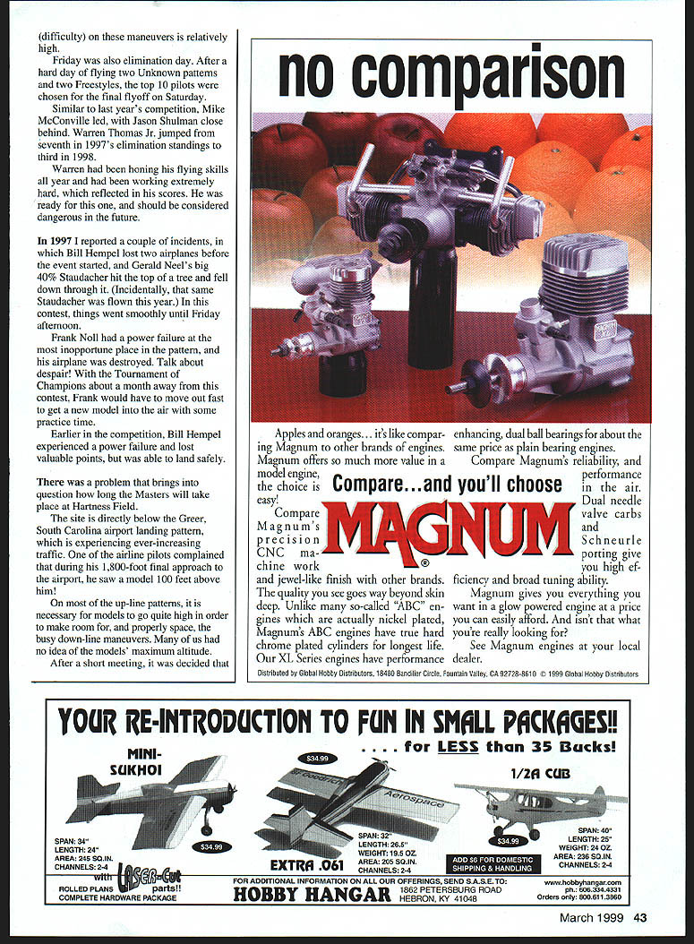 - -S Mm UU M NM Thank Lord week perfect flying weather gave us little cool few mornings peffect ideal flying conditions during Masters World Aerobatic Championships held Hartness Field Greenville South Carolina September 8-12 1998 contest days 8th 9th set aside qualifications slots open pilots arrived Wednesday September 9 middle afternoon missed qualification flights However five pilots did qualify bringing total number entrants up 18 Jason Noll 17-year-old son Frank Noll finished qualifications first 38 Model Aviation mans L-R Leon June Jasons grandparents Jason father Don March 1999 39 Ransom Fairchild Del Ray Beach FL low inverted pass trying limbo ribbon Yes picked up cleanly Photou tha author Granhic Daujan Carla Kunz Mike Gregory Contest Director ran excellent contest event orderly no confusion L-R Dennis Gergits Bobby Wilson Gerhard Stejskal discuss Carden CAP 232s power requirements place other qualifiers Ken Cerny Nelson Hole Stan Stockman Ryan Evans order Thursday day Masters Known pattern Freestyle flown unfamiliar term Known pattern set maneuvers published well advance event allowing contestants practice scheduled aerobatic events will judged Freestyle allows pilot fly maneuvers chooses within time limit four minutes Most pilots flew Freestyle smoke maneuvers choreographed music scores posted after round making difficult determine ahead Instead posted end days flying Most assuredly done alleviate some stress piled scorekeeper computer Friday Unknown pattern Freestyle flown Unknown pattern set maneuvers given contestants spot no chance practice Most maneuvers familiar pilots doing different sequence practice adds challenge maneuver first set Unknowns level flight pull vertical perform two negative snap rolls perform 5/ outside loop execute fourpoint roll 450 downline pull 1350 horizontal flight exit upright power-draining maneuver required good engine performance exceptional pilot skill Another tough rolling circle level flight perform 3-roll rolling circle rolls made outside exit upright level flight K factor sad end broken airplane Frank Noll lost power critical moment demolished model 40 Model Aviation Cerny cranks up Godfrey Extra 300ready flight Gerald Candito holds Seventeen-year-old Jason Noll Godfrey Extra 300 rose challenge finished qualifications first place seventh overall Runnerup Michael McConviIIe 40% Carden CAP 232 Covering paint job done Jerry Worth Griffith IL March 1999 41 Gerald Neels Mooresville NC Tom Miller-designed Staudacher takeoff Gerald placed third competition difficulty maneuvers relatively high Friday also elimination day After hard day flying two Unknown patterns two Freestyles top 10 pilots chosen final flyoff Saturday Similar last years competition Mike McConville led Jason Shulman close behind Warren Thomas Jr jumped seventh 1997s elimination standings third 1998 Warren honing flying skills year working extremely hard reflected scores ready should considered dangerous future 1997 reported couple incidents Bill Hempel lost two airplanes before event started Gerald Neels big 40% Staudacher hit top tree fell down through Incidentally same Staudacher flown year contest things went smoothly until Friday afternoon Frank Noll power failure inopportune place pattern airplane destroyed Talk about despair Tournament Champions about month away contest Frank would have move out fast get new model air some practice time Earlier competition Bill Hempel experienced power failure lost valuable points able land safely problem brings question long Masters will take place Hartness Field site directly below Greer South Carolina airport landing pattern experiencing ever-increasing traffic airline pilots complained during 1800-foot final approach airport saw model 100 feet above him up-line patterns necessary models go quite high order make room properly space busy down-line maneuvers us no idea models maximum altitude After short meeting decided no comparison Apples oranges. its like compar ing Magnum other brands engines Magnum offers much value model engine choice enhancing dual ball bearings about same price plain bearing engines Compare Magnums reliability performance air Dual needle valve carbs easy Compare Magnums I4UM precision 33 CNC ma chine work jewel-like finish other brands quality see goes way beyond skin deep Unlike so-called ABC en gines actually nickel plated Magnums ABC engines have true hard chrome plated cylinders longest life XL Series engines have performance dealer Distributed Global Hobby Disiribuiers 18490 Bandilier Circle Fountain Volley CA 92728-itlO Global Hobby Diatributora Schneurle porting give high ef ficiency broad tuning ability Magnum gives everything want glow powered engine price can easily afford isnt what youre really looking See Magnum engines local YOUR RE-INTRODUCTION TO FUN IN SMALL PACKAESI .. LESS 35 Backs 1/Ut CUB SPAN 40 LENGTH 25 WEIGHT 24 OZ AREA 236 SQIN CHANNELS 2-4 FOR ADOmONAL INFORMATION ON ALL OUR OFFERINGS SEND SASE TOwwwhobbyhangarcom ROLLED PLANSpartSUNjDDUJ hIAbJIAfl 1862 PETERSBURG ROADph 6063344331 COMPLETE HARDWARE PACKAGE55JUfI ON KY 41048Orders 8006113860 March 1999 43 Compare.and youll choose SPAN 34 LENGTH 24 AREA 245 SQIN CHANNELS 2-4 c Aa time full-scale airplane spotted taking off landing model pilot air would abort come down lowand-safe altitude worked out very well Once problem known easily solved Masters has proven viable event Although its geography questionable plans being made correct problem new site will likely available within next two years Joe Nall IMAA International Miniature Aircraft Association event will also moved new site look final scores past three years same pilots have same places top two have Jason Shulman Mike McConville respectively third place changing among Frank Noll Warren Thomas Gerald Neel Jason Noll outstanding piloting skills ended up seventh place almost beating dad about Frank Pat Hartness gave Jason airplanea Godfrey Extra 300with intent being should practice ha
