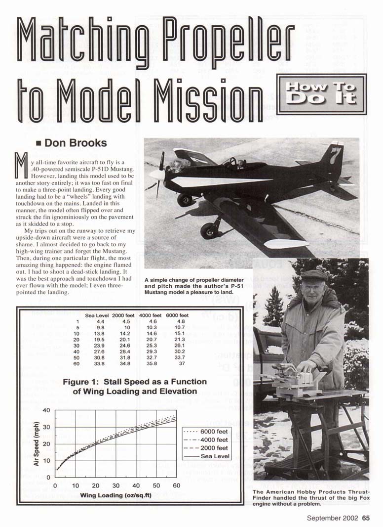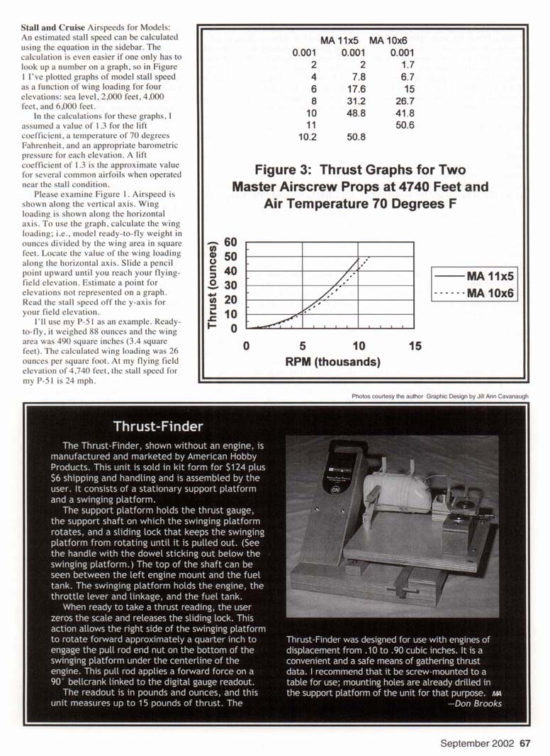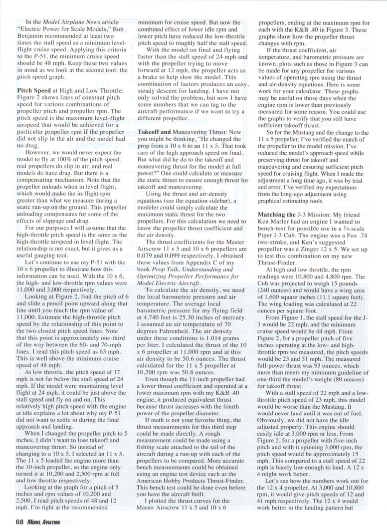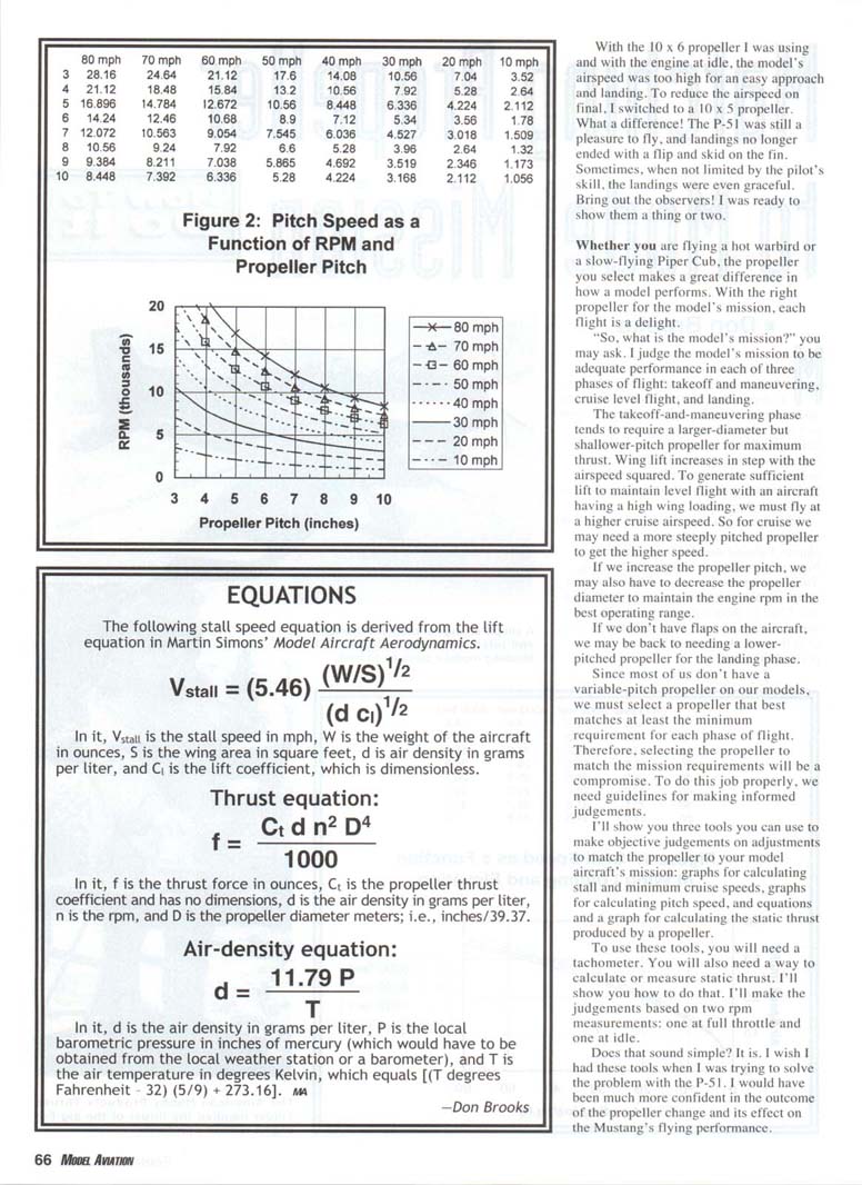 My all-time favorite aircraft to fly is a .40-powered semiscale P-51D Mustang. However, landing this model used to be another story entirely; it was too fast on final to make a three-point landing. Every good landing had to be a "wheels" landing with touchdown on the mains. Landed in this manner, the model often flipped over and struck the fin ignominiously on the pavement as it skidded to a stop. My trips out on the runway to retrieve my upside-down aircraft were a source of shame. I almost decided to go back to my high-wing trainer and forget the Mustang. Then, during one particular flight, the most amazing thing happened: the engine flamed out. I had to shoot a dead-stick landing. It was the best approach and touchdown I had ever flown with the model; I even three-pointed the landing. A simple change of propeller diameter and pitch made the author's P-51 Mustang model a pleasure to land. The American Hobby Products Thrust-Finder handled the thrust of the big Fox engine without a problem. With the 10x6 propeller I was using and with the engine at idle, the model's airspeed was too high for an easy approach and landing. To reduce the airspeed on Final, I switched to a 10x5 propeller. What a difference! The P-51 was still a pleasure to fly, and landings no longer ended with a flip and skid on the fin. Sometimes, when not limited by the pilot's skill, the landings were even graceful. Bring out the observers! I was ready to show them a thing or two. Whether you are flying a hot Warbird or a slow-flying Piper Cub, the propeller you select makes a great difference in how a model performs. With the right propeller for the model's mission, each flight is a delight. "So. what is the model's mission?" you may ask. I judge the model's mission to be adequate performance in each of three phases of flight: takeoff and maneuvering, cruise level flight, and landing. The takeoff-and-maneuvering phase tends to require a larger-diameter but shallower-pitch propeller for maximum thrust. Wing lift increases in step with the airspeed squared. To generate sufficient lift to maintain level flight with an aircraft having a high wing loading, we must fly at a higher cruise airspeed. So for cruise we may need a more steeply pitched propeller to get the higher speed. If we increase the propeller pitch, we may also have to decrease the propeller diameter to maintain the engine rpm in the best operating range. If we don't have flaps on the aircraft, we may be back to needing a lower-pitched propeller for the landing phase. Since most of us don't have a variable-pitch propeller on our models, we must select a propeller that best matches at least the minimum requirement for each phase of flight. Therefore, selecting the propeller to match the mission requirements will be a compromise. To do this job properly, we need guidelines for making informed judgements. I'll show you three tools you can use to make objective judgements on adjustments to match the propeller to your model aircraft's mission: graphs for calculating stall and minimum cruise speeds, graphs for calculating pitch speed, and equations and a graph for calculating the static thrust produced by a propeller. To use these tools, you will need a tachometer. You will also need a way to calculate or measure static thrust. I'll show you how to do that. I'll make the judgements based on two rpm measurements: one at full throttle and one at idle. Does that sound simple? It is. I wish I had these tools when I was trying to solve the problem with the P-51. I would have been much more confident in the outcome of the propeller change and its effect on the Mustang's flying performance. Stall and Cruise Airspeeds for Models: An estimated stall speed can be calculated using the equation in the sidebar. The calculation is even easier if one only has to look up a number on a graph, so in Figure 1 I've plotted graphs of model stall speed as a function of wing loading for four elevations: sea level. 2,000 feet, 4,000 feet, and 6,000 feet. In the calculations for these graphs, I assumed a value of 1.3 for the lift coefficient, a temperature of 70 degrees Fahrenheit, and an appropriate barometric pressure for each elevation. A lift coefficient of 1.3 is the approximate value for several common airfoils when operated near the stall condition. Please examine Figure 1. Airspeed is shown along the vertical axis. Wing loading is shown along the horizontal axis. To use the graph, calculate the wing loading; i.e., model ready-to-fly weight in ounces divided by the wing area in square feet. Locate the value of the wing loading along the horizontal axis. Slide a pencil point upward until you reach your flying-field elevation. Estimate a point for elevations not represented on a graph. Read the stall speed off the y-axis for your field elevation. I'll use my P-51 as an example. Ready-to-fly, it weighed 88 ounces and the wing area was 490 square inches (3.4 square feet). The calculated wing loading was 26 ounces per square foot. At my flying field elevation of 4,740 feet, the stall speed for my P-51 is 24 mph. In the Model Airplane News article "Electric Power for Scale Models," Bob Benjamin recommended at least two times the stall speed as a minimum level-flight cruise speed. Applying this criteria to the P-51, the minimum cruise speed should be 48 mph. Keep these two values in mind as we look at the second tool: the pitch speed graph. Pitch Speed at High and Low Throttle: Figure 2 shows lines of constant pitch speed for various combinations of propeller pitch and propeller rpm. The pitch speed is the maximum level-flight airspeed that would be achieved for a particular propeller rpm if the propeller did not slip in the air and the model had no drag. However, we would never expect the model to fly at 100% of the pitch speed; real propellers do slip in air, and real models do have drag. But there is a compensating mechanism. Note that the propeller unloads when in level flight, which wo