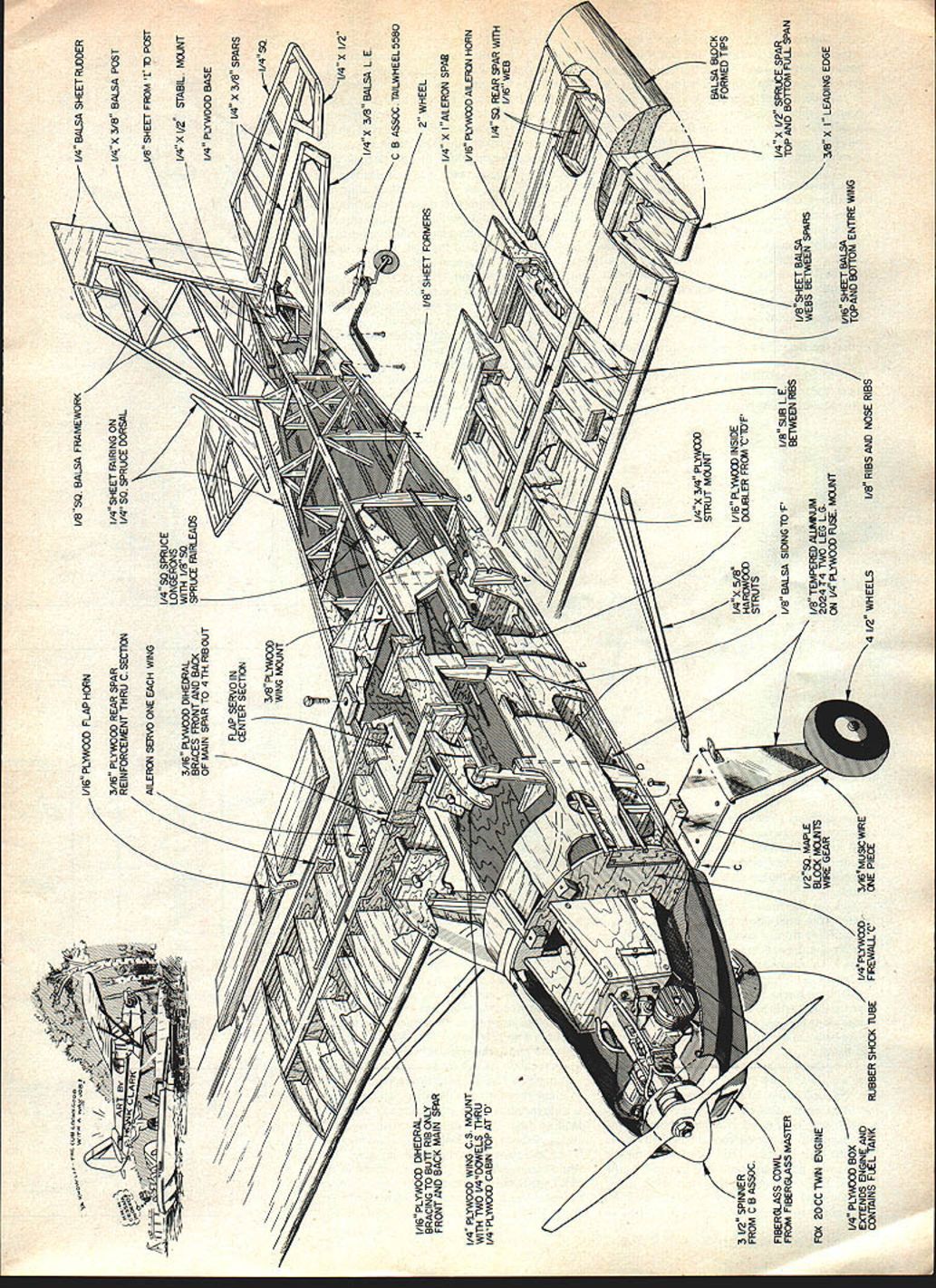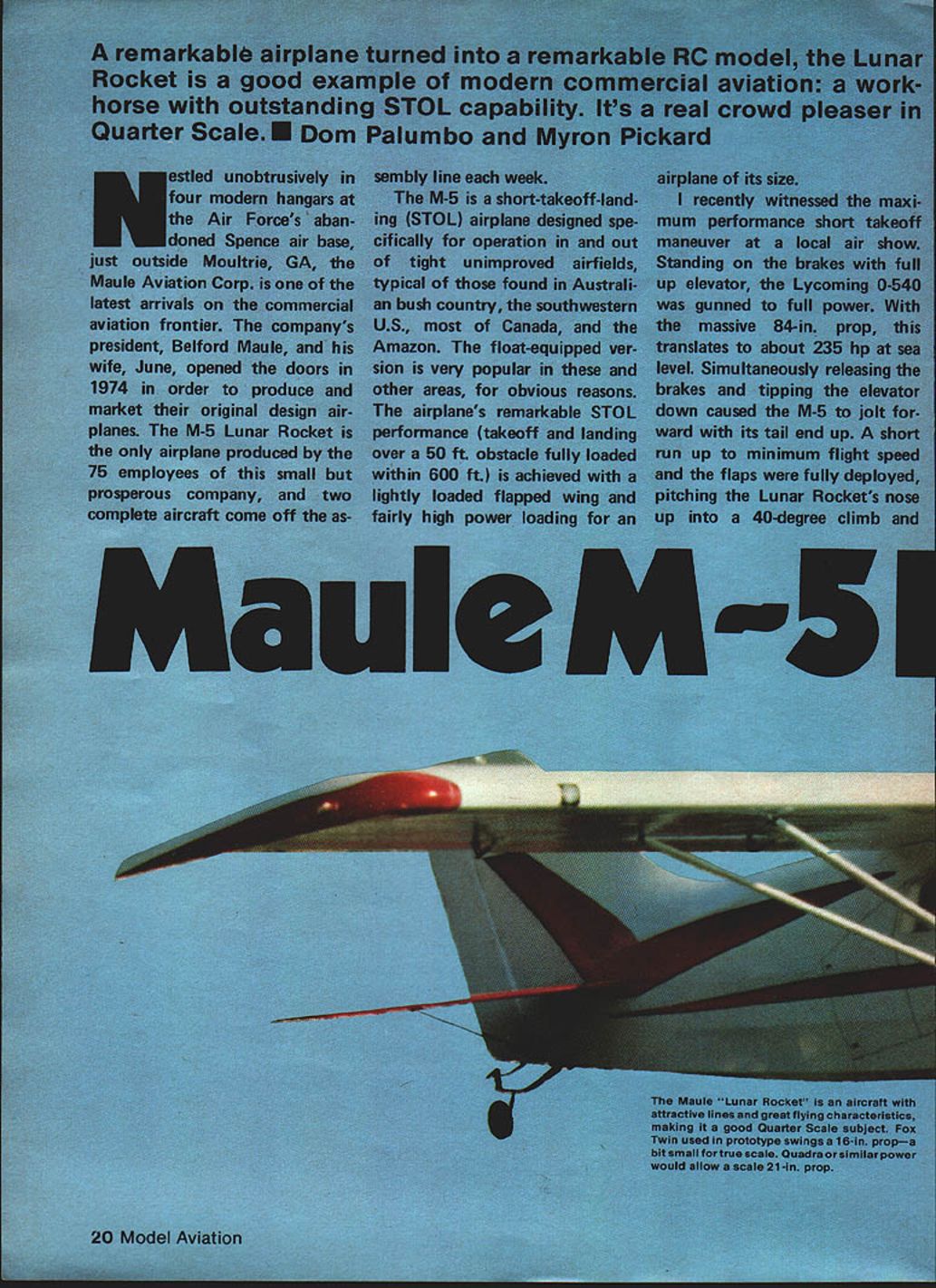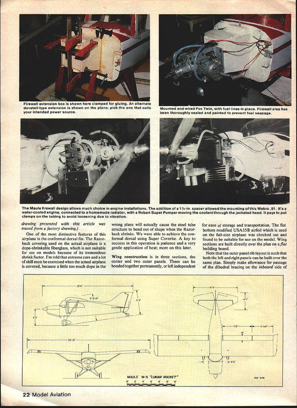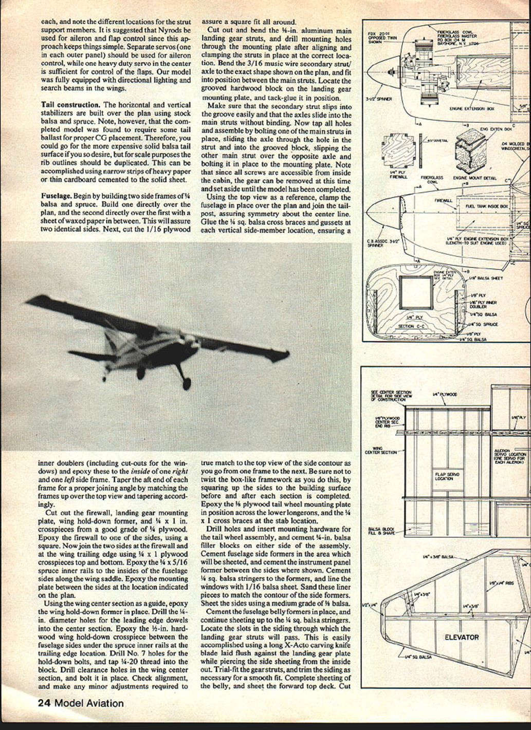 NO OCR TEXT NO OCR TEXT drawing presented article traced factory drawing distinctive features airplane conformal dorsal fin Razor back covering used actual airplane dope-shrinkable fiberglass suitable use models because its tremendous shrink factor Im told extreme care lot skill must exercised actual airplane covered because little too much dope wrong place will actually cause steel tube structure bend out shape Razor back shrinks able achieve con formal dorsal using Super Coverite key success operation patience very gentle application heat later Wing construction three sections center two outer panels can bonded together permanently left independent j ease storage transportation flat bottom modified USA35B airfoil used full-size airplane checked out found suitable use model Wing sections built directly over plan aflat building board Note outer panel rib layout such both left right panels can built over same plan Simply make allowance passage dihedral bracing inboard side 64 30 0 MAULE M-5 UVIAR ROCKEr 024 ea02 10 9 47 765 I-V4 K HO 7 22 Model Aviation 1-irewa xoension oox is crc ciampeu Tar gluing nn e dovetaii-sype extension snown plans pick tnat suits intended power source n wu1 IuCi lines Ifl piece 1-irewail ares nas thoroughly waled painted prevent fuel seepage Maule firewall design allows much choice engine installations addition 1 1/2-in spacer allowed mounting Webra gi Its water-cooled engine connected homemade radiator Robart Super Pumper moving coolant through jacketed head pays put clamps tubing avoid loosening due vibration 340 5/61 1/16 PLYWOOD FLAP HORN 3/16 PLYWOOD REAR SPAR REINFORCEMENT THRU C SECTION AILERON SERVO ONE EACH WING 3/16 PlYWOOD DIHEORAL BRACES FRONT AND BACK OF MAIN SPAR TO 4TH ROQUT FLAP SERVO IN CENTER SECTION 3/8 PLYWOOD WING MOUNT I/BSO BALSA FRAMEWORK 1/4 SHEET RIdRING ON 1/4 50 SPRUCE DORSAL 1/4 BALSA SHEET RIDDER 3/8 BALSA POST v8 SHEET FROM 1 ID POST II/4 X 1/2 STABIL MOUNT 1/4 PLYWOOD BASE III/4 X 3/B SPARS SO N 1/16 PLYWOOD DIHEDRAL BRACING TO BUTT RIB ONLY FRONT AND BACK MAIN S1R 1/4 PLYWOOD WING CS MOUNT WITh TIMO V4DOWELS THRU /4 PLYWOOD CABIN TOP AT D FIBERGLASS COWL FROM FIBERGLASS MASTER FOX 20CC TININ ENGINE 1/4 PLYWOOD BOX EXTENDS ENGINE AND CONTAINS FLEL TANKRUBBER SHOCK TIJBE x 1/4 PLY WODO FREWALLC STRUT MOUNT 1/16 PLYO INSIDE DOUBLER FROM CIOF CI/4X 5/B 1/8 BALSA SIDINGTOF 1/2 E BLOCK MOJhSI/B TEMPERED ALLR*IUM WIRE GEAR2024T4TIAl0 LEGLG ON v4 PLYWOOD FUSE MOIJNT 3A6 MUSE WIRE ONE PIECE 4 /2 WHEELS i 1/8 SHEET FORMERS -A ~7J X /2 I/4X 3/B BALSA L E C B ASSOC 1ILWHEEL 5580 2 WHEEL 1/4 X AIERON SPAR 1/16 PLYWOOD AILERIJ HORN 1/4 SQ REAR SPAR WITh 1/16 WEB N BALSA BLOCK FORMED TIPS SHEET BALSA 2 SPRUCE SPAR I/B SUB LETOP AND BOTTOM FULL SPAN RIBS]\ WEBS BETWEEN /\ X LEADING EDGE / 1/16 SHEET BALSA / AND ITTOM ENTIRE WING 1/8 RIBS AND NOSE RIBS note different locations strut support members suggested Nyrods used aileron flap control since ap proach keeps things simple Separate servos outer panel should used aileron control heavy duty servo center sufficient control flaps model fully equipped directional lighting search beams wings Tail construction horizontal vertical stabilizers built over plan using stock balsa spruce Note however com pleted model found require some tail ballast proper CG placement Therefore could go expensive solid balsa tail surface desire scale purposes rib outlines should duplicated can accomplished using narrow strips heavy paper thin cardboard cemented solid sheet Fuselage Begin building two side frames balsa spruce Build directly over plan second directly over first sheet waxed paper between will assure two identical sides Next cut 1/16 plywood inner doublers including cut-outs win dows epoxy inside right left side frame Taper aft end frame proper joining angle matching frames up over top view tapering accord ingly Cut out firewall landing gear mounting plate wing hold-down former crosspieces good grade ood Epoxy firewall sides using square Now join two sides firewall wing trailing edge using plywood crosspieces top bottom Epoxy 16 spruce inner rails insides fuselage sides along wing saddle Epoxy mounting plate between sides location indicated plan Using wing center section guide epoxy wing hold-down former place Drill diameter holes leading edge dowels center section Epoxy h-in hard wood wing hold-down crosspiece between fuselage sides under spruce inner rails trailing edge location Drill No 7 holes hold-down bolts tap -20 thread block Drill clearance holes wing center section bolt place Check alignment make minor adjustments required assure square fit around Cut out bend -in aluminum main landing gear struts drill mounting holes through mounting plate after aligning clamping struts place correct loca tion Bend 3/16 music wire secondary strut/ axle exact shape shown plan fit position between main struts Locate grooved hardwood block landing gear mounting plate tack-glue position Make sure secondary strut slips groove easily axles slide main struts binding Now tap holes assemble bolting main struts place sliding axle through hole strut grooved block slipping other main strut over opposite axle bolting place mounting plate Note since screws accessible inside cabin gear can removed time set aside until model has completed Using top view reference clamp fuselage place over plan join tailpost assuring symmetry about center line Glue alsa cross braces gussets vertical side-member location ensuring true match top view side contour go frame next sure twist box-like framework squaring up sides building surface before after section completed Epoxy ood tail wheel mounting plate position across lower longerons x 1 cross braces stab location Drill holes insert mounting hardware tail wheel assembly cement -in balsa filler blocks either side assembly Cement fuselage side formers area will sheeted cement instrument panel former between sides shown Cement sq balsa stringers formers line windows 1/16 balsa sheet Sand liner pieces 