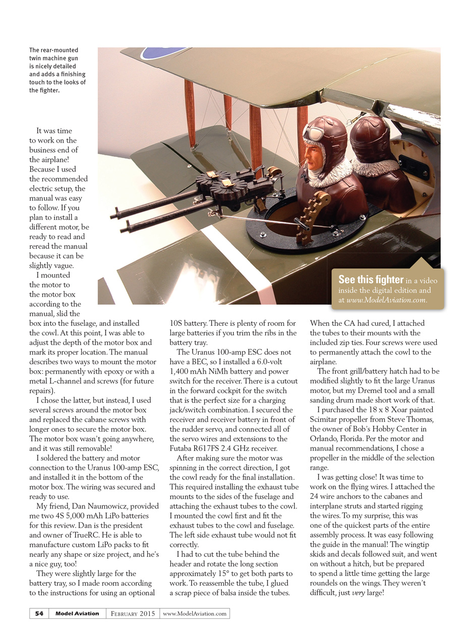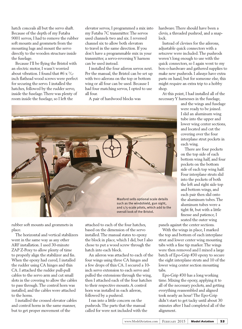 The 1/5-scale WW I pilot busts and the twin machine gun were installed next, along with the forward gun sight. The forward-facing pilot needed a scrap of wood to secure him into place, while the rear-facing gunner was secured to the lower gun mounting ring. It was nice to have plenty of Du-Bro servo screws on hand!