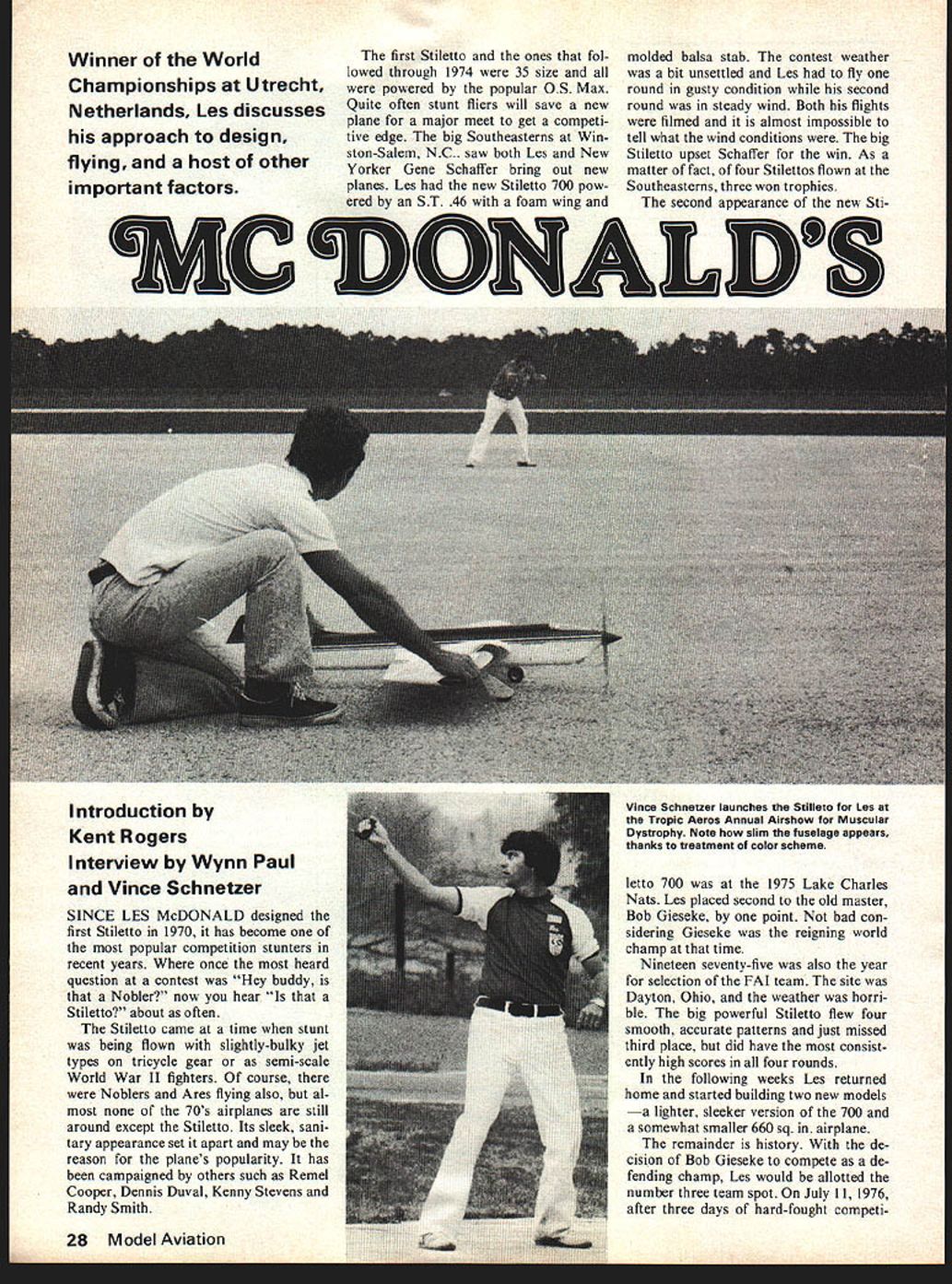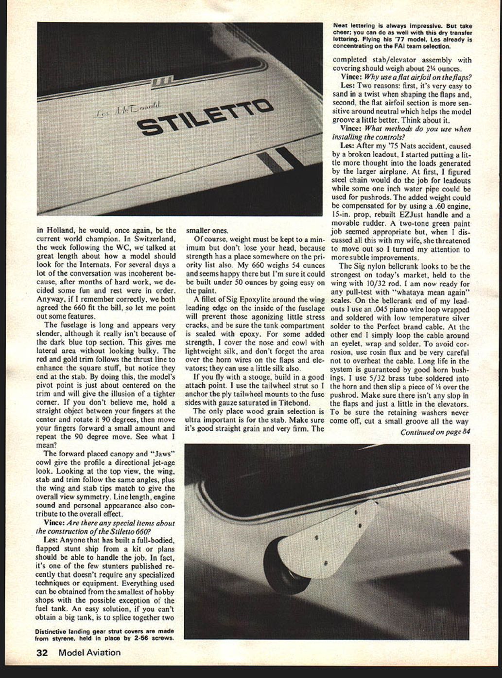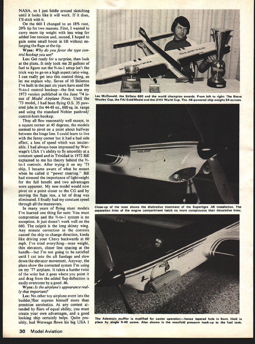Winner World Championships Utrecht Netherlands Les discusses approach design flying host other important factors first Stiletto ones fol lowed through 1974 35 size powered popular 0S Max Quite often stunt fliers will save new plane major meet get competi tive edge big Southeasterns Win ston-Salem NC. saw both Les New Yorker Gene Schaffer bring out new planes Les new Stiletto 700 pow ered ST 46 foam wing molded balsa stab contest weather bit unsettled Les fly round gusty condition second round steady wind Both flights filmed almost impossible tell what wind conditions big Stiletto upset Schafler win As matter fact four Stilettos flown Southeasterns three won trophies second appearance new Sti UC ONALDS Introduction Kent Rogers Interview Wynn Paul Vince Schnetzer SINCE LES McDONALD designed first Stiletto 1970 has become popular competition stunters recent years once heard question contest Hey buddy Nobler now hear Stiletto about often Stiletto came time stunt being flown slightly-bulky jet types tricycle gear semi-scale World War II fighters course Noblers Ares flying also al 70s airplanes still around except Stiletto Its sleek sani tary appearance set apart may reason planes popularity has campaigned others such Remel Cooper Dennis Duval Kenny Stevens Randy Smith 28 Model Aviation Vince Schnetzer launches Stilleto Les Tropic Aeros Annual Airshow Muscular Dystrophy Note slim fuselage appears thanks treatment color scheme letto 700 1975 Lake Charles Nats Les placed second old master Bob Gieseke point bad con sidering Gieseke reigning world champ time Nineteen seventy-five also year selection FAI team site Dayton Ohio weather horri ble big powerful Stiletto flew four smooth accurate patterns just missed third place did have consist ently high scores four rounds following weeks Les returned home started building two new models lighter sleeker version 700 somewhat smaller 660 sq airplane remainder history de cision Bob Gieseke compete de fending champ Les would allotted number three team spot July 11 1976 after three days hard-fought competi tion Les McDonald flying Stiletto 660 crowned Control Line Aerobatics World Champion Two stunt fliers have spent consid erable time talking Les Wynn Paul Vince Schnetzer Wynn certainly needs no introduction anyone re motely interested precision aerobatics knows hes top flier moving force ETJ square eight Working logic started thinking about enlarging cur rent design about 15% installing 46 didnt take long realize wasnt such hot idea new model would have start scratch paper really lose head some times next several weeks spent drawing neatest looking thing ever sawtwo Veco 19s ship ETTO thing longer 11-in prop strug gled spring finally reached com promise lt confident big Stiletto knew could build something better Wynn What reason going asmallerplanestil 46 size Les I wanted smaller plane looked big using high aspect ratio wing stab long fuselage trim 660 behind PAMPA Vince other hand just getting started competition aero batics has just completed first Sti letto 660 Model viation plans Recently both Wynn Vince dis cussed items interest Les following interview evolved answers some questions never before published contains some good information fledgling contest flier Wynn Up until 1975 season Stilettos 35 engines What prompted switch larger airplane what big factors design Les I think made decision give 46 model try during second finals round 74 Nats can still remember watching little 10-in prop spinning its brain out trying crawl across top portion square eight dead calm Driving back Miami reasoned larger motor will turn larger prop bigger prop pushes air pushing air makes airplane go forward better con stantly going forward kinda neat competition evenly matched appear ance becomes vital Les thinks must create own advantages important elements configuration markings text made F-16 look like boxcar Anyway chickened out began sketching some thing little conventional actually designing what eventually became Stiletto 700 main concern contered around mandatory use 018 lines roll yaw larger diameter prop might create Most people flying 46 models season before using over 750 sq wings certain could get away less could keep weight down As turned out ended up using Control Specialties foam job wide chord pitch stability 700 sq carry heavy lines dampen possible yaw prob lems built fuselage relatively deep moderate size fin never did have problems yaw airplane roll total grief thing super critical tip weight wouldnt consider flying anypaint full length think achieved what looking Actually 660 isnt smallfrom tip tail its almost 47 inches long still feel larger air planes look impressive air talk going around about small airplanes flying accurately pooh poohed fact fly shorter lines lot guys 35 models hoped slightly smaller wing would cut through bad air European flying sites notorious Werwage talked times about recent cham pionships Belgium flying ampi theater hilltop Finland flying downtown Helsinki though seen photos Utrecht circles certain would some trees flags something disturb air As turned out air did get bumpy times never unmanageable Wynn What airfoil use Les Ive always used constant 18% airfoil 2 inches leading-edge sweep Stilettos regardless aspect ratio area work hobby shop July1977 29 NASA just fiddle around sketching until looks like will work does Ill stick 660 changed 18% root 20% tip two reasons First wanted carry tip weight less wing added line tension second hoped gain some small boost lift en larging flaps tip Wynn Why favor type con trol hookup use Les Get ready surprise look plans took 20 gallons fuel figure out -to-l setup isnt trick way go high aspect ratio wing can really get control thing let explain Seven 10 Stilettos Ive built past six years have used 2/3-to-l control hookupthe first 1973 version published June 74 sue Model Airplane News Until 73 model flying 0S 35 pow ered jobs 44-48 oz 600 sq range using standard Nobler pushrod/ control-h