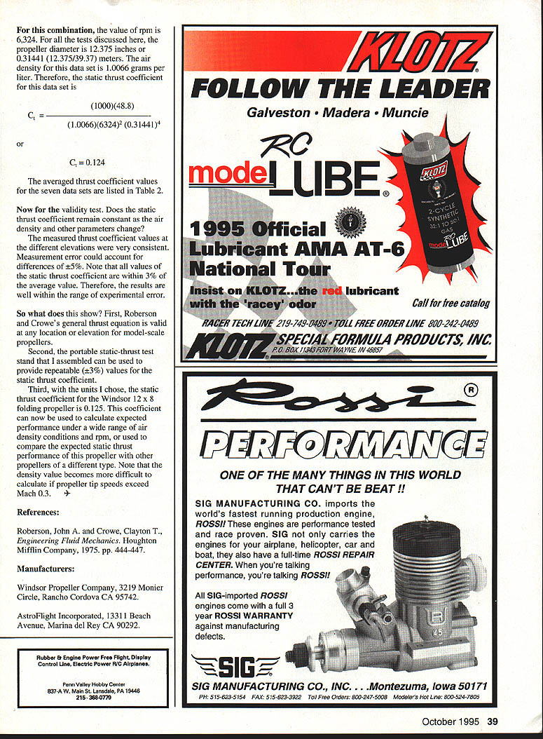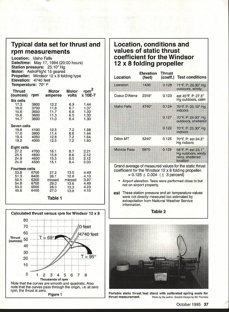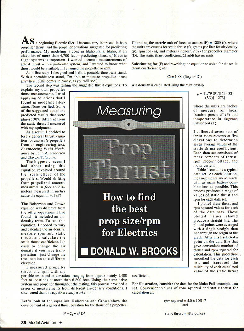 A S ginning Electric flier became very interested both propeller thrust propeller equations suggested predicting performance modeling done Idaho Falls Idaho elevation 4700 feetpredicting thrust Electric flight systems important wanted accurate measurements actual thrust particular system wanted know what thrust would available changed propeller rpm As first step designed built portable thrust-test stand portable test stand Im able measure propeller thrust anywhere comes handy will see second step testing suggested thrust equations explain own propeller thrust measurements tried applying equations found modeling liter ature None verified Some suggested equations predicted results almost 30% different static thrust measured equipment As result decided test general thrust equa tion full-scale propellers engineering text Engineering Fluid Mech anics John Roberson Clayton T Crowe biggest concern about using equation revolved around scale effect propellers Would shifting propeller diameters measured feet dia meters measured inches cause equation fail Roberson Crowe equation different other equations foundit included airdensity term test equation needed vary calculate air density measure rpm static thrust calculate static thrust coefficient Its easy change air density have trans portationjust change test location different elevation measured propeller thrust rpm portable test stand elevations ranging approximately 1400 feet locations 6800 feet Using same drive system propeller throughout testing process provided series measurements different air-density conditions discovered equation really works Lets look equation Roberson Crowe show development general thrust equation thrust propeller F 2 D4 Changing metric unit force ounces F f units ounces static thrust f grams per liter air density p rpm n meters inches/3937 propeller diameter D static thrust coefficient C[sub]t has no units Substituting F rewriting equation solve static thrust coefficient gives Ct l000f/pn2D4 Air density calculated using relationship p PI{ iXT -32 5/9] units inches mercury local station pressure P temperature degrees Fahrenheit T collected seven sets thrust measurements five elevations determine seven average values static thrust coefficient data set consisted measurements thrust rpm motor voltage motor current Table 1 contains typical data set location measurements made battery com binations possible process produced range values static thrust rpm data set plotted thrust rpm squared values data sets plotted values should produce straight line plotted points averaged single straight data line through origin graph After selected point data line gave convenient number thrust rpm squared calculation procedure smoothed data set increased reliability calculated value static thrust coefficient illustration consider data Idaho Falls example data set Convenient values rpm squared static thrust calculation rpm squared lOE7 static thrust ounces 36 Model Aviation cal data set thrust rpm measurements Location Idaho Falls Date/time May 171994 2000 hours Station pressure 2510 Hg Motor AstroFlight 15 geared Propeller Windsor 12 x 8 folding type Elevation 4740 feet Temperature 70 F Thrust ounces rpm Six cells 1733800 1603700 1563650 1563600 1473600 Seven cells 196 170 194 192 Eight cells 272 255 249 240 4100 3800 4050 4000 4700 4600 4600 4500 Fourteen cells 5386700 5136400 5056300 5486700 5306500 4966400 Motor Motor rpm2 amperes volts x 1OE-7 122 118 117 113 110 125 114 128 125 161 158 155 151 272 261 missed 290 280 270 69144 67137 66133 65130 64130 72168 66144 72164 72160 87221 86212 85212 84203 130 128 missed 136 133 130 449 410 397 449 423 410 Table 1 Calculated thrust versus rpm Windsor 12 x 8 80 70 60 Thrust ounces 50 40 30 20 10 0 12345678 Thousands rpm Note curves smooth quadratic Also note curves pass through origin ie zero rpm thrust zero Figure 1 T: r 50 Location conditions values static thrust coefficient Windsor 12 x 8 folding propeller Elevation Thrust Locationfeetcoeff Test conditions Coeur DAlene231 8*0123 est 450F P 275 Ha outdoors calm Grana average OT measurea vaiues static tnrust coefficient Windsor 12 x 8 folding propeller 0125 rcent * Airport elevation Tests performed close airport property est These station pressure air temperature values directly measured estimated extrapolation National Weather Service information Table 2 Portable static thrust test stand calibrated spring scale thrust measurementPhoto author Graphic Daaign Bill Thorabro October1995 37 Dillon MT5240*0125 700F P est 242 Hg indoors combination value rpm 6324 tests discussed propeller diameter 12375 inches 031441 12375/3937 meters air density data set 10066 grams per liter Therefore static thrust coefficient data set 1000488 C t 1 006663242 03 144 1 Ct 124 averaged thrust coefficient values seven data sets listed Table 2 Now validity test Does static thrust coefficient remain constant air density other parameters change measured thrust coefficient values different elevations very consistent Measurement error could account differences 5% Note values static thrust coefficient within 3% average value Therefore results well within range experimental error So what does show First Roberson Crowe s general thrust equation valid location elevation model-scale propellers Second portable static-thrust test stand assembled can used provide repeatable 3% values static thrust coefficient Third units chose static thrust coefficient Windsor 12 x 8 folding propeller 0125 coefficient can now used calculate expected performance under wide range air density conditions rpm used compare expected static thrust performance propeller other propellers different type Note density value becomes difficult calculate propeller tip speeds exceed Mach 03 4References Roberson John Crowe Clayton T Engineering Fluid Mechanics Houghton Mifflin Company 1975 pp 444-447 Manufacturers Windsor Propeller Company 3219 Monier Circle Rancho Cordova CA 95742 AstroFlight Incorporated 13311 Beach 