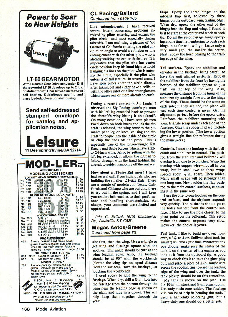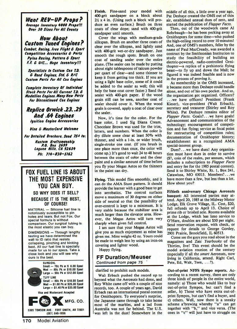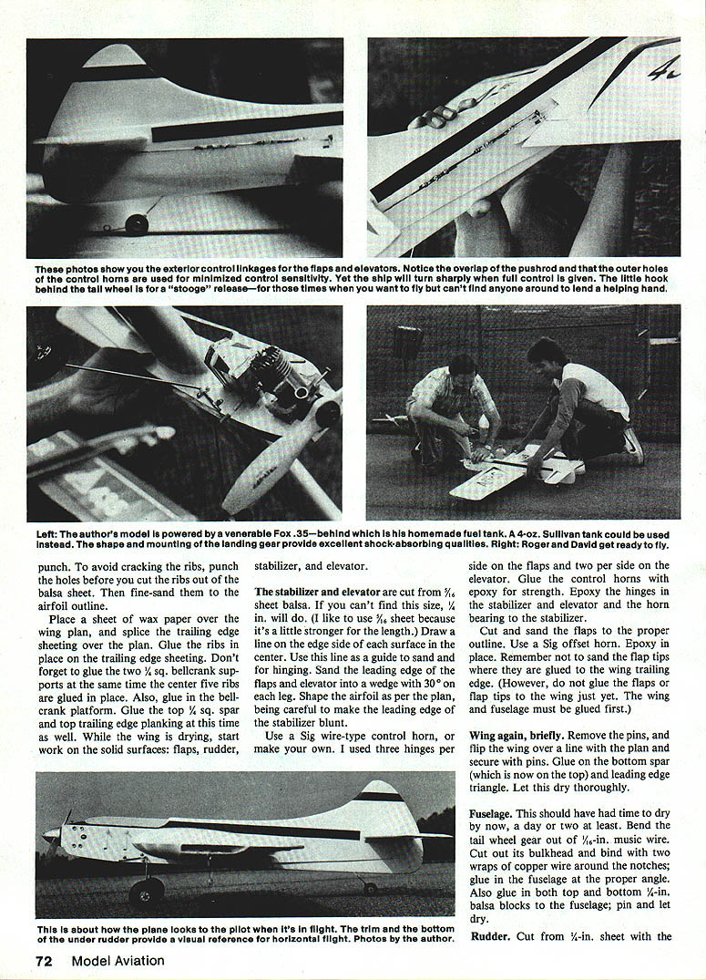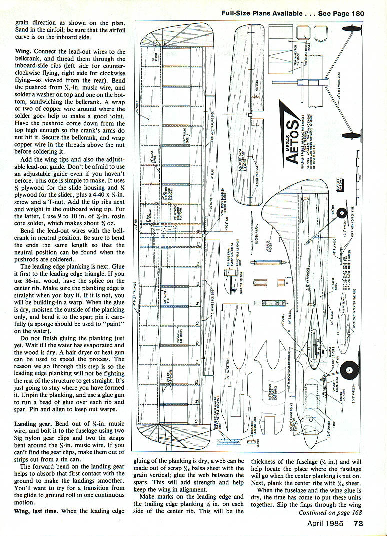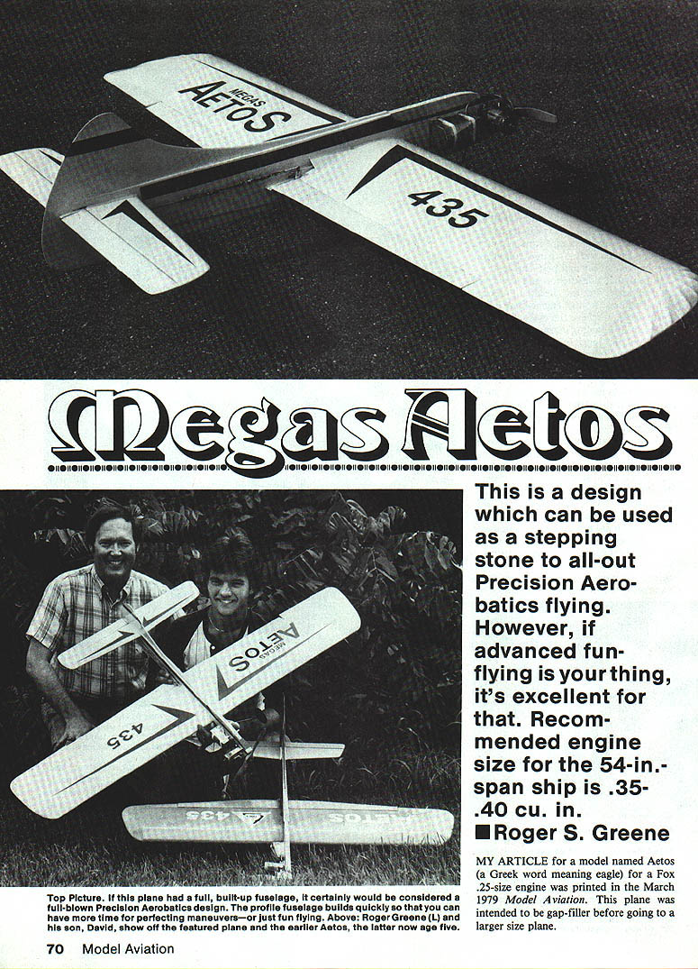 w design can used stepping stone all-out Precision Aero batics flying However advanced funflying isyourthing its excellent Recom mended engine size 54-inspan ship 3540 cu U Roger S Greene MY ARTICLE model named Aetos Greek word meaning eagle Fox 25-size engine printed March Top Picture plane full built-up fuselage certaInly would considered 1979 Model Aviation plane full-blown Precision Aerobatics design profile fuselage builds quickly can have time perfectIng maneuversor just fun flying Above Roger Greene L intended gap-filler before going son DavId show off featured plane earlier Aetos latter now age five larger size plane 70 Model Aviation have now taken original propor tions enlarged wingspan 54 fit 35- 40-size engine call new plane Megas Aetos meaning large eagle plane novice get feel large plane too much expense wing construction straightfor ward C-tube web make D-tube What like about fuselage construction tail builds up light allowing larger stabilizer elevator smoother control through maneuver stabilizer elevator could also built-up would save about ounce overall weightvery important rear end Megas Aetos has torsion bar landing gear setup bounce-free takeoffs landings controls have one-to-one ratio same used flaps elevator top Stunt pilots wing has 551 aspect ratio average 20% flaps great turning ability fuel tank uniflow wedge type containing 375 fluid ounces slip stream vent goes directly back tank next engine pickup tube wedge Both soldered place overflow vent capped before starting engine Sullivan 4-oz tank could used instead building own Construction After studying plans carefully make patterns out posterboard Use carbon paper tracing parts cut out pattern Fine-sand pattern edges can make smooth line felt-tip ball-point pen wood Buy wood careful ly get proper weight straight ness text arranged suggested building sequence Fuselage always assemble fuselage first can drying work being done rest plane Begin cutting out / balsa sheet sides plywood doublers Remember put engine cutout outboard side A-in balsa core can made out two layers / sheet Butt-glue balsa plywood fuse lage sides together Cut plywood doubler first doubler meets balsa side use plywood edge guide cut balsa side perfect joint Remember keep top edge fuselage straight alignment Glue joint together using masking tape both sides pull joint tight Cut engine beams size help construction fuselage suggest making vise out plywood eight 8-32 x 2-in screws washers wing nuts Drill eight holes three top three bottom middle airfoil Fox 35 bottom backplate will stick through fuselage 3A6-in dia about A-in away fuselage used Titebond glue fuselage Remove tape fuselage sides just before glulng clamping vise Slip fuselage tighten Set aside dry about 24-48 hours fuselage drying cut out wing parts Wing Cut ribs sheet balsa indicated thickness plan Punch holes lead-outs using metal lipstick top filed sharp Drill solder piece A-in music wire about halfway up punch grip help twist hole top will enable push out wood circles homemade April1985 71 Left If tank centerline isnt engine intake centerline wont able get engine run consistently air short length music wire helps placing tank correctly Right lipstick cap 1/16-in music wire through foreground just left center sharpened become handy punch making lead-out holes wing ribs such Device simple effective Above havent tried adjustable lead-out guide before dont know what youre missing can really finetune amount line pull easy make Left Large tall surfaces high aspect ratio wing 55 1 show up Authors model covered medium-grade siikspan painted over Sig Diana Cream trimmed Chocolate Brown Compiete finishing steps text photos show exterior control linkages flaps elevators Notice overlap pushrod outer holes control horns used minimized control sensitivIty Yet ship will turn sharply full control given little hook behind tall wheel stooge releasefor times want fly cant find anyone around lend helping hand Left authors model powered venerable Fox 35behind homemade fuel tank 4-oz Sullivan tank could used Instead shape mounting landing gear provide excellent shock-absorbIng qusilties Right Roger David get ready fly punch avoid cracking ribs punch holes before cut ribs out balsa sheet fine-sand airfoil outline Place sheet wax paper over wing plan splice trailing edge sheeting over plan Glue ribs place trailing edge sheeting Dont forget glue two / sq bellcrank sup ports same time center five ribs glued place Also glue bellcrank platform Glue top / sq spar top trailing edge planking time well wing drying start work solid surfaces flaps rudder stabilizer elevator stabilizer elevator cut /6 sheet balsa cant find size will like use 5/4 sheet because its little stronger length Draw line edge side surface center Use line guide sand hinging Sand leading edge flaps elevator wedge 300 leg Shape airfoil per plan being careful make leading edge stabilizer blunt Use Sig wire-type control horn make own used three hinges per side flaps two per side elevator Glue control horns epoxy strength Epoxy hinges stabilizer elevator horn bearing stabilizer Cut sand flaps proper outline Use Sig offset horn Epoxy place Remember sand flap tips glued wing trailing edge However glue flaps flap tips wing just yet wing fuselage must glued first Wing again briefly Remove pins flip wing over line plan secure pins Glue bottom spar now top leading edge triangle Let dry thoroughly Fuselage should have time dry now day two least Bend tail wheel gear out /,-in music wire Cut out its bulkhead bind two wraps copper wire around notches glue fuselage proper angle Also glue both top bottom A-in balsa blocks fuselage pin let dry Rudder Cut A-in sheet 72 Model Aviation about plane looks pilot its flight trim bottom under rudder provide visual reference horizontal flight Photos author Full-Size Plans Available. See Page 180 grain direction shown plan Sand airfoil sure airfoil curve inboard side Wing Connect lead-out wires belicrank thread through