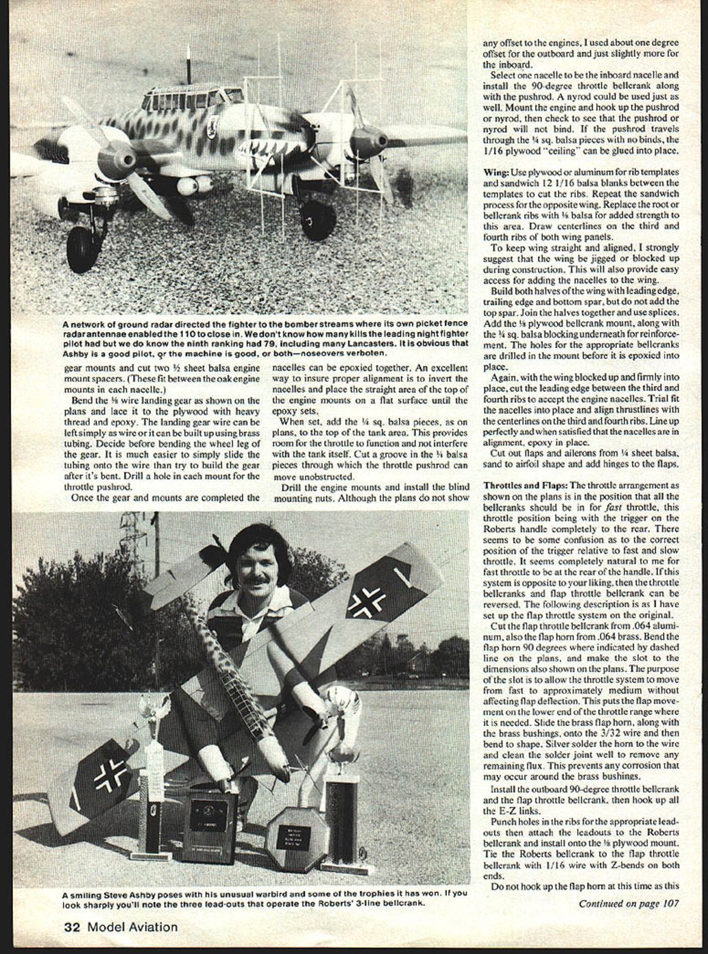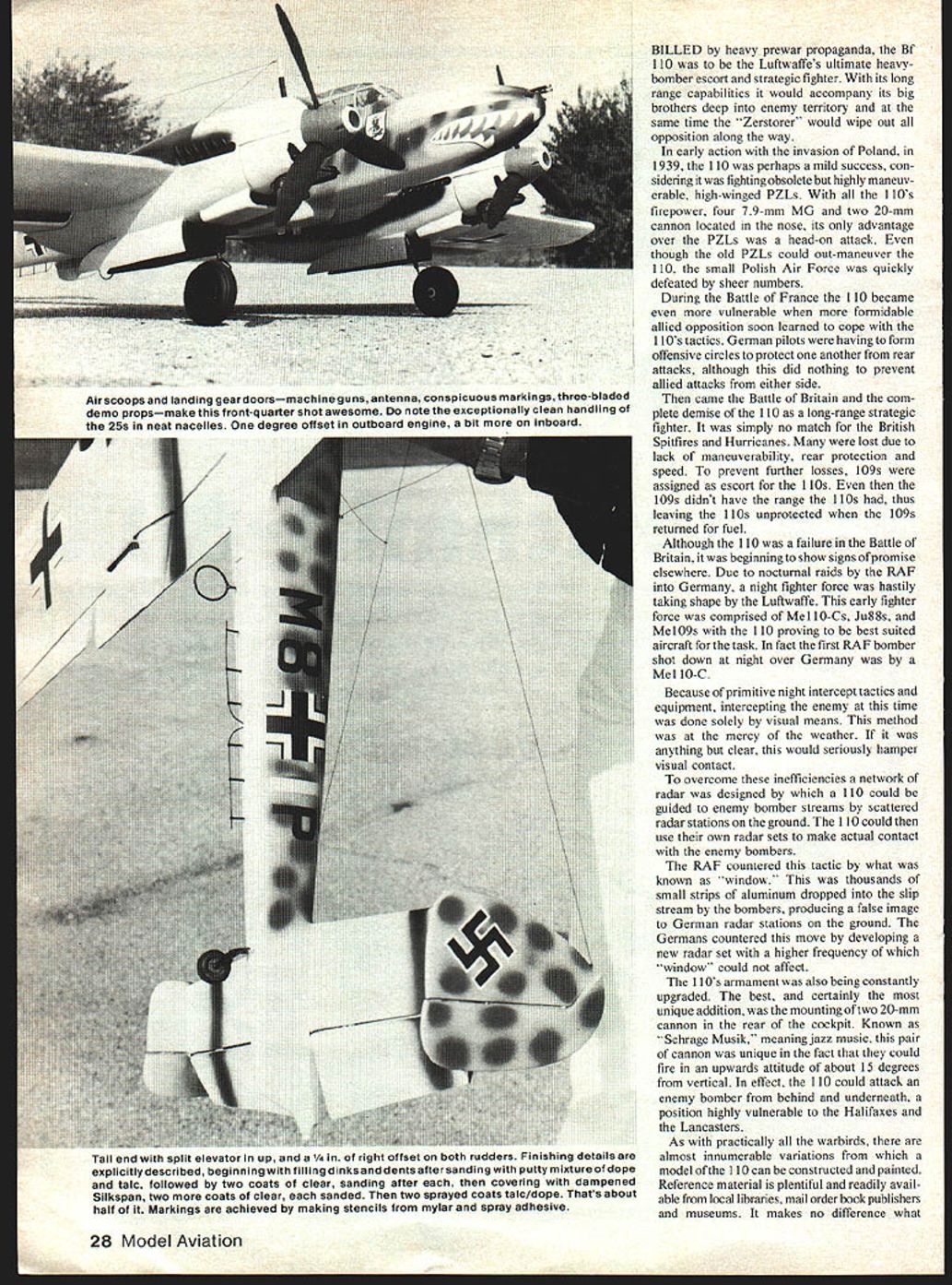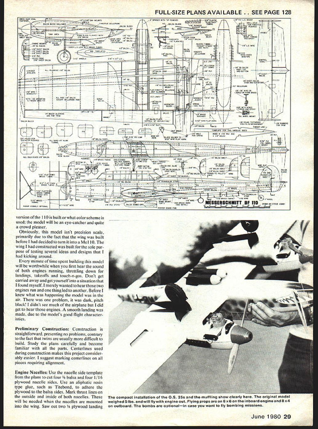 Builtcontrol line wing unique blend cxto fly twin Its star sublect Note stunt eloquently menace BILLED heavy prewar propaganda Bf 110 Luftwaffes ultimate heavybomber escort strategic fighter its long range capabilities would accompany its big brothers deep enemy territory same time Zerstorer would wipe out opposition along way early action invasion Poland 1939 110 perhaps mild success con sidering fighting obsolete highly maneuv erable high-winged PZLs 110s firepower four 79-mm MG two 20-mm cannon located nose its advantage over PZLs head-on attack though old PZLs could out-maneuver 110 small Polish Air Force quickly defeated sheer numbers During Battle France 110 became vulnerable formidable allied opposition soon learned cope 110s tactics German pilots having form offensive circles protect another rear attacks although did nothing prevent allied attacks either side came Battle Britain com plete demise 110 long-range strategic fighter simply no match British Spitfires Hurricanes lost due lack maneuverability rear protection speed prevent further losses 109s assigned escort 1 lOs 109s didnt have range 1 lOs thus leaving 1 lOs unprotected 109s returned fuel Although 110 failure Battle Britain beginning show signs promise elsewhere Due nocturnal raids RAF Germany night fighter force hastily taking shape Luftwaffe early fighter force comprised Mel 10-Cs Ju88s MelO9s 110 proving best suited aircraft task fact first RAF bomber shot down night over Germany Mel 10-C Because primitive night intercept tactics equipment intercepting enemy time done solely visual means method mercy weather anything clear would seriously hamper visual contact overcome inefficiencies network radar designed 110 could guided enemy bomber streams scattered radar stations ground 110 could use own radar sets make actual contact enemy bombers RAF countered tactic what known window thousands small strips aluminum dropped slip stream bombers producing false image German radar stations ground Germans countered move developing new radar set higher frequency window could affect 110s armament also being constantly upgraded best certainly unique addition mounting two 20-mm cannon rear cockpit Known Schrage Musik meaning jazz music pair cannon unique fact could fire upwards attitude about 15 degrees vertical effect 110 could attack enemy bomber behind underneath position highly vulnerable HalWaxes Lancasters As practically warbirds almost innumerable variations model 110 can constructed painted Reference material plentiful readily avail able local libraries mail order book publishers museums makes no difference what 28 Model Aviation Airscoops landing geardoorsmachine guns antenna conspicuous markings three-bladed demo propsmake front-quarter shot awesome note exceptionally clean handling 25s neat nacelles degree offset outboard engine bit inboard iaii eno wiin split elevator up 1/4 right offset both rudders Finishing details explicitlydescribed beginning filling dinksand dents aftersanding putty mixture dope talc followed two coats clear sanding after covering dampened Silkapan two coats clear sanded two sprayed coats talc/dope Thats about half Markings achieved making stencils mylar spray adhesive FULL-SIZE PLANS AVAILABLE SEE PAGE 128 version 110 built what color scheme used model will eye-catcher quite crowd pleaser Obviously model isnt precision scale primarily due fact wing built before decided tum 110 wing constructed built sole pur pose testing several ideas designs kicking around minute time spent building model will worthwhile first hear sound both engines running throttling down landings takeoffs touch-n-gos Dont get carried away get yourself situation found myself merely wanted hear two engines run thing led another Before knew what happening model air problem dark pitch black didnt see much airplane did get hear engines smooth landing made due models good flight character istics Preliminary Construction Construction straightforward presenting no problems contrary fact twins usually difficult build Study plans carefully become familiar parts Centerlines used during construction makes project consider ably easier suggest marking centerlines pieces requiring alignment Engine Nacelles Use nacelle side template plans cut four a four 1/16 plywood nacelle sides Use aliphatic resin type glue such Titebond adhere plywood balsa sides Mark thrust lines outside inside both nacelles will needed nacelles mounted wing Saw out two ood landing 4 r compact installation OS 25s muttling snow cieariy nere flu origini uiuuu weighed 5 lbs will flywith engine out Flying props 8 x 6 inboard engine 8 x 4 outboard bombs optionalin case want fly bombing missions June 1980 29 AMERS SNAP DOWNSDorB VT OAK MoUNTsK SNTDIMOR WITH TIP REMOVEDTIM PASS CB P0 00100K FASTENER55 BALSA BLOOD OOLOWED- TIIKOTTLE KELLCKDTINT BOLSA BLOCKTUNING NI- BA ios oss USEDSISOOS COAL LEBICODINOL rAND ARCHIIPROMO SLOCK CLOKOPO WIT10 PLY P301 3CR SDEKO MOLNA AALSDLEOUD opnUT BDLDOSDOOP FROMBLOCK IWICIS OBEETP0K FLAPCU BALSA NOPRONE MOUNTSSO BALSA MOACKS1 00USD DETECTIOS US SO BDLOOBLOODNTHCM RALDODODDUISO DOOOCS Cl SHEET BALSABIB TEUPLDTCS _______ 300CRKOBAYTS B STEET BALSA_______________ CIN PLO VIE SOWER BDSD VAN SCOOP REDOS CA ASEELS SUK D 10 L KC RELci ISO BKLSKA ICUT DODUNA LEAAU UN AALNA BALSA OOAO UIO PLO N-- PANES DCA SDEEO ETELETS UK SOSD EDLLCAURR SEE TEXTI 4F T BALSA 3 EBOATOKS -- ---"-" Br--""0USD PLCIUR PUS MOLUCOANO IIUID TIRKADASA p i I IMAVST ItU~O RIFLAP TOWDOTUD MOLDOP WIRK AACLMIULW LEOROIITS p I 4 [~OONBKLOS2 IALL RIAS IUID BALSA IDSDDWOi OTTO P BATE 00 D SAT INEDCKTO BCLLCROOE TITLEVRAP I.ACK ODYBOCOD NA TIP I BALSA ] UK BALSA IMRDOOTABRWOOOSTRING IFiLlINMOCSISEETEOTI __________2 IIO2I 10 BALSA DILEDOSSUBOIUATE II2OWUODUI'7~ USE ROB BRIM IBLSUBIKDS\UUTDIL MODEL MOODSI BDLSD MLOCKOPPROAIM FLAPS WIDE FLAP TORNU {USE RODNO TOOTOPICKSRIDOOPRS IUINC IUTA SLOTIUO BALSAtM NI PNDESPOKOOIWKRUN TRIM FTESFT0BA BROOSTEMPLATE FOR ESA SACEULD SOOS FOEKfXfl1INBOLDMAPE