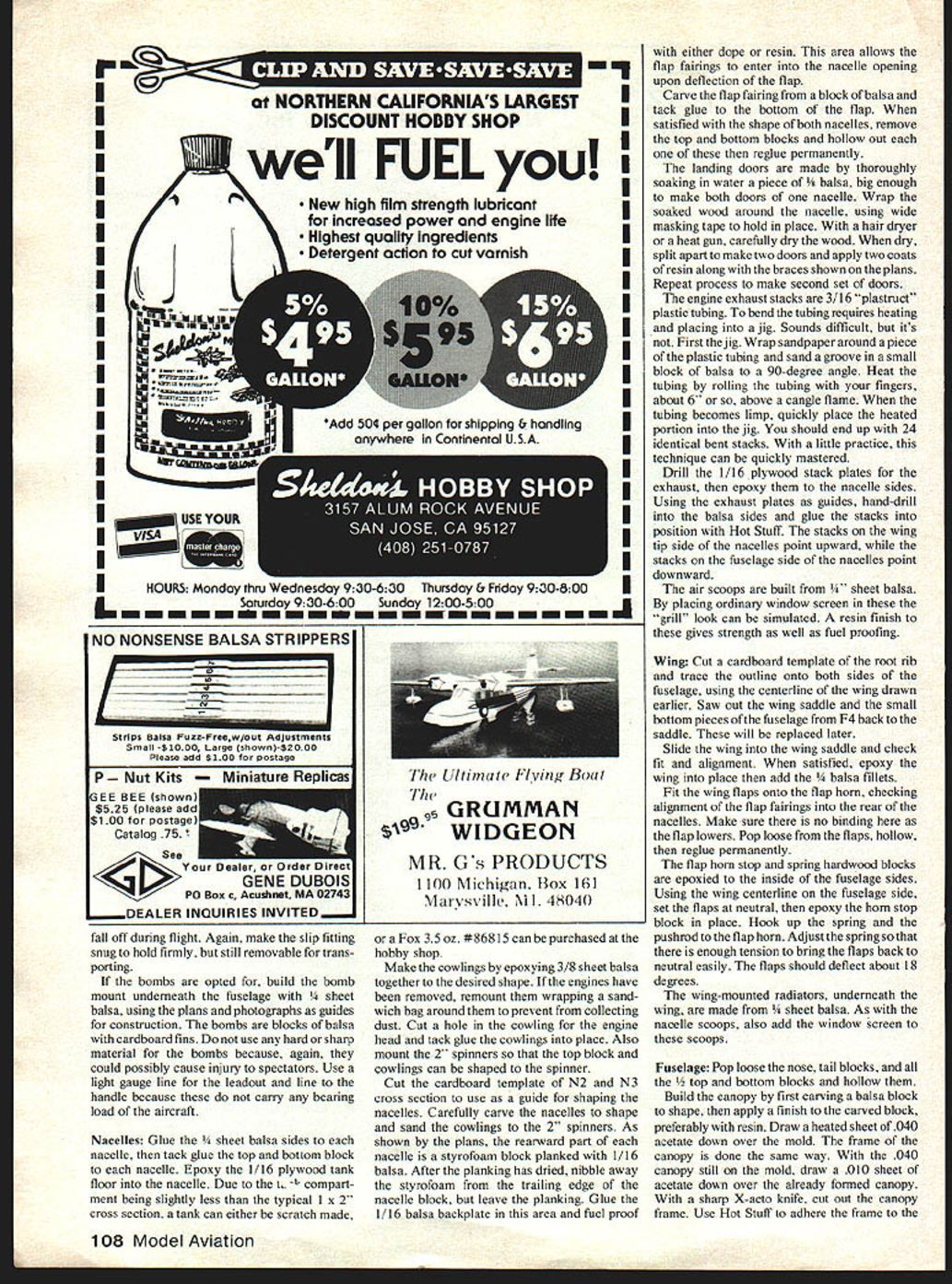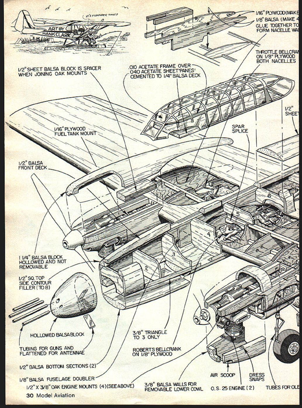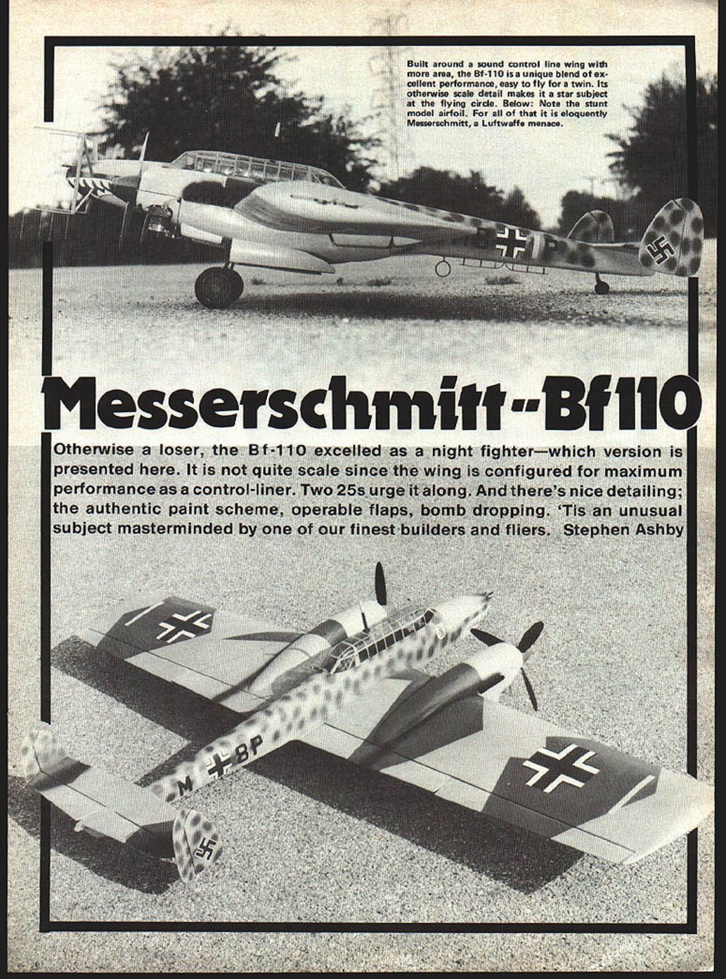 Builtcontrol line wing unique blend cxto fly twin Its star sublect Note stunt eloquently menace BILLED heavy prewar propaganda Bf 110 Luftwaffes ultimate heavybomber escort strategic fighter its long range capabilities would accompany its big brothers deep enemy territory same time Zerstorer would wipe out opposition along way early action invasion Poland 1939 110 perhaps mild success con sidering fighting obsolete highly maneuv erable high-winged PZLs 110s firepower four 79-mm MG two 20-mm cannon located nose its advantage over PZLs head-on attack though old PZLs could out-maneuver 110 small Polish Air Force quickly defeated sheer numbers During Battle France 110 became vulnerable formidable allied opposition soon learned cope 110s tactics German pilots having form offensive circles protect another rear attacks although did nothing prevent allied attacks either side came Battle Britain com plete demise 110 long-range strategic fighter simply no match British Spitfires Hurricanes lost due lack maneuverability rear protection speed prevent further losses 109s assigned escort 1 lOs 109s didnt have range 1 lOs thus leaving 1 lOs unprotected 109s returned fuel Although 110 failure Battle Britain beginning show signs promise elsewhere Due nocturnal raids RAF Germany night fighter force hastily taking shape Luftwaffe early fighter force comprised Mel 10-Cs Ju88s MelO9s 110 proving best suited aircraft task fact first RAF bomber shot down night over Germany Mel 10-C Because primitive night intercept tactics equipment intercepting enemy time done solely visual means method mercy weather anything clear would seriously hamper visual contact overcome inefficiencies network radar designed 110 could guided enemy bomber streams scattered radar stations ground 110 could use own radar sets make actual contact enemy bombers RAF countered tactic what known window thousands small strips aluminum dropped slip stream bombers producing false image German radar stations ground Germans countered move developing new radar set higher frequency window could affect 110s armament also being constantly upgraded best certainly unique addition mounting two 20-mm cannon rear cockpit Known Schrage Musik meaning jazz music pair cannon unique fact could fire upwards attitude about 15 degrees vertical effect 110 could attack enemy bomber behind underneath position highly vulnerable HalWaxes Lancasters As practically warbirds almost innumerable variations model 110 can constructed painted Reference material plentiful readily avail able local libraries mail order book publishers museums makes no difference what 28 Model Aviation Airscoops landing geardoorsmachine guns antenna conspicuous markings three-bladed demo propsmake front-quarter shot awesome note exceptionally clean handling 25s neat nacelles degree offset outboard engine bit inboard iaii eno wiin split elevator up 1/4 right offset both rudders Finishing details explicitlydescribed beginning filling dinksand dents aftersanding putty mixture dope talc followed two coats clear sanding after covering dampened Silkapan two coats clear sanded two sprayed coats talc/dope Thats about half Markings achieved making stencils mylar spray adhesive FULL-SIZE PLANS AVAILABLE SEE PAGE 128 version 110 built what color scheme used model will eye-catcher quite crowd pleaser Obviously model isnt precision scale primarily due fact wing built before decided tum 110 wing constructed built sole pur pose testing several ideas designs kicking around minute time spent building model will worthwhile first hear sound both engines running throttling down landings takeoffs touch-n-gos Dont get carried away get yourself situation found myself merely wanted hear two engines run thing led another Before knew what happening model air problem dark pitch black didnt see much airplane did get hear engines smooth landing made due models good flight character istics Preliminary Construction Construction straightforward presenting no problems contrary fact twins usually difficult build Study plans carefully become familiar parts Centerlines used during construction makes project consider ably easier suggest marking centerlines pieces requiring alignment Engine Nacelles Use nacelle side template plans cut four a four 1/16 plywood nacelle sides Use aliphatic resin type glue such Titebond adhere plywood balsa sides Mark thrust lines outside inside both nacelles will needed nacelles mounted wing Saw out two ood landing 4 r compact installation OS 25s muttling snow cieariy nere flu origini uiuuu weighed 5 lbs will flywith engine out Flying props 8 x 6 inboard engine 8 x 4 outboard bombs optionalin case want fly bombing missions June 1980 29 AMERS SNAP DOWNSDorB VT OAK MoUNTsK SNTDIMOR WITH TIP REMOVEDTIM PASS CB P0 00100K FASTENER55 BALSA BLOOD OOLOWED- TIIKOTTLE KELLCKDTINT BOLSA BLOCKTUNING NI- BA ios oss USEDSISOOS COAL LEBICODINOL rAND ARCHIIPROMO SLOCK CLOKOPO WIT10 PLY P301 3CR SDEKO MOLNA AALSDLEOUD opnUT BDLDOSDOOP FROMBLOCK IWICIS OBEETP0K FLAPCU BALSA NOPRONE MOUNTSSO BALSA MOACKS1 00USD DETECTIOS US SO BDLOOBLOODNTHCM RALDODODDUISO DOOOCS Cl SHEET BALSABIB TEUPLDTCS _______ 300CRKOBAYTS B STEET BALSA_______________ CIN PLO VIE SOWER BDSD VAN SCOOP REDOS CA ASEELS SUK D 10 L KC RELci ISO BKLSKA ICUT DODUNA LEAAU UN AALNA BALSA OOAO UIO PLO N-- PANES DCA SDEEO ETELETS UK SOSD EDLLCAURR SEE TEXTI 4F T BALSA 3 EBOATOKS -- ---"-" Br--""0USD PLCIUR PUS MOLUCOANO IIUID TIRKADASA p i I IMAVST ItU~O RIFLAP TOWDOTUD MOLDOP WIRK AACLMIULW LEOROIITS p I 4 [~OONBKLOS2 IALL RIAS IUID BALSA IDSDDWOi OTTO P BATE 00 D SAT INEDCKTO BCLLCROOE TITLEVRAP I.ACK ODYBOCOD NA TIP I BALSA ] UK BALSA IMRDOOTABRWOOOSTRING IFiLlINMOCSISEETEOTI __________2 IIO2I 10 BALSA DILEDOSSUBOIUATE II2OWUODUI'7~ USE ROB BRIM IBLSUBIKDS\UUTDIL MODEL MOODSI BDLSD MLOCKOPPROAIM FLAPS WIDE FLAP TORNU {USE RODNO TOOTOPICKSRIDOOPRS IUINC IUTA SLOTIUO BALSAtM NI PNDESPOKOOIWKRUN TRIM FTESFT0BA BROOSTEMPLATE FOR ESA SACEULD SOOS FOEKfXfl1INBOLDMAPE