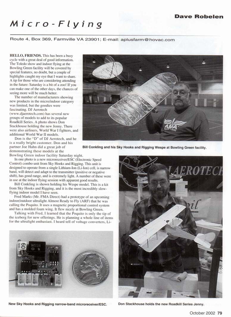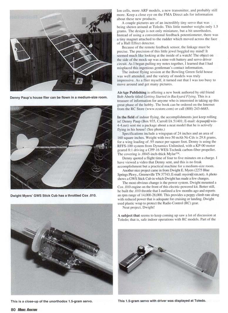 HELLO, FRIENDS. This has been a busy cycle with a great deal of good information. The Toledo show and indoor flying at the Bowling Green facility will be covered by special features, no doubt, but a couple of highlights caught my eye that I want to share. A tip for those who are considering attending in the future: Saturday is a bit of a zoo! If you can make one of the other days, the chances of seeing more will be much better. The number of manufacturers showing new products in the micro/indoor category was limited, but the goodies were fascinating. DJ Aerotech (www.djaerotech.com) has several new groups of models to add to its popular Roadkill Series. A photo shows Don Stackhouse holding the new Jenny. There were also airliners. World War I fighters, and additional World War II models. Don is the "D" of DJ Aerotech, and he is a really bright customer. Don and his partner Joe Hahn did a great job of demonstrating these models at the Bowling Green indoor facility Saturday night. In one photo is a new microreceiver/ESC (Electronic Speed Control) combo unit from Sky Hooks and Rigging. This unit is designed to operate from a single Lithium-Ion (Li-Ion) cell, is narrow band, will detect and adapt to the transmitter (positive or negative shift), has good range, and is extremely light. A number of these were in use at the indoor flying session with apparent good results. Bill Conkling is shown holding his Wespe model. This is a kit from Sky Hooks and Rigging, and it is the most incredibly slow-flying indoor model I have seen. Fred Marks (Mr. FMA Direct) had a prototype of an upcoming indoor/outdoor ultralight Almost Ready to Fly (ARF) that he was calling the Poquito. It uses a magnetic proportional control system and has a molded foam wing. It flew nicely at Bowling Green. Talking with Fred, I learned that the Poquito is only the tip of the iceberg for new offerings. He is planning a whole line of items for the ultralight enthusiast. I heard tell of voltage converters, Li-Ion cells, more ARF models, a new transmitter, and probably still more. Keep a close eye on the FMA Direct ads for information about these new products. A couple pictures are of an incredibly tiny servo that was being shown around at Toledo. This little number weighs only 1.5 grams. The design is not only miniature, but a bit unorthodox. Instead of using a conventional feedback potentiometer, there was a tiny magnet attached to the rudder which moved across the face of a Hall Effect detector. Because of the remote feedback sensor, the linkage must be precise. The precision of this little jewel boggled my mind! It seemed much like looking at the inside of a watch! The object on the side of the mock-up was a nine-volt battery and servo driver circuit. As I began pulling my notes together, I learned that I had misplaced this ingenious gentleman's contact information. The indoor flying session at the Bowling Green field house was well attended, and the variety of models was truly impressive. As a flier myself, it turned out that I was too busy to move around and get many pictures. AirAge Publishing is offering a new book authored by old friend Bob Aberle titled Getting Started in Backyard Flving. This is a treasure of information for anyone who is interested in taking up this great phase of the hobby. The book can be ordered on the Internet from the RC Store (www.rcstore.com) or call (800) 243-6685. In the field of indoor flying, the accomplishments just keep rolling in! Denny Paup (Box 935, Carroll IA 51401; E-mail: dcpaup@win-4-4.net) sent me a package about a neat model that he is actively flying in his house! (See photo.) Specifications include a wingspan of 24 inches and an area of 160 square inches. Weight with two 50 mAh Ni-Cds is 29.8 grams, for a wing loading of .95 ounce per square foot. Denny is using the RFFS-100 system from Dynamics Unlimited, with a KP-00 motor geared 8:1 driving a CPP-16 WES-Technik carbon-fiber propeller. The covering is .0045-inch-thick Mylar™. Denny quoted a flight time of four to five minutes on a charge. I have viewed a video that Denny sent, and this is no freak accomplishment but a practical machine for a medium-size room. Another nice project came in from Dwight E. Myers (2275 Blue Springs Pkwy., Greeneville TN 37743; E-mail: myers@xtn.net). A photo shows a GWS Stick Cub in which Dwight has made a few changes. The most obvious change is the power system. Dwight mounted a Cox .010 engine on the front of this electric-powered kit. Better still. he built the .010 throttle that I outlined a few months ago and reports an rpm range of 14,000-28,000. This provides a peppy climb rate along with reduced power that is adequate for cruising or landing. Dwight used plastic wrap to protect the Radio Control (RC) gear. Neat project, Dwight! A subject that seems to keep coming up saw a lot of discussion at Toledo; that is, safe indoor operations with RC models. Part of the concern is models passing too close to people, which should be addressed by the group by establishing a safe area behind the flightline, and the pilots need to keep their models in front of this zone. Anyone going onto the floor while flying is in progress should announce it. Another matter is the mix of models being flown. More and more groups are setting up separate flight times for the various models, based on weight and speed. It is downright disheartening to see a light park flyer fly through one of the true Indoor ultralights. This is not meant as criticism of the foam models, but more of an observation of a need. I received an E-mail from Bob Pinkus (vice president of the RAMS of Wright-Patterson Air Force Base. Ohio) about using Reynolds® Plastic Wrap. It was so good that I would like to share his entire note. "I've been covering my e-planes with Reynolds® Plastic Wrap. Cheap. Tough. Easy. There have been other articles regarding this, but I've found a much easier way to do it. I don't thin DuPont® 77 spray glue with lighte