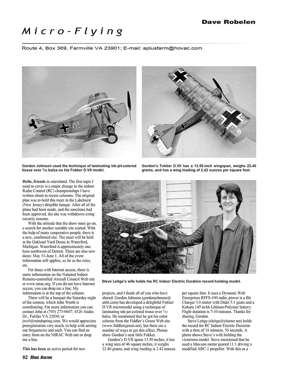 Gordon’s Fokker D.VII has a 13.50-inch wingspan, weighs 22.40