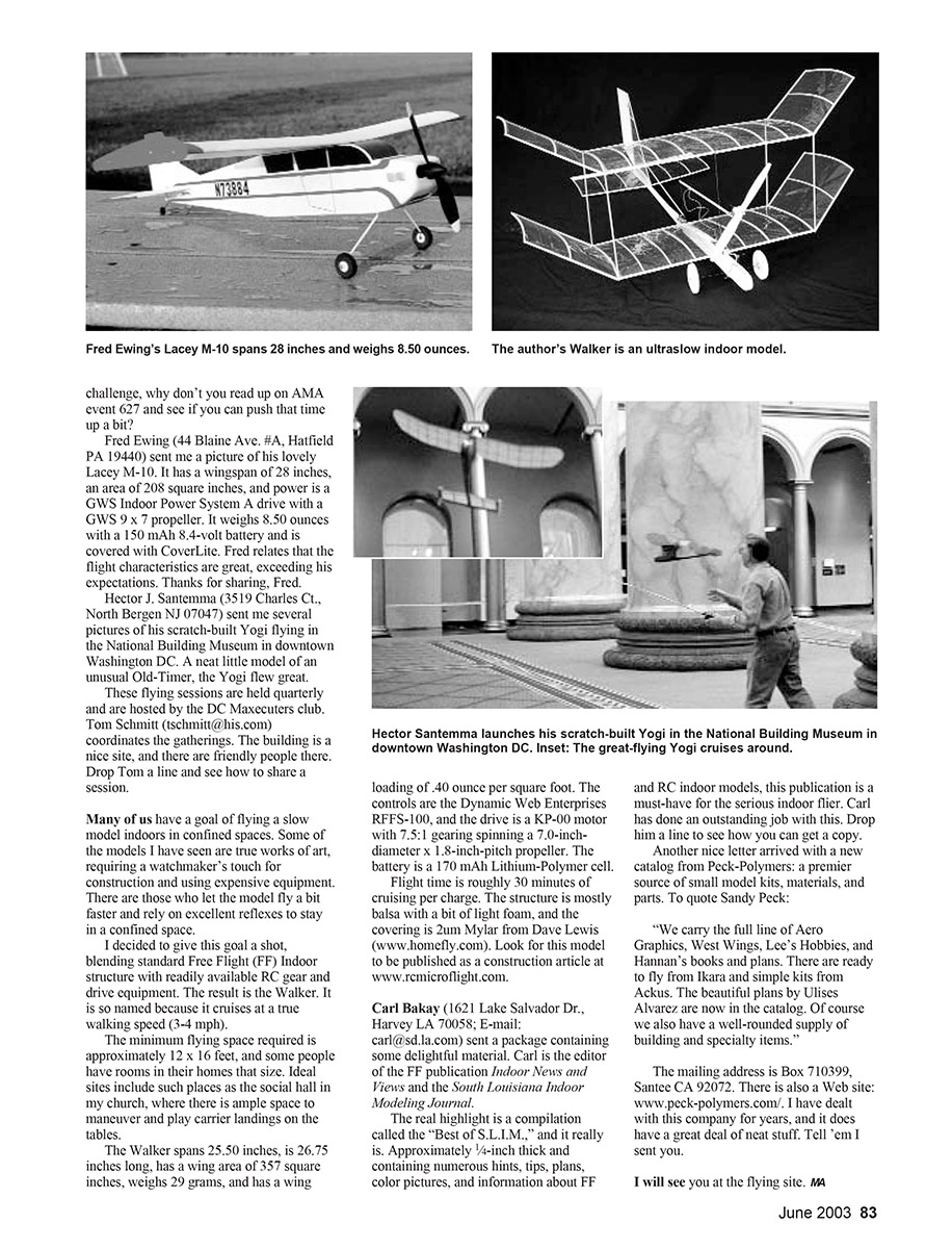 Fred Ewing’s Lacey M-10 spans 28 inches and weighs 8.50 ounces. The author’s Walker is an ultraslow indoor model.