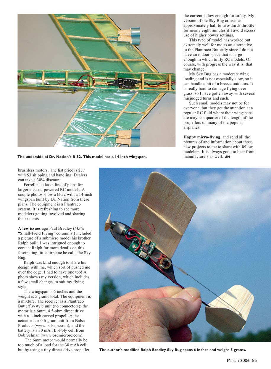 The author’s modified Ralph Bradley Sky Bug spans 6 inches and weighs 5 grams.