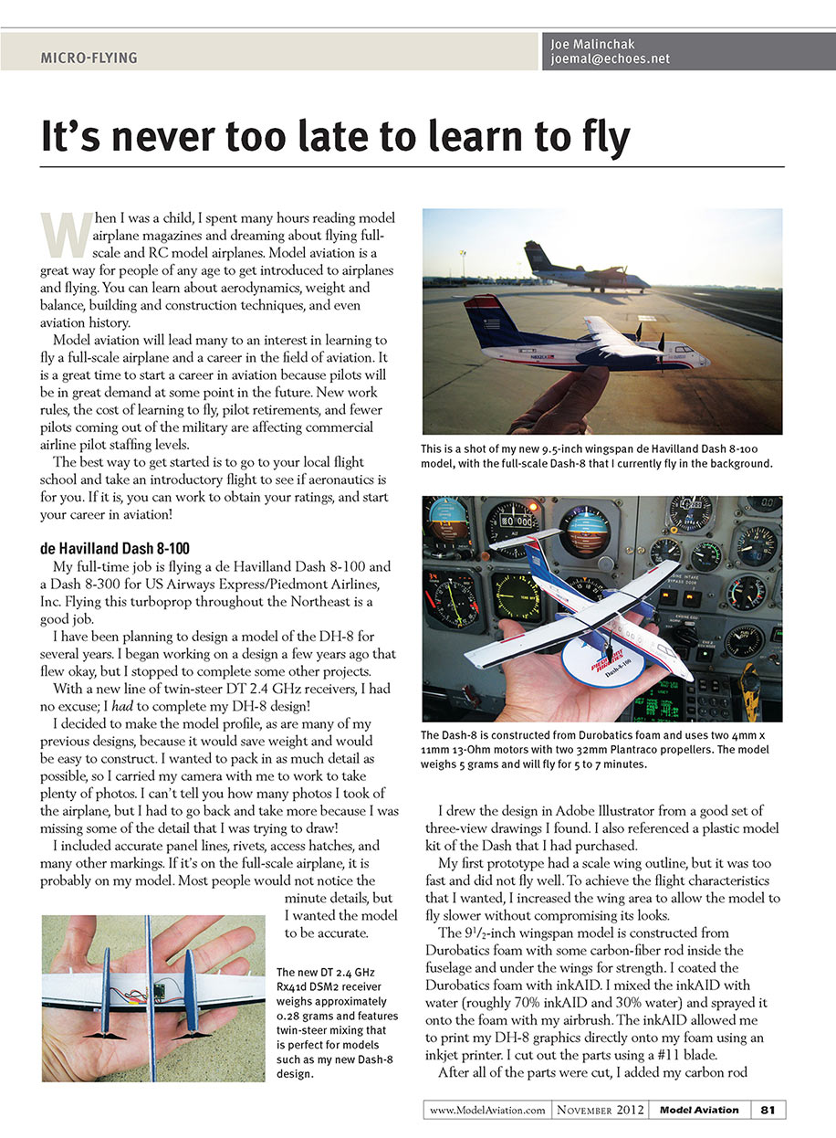 W hen I was a child, I spent many hours reading model airplane magazines and dreaming about flying full-scale and RC model airplanes. Model aviation is a great way for people of any age to get introduced to airplanes and flying. You can learn about aerodynamics, weight and balance, building and construction techniques, and even aviation history.