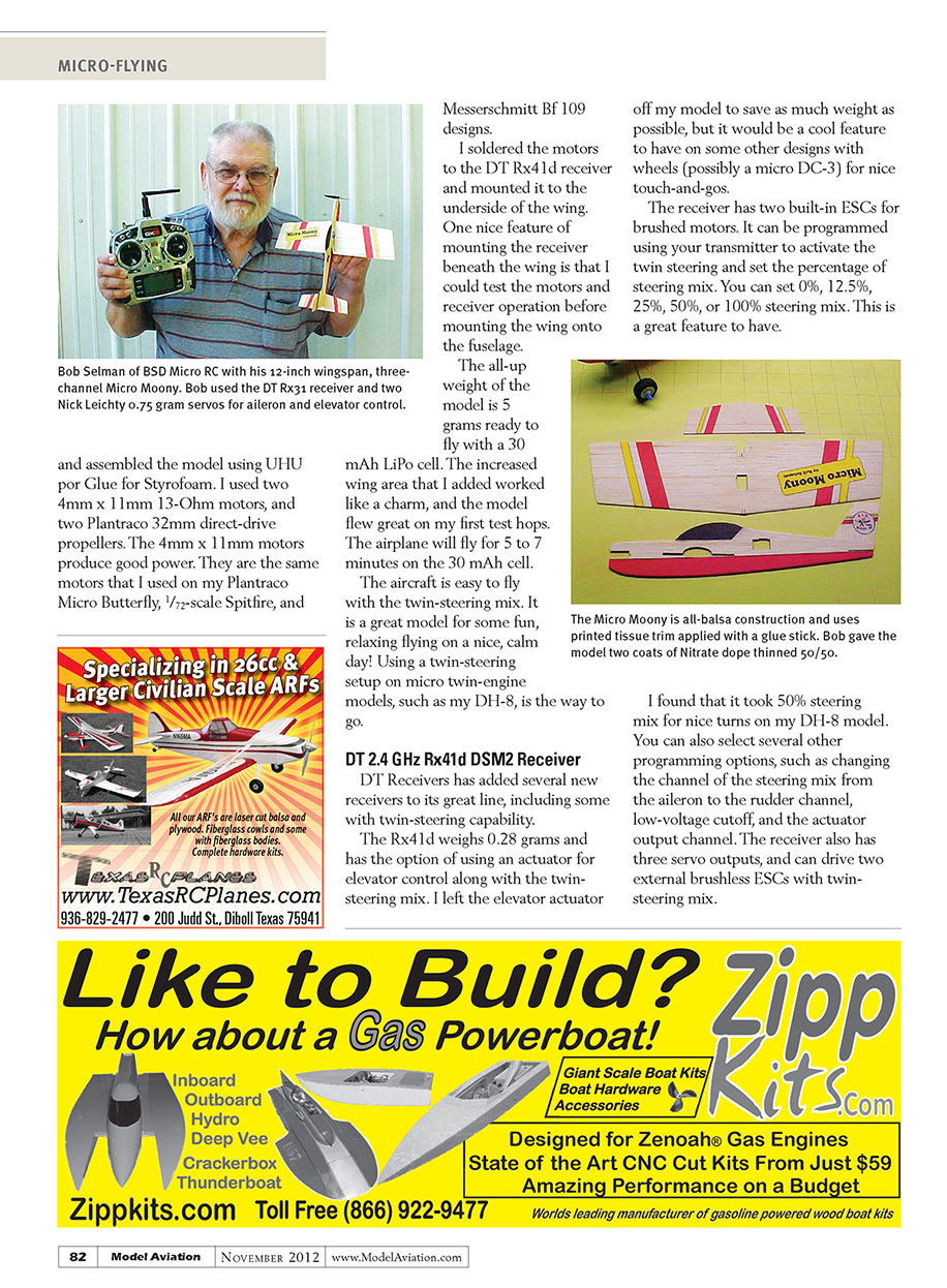 Bob Selman of BSD Micro RC with his 12-inch wingspan, three-channel Micro Moony. Bob used the DT Rx31 receiver and two Nick Leichty 0.75 gram servos for aileron and elevator control.