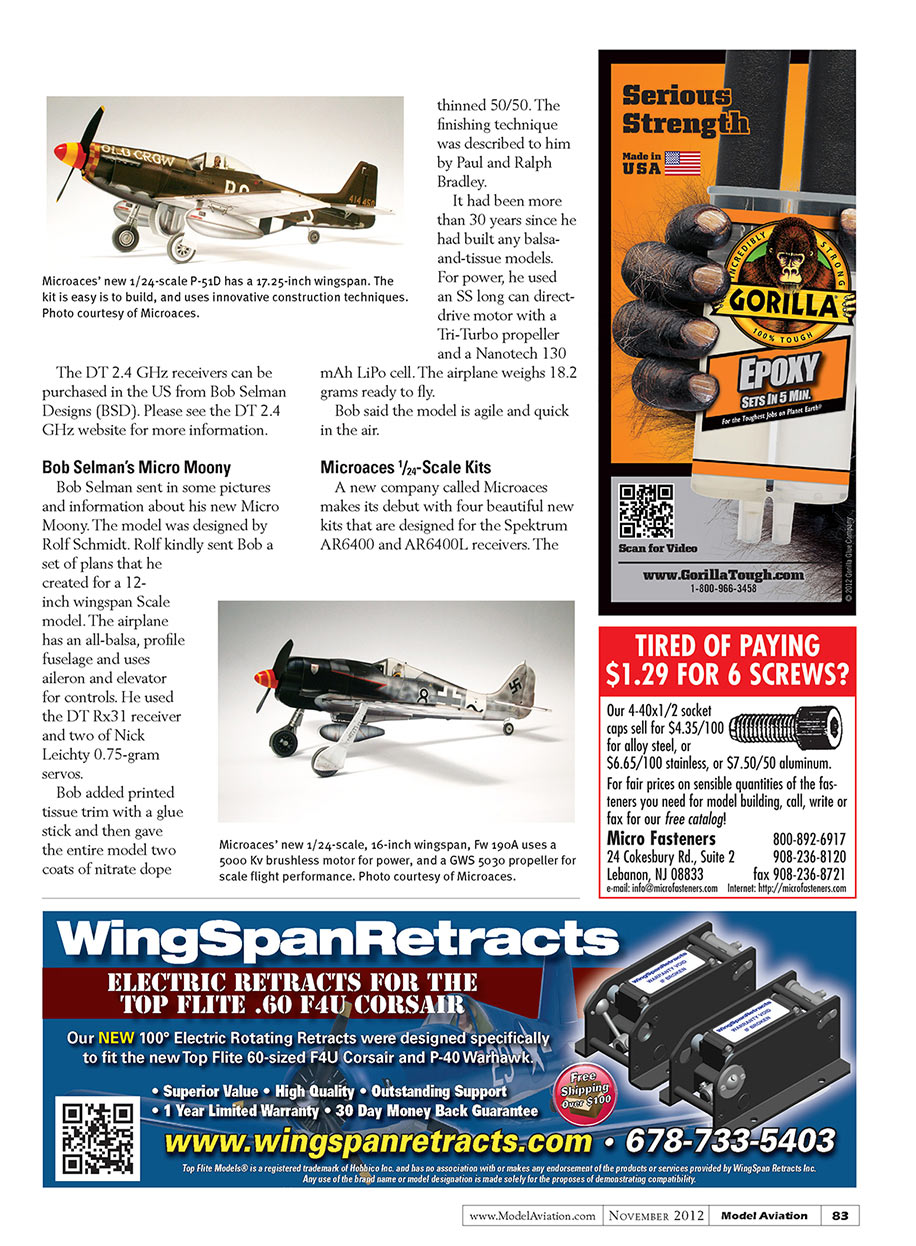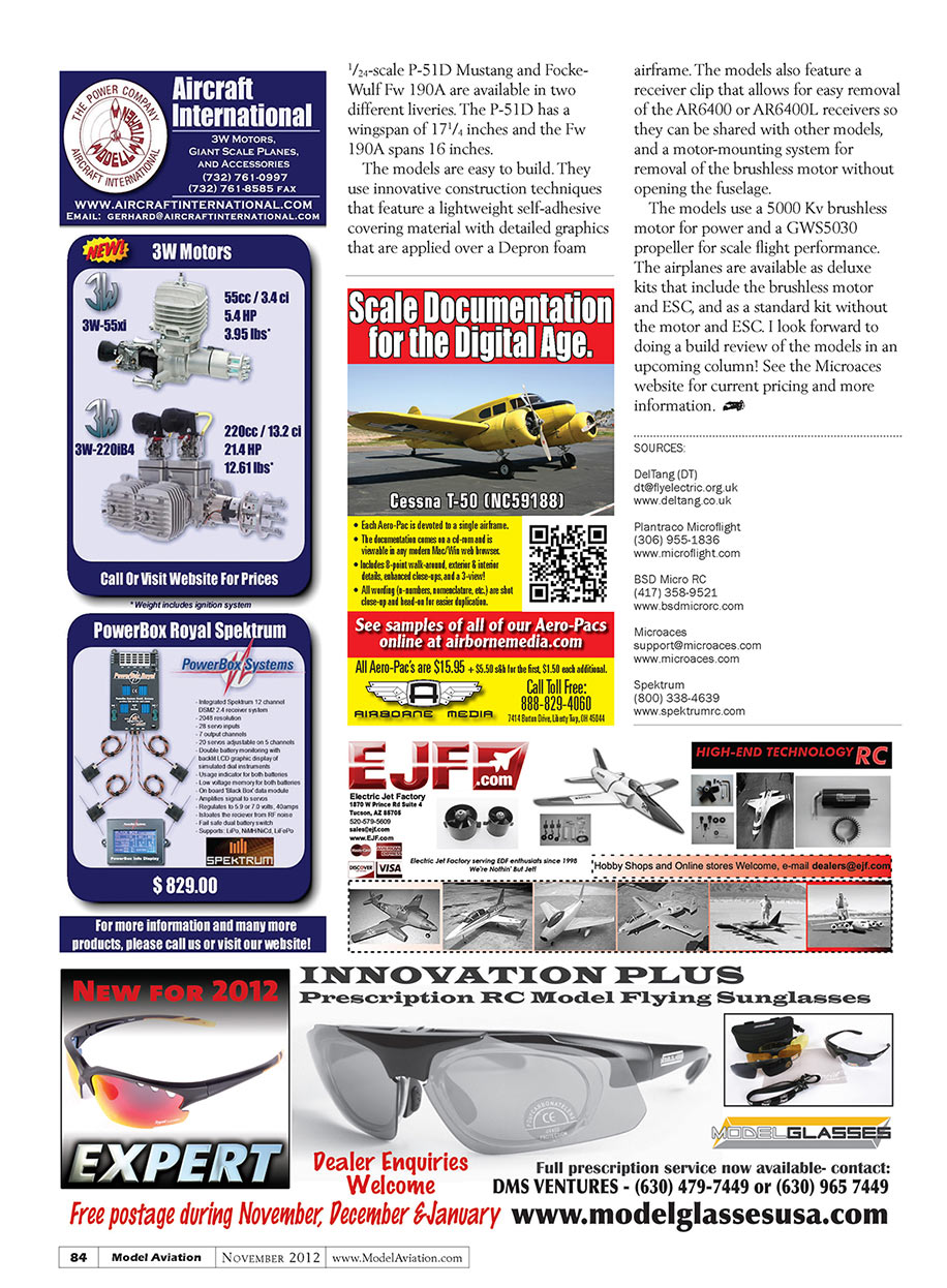 The models use a 5000 Kv brushless motor for power and a GWS5030 propeller for scale flight performance. The airplanes are available as deluxe kits that include the brushless motor and ESC, and as a standard kit without the motor and ESC. I look forward to doing a build review of the models in an upcoming column! See the Microaces website for current pricing and more information.