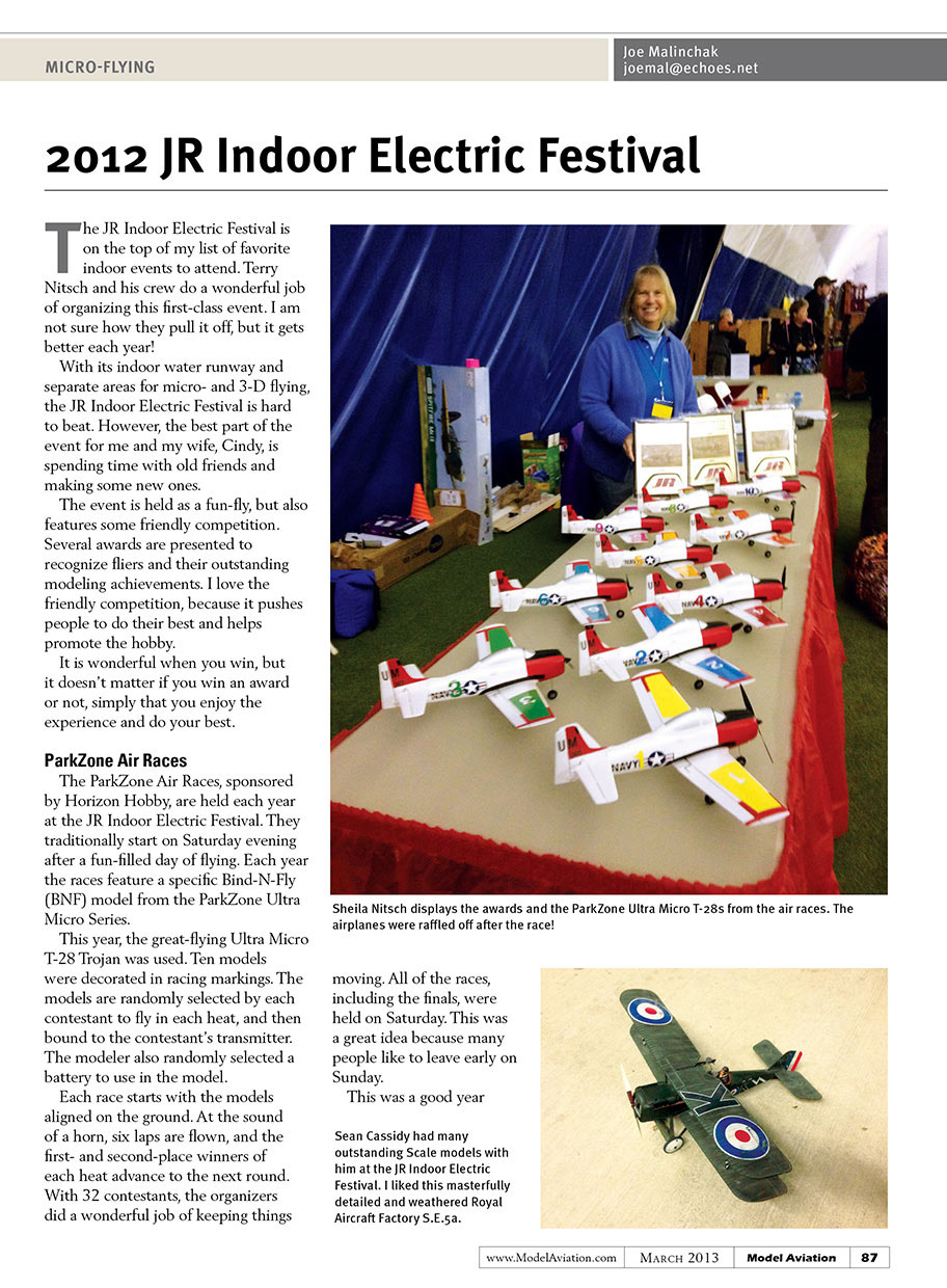 With its indoor water runway and separate areas for micro and 3-D flying, the JR Indoor Electric Festival is hard to beat. However, the best part of the event for me and my wife, Cindy, is spending time with old friends and making some new ones.