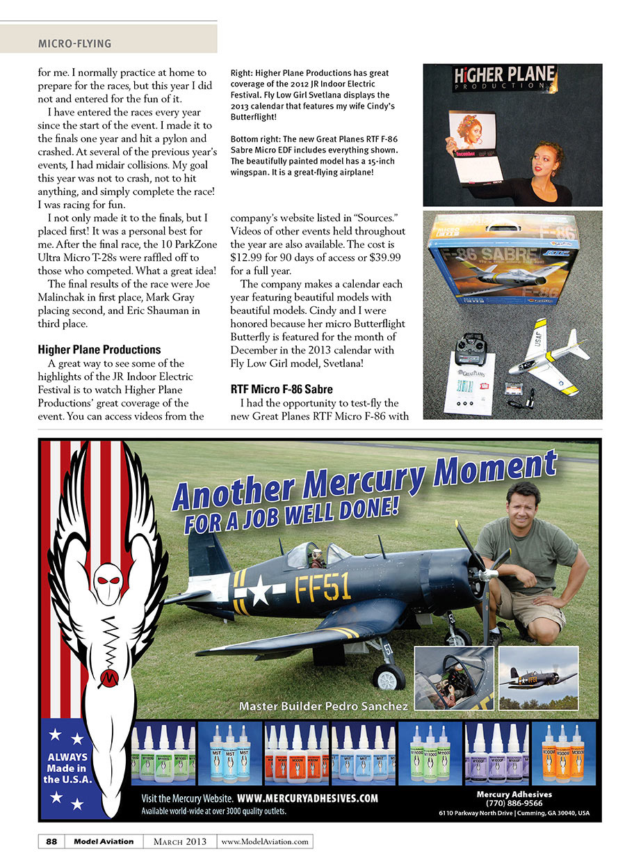 The company makes a calendar each year featuring beautiful models with beautiful models. Cindy and I were honored because her micro Butterflight Butterfly is featured for the month of December in the 2013 calendar with Fly Low Girl model, Svetlana!