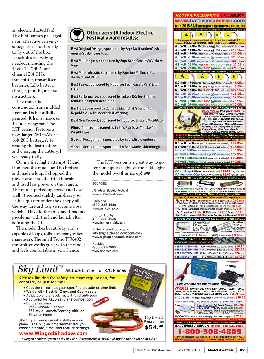 Sheila Nitsch displays the awards and the ParkZone Ultra Micro T-28s from the air races. The airplanes are raffled off after the race! Sean Cassidy had many outstanding Scale models with him at the JR Indoor Electric. I liked this masterfully detailed and weathered Royal Aircraft Factory SE5a. Sean Cassidy had many outstanding Scale models with him at the JR Indoor Electric. I liked this masterfully detailed and weathered Royal Aircraft Factory SE5a. The new Great Planes RTF F-86 Sabre Micro EDF includes everything shown. The beautifully painted model has a 15-inch wingspan. It is a great-flying airplane!
