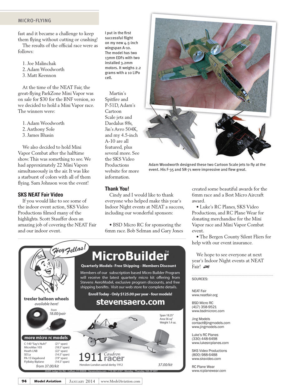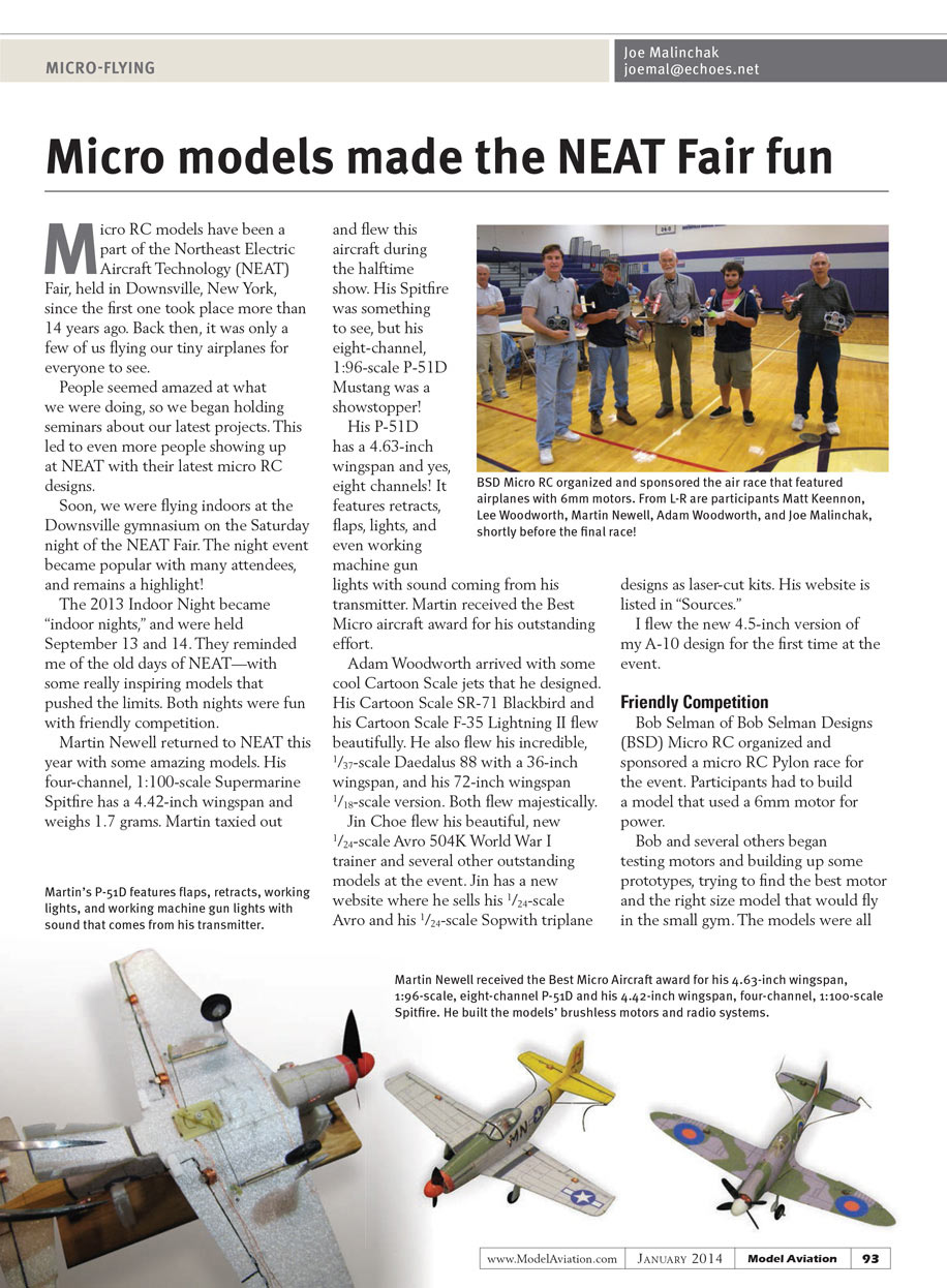 • BSD Micro RC for sponsoring the 6mm race. Bob Selman and Gary Jones created some beautiful awards for the 6mm race and a Best Micro Aircraft award.