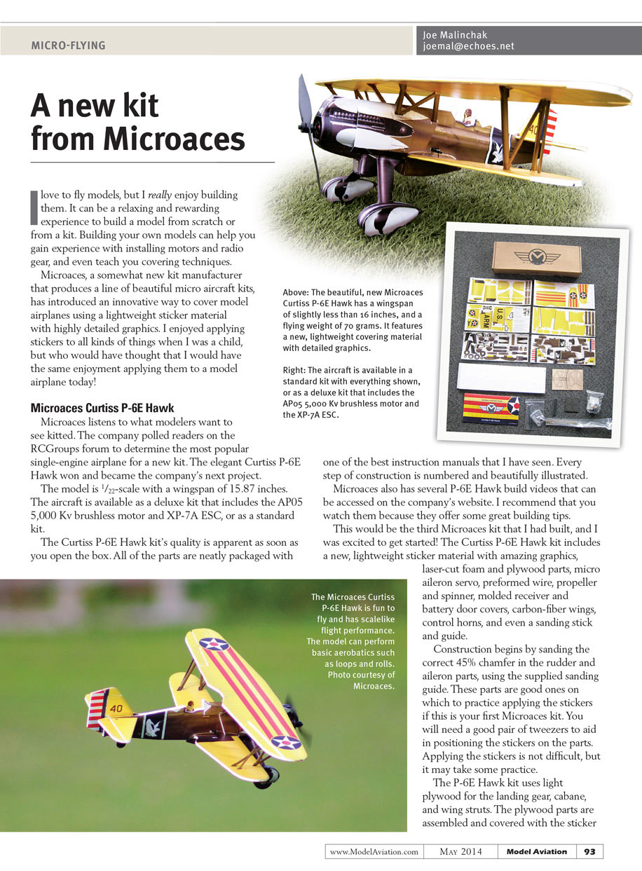 The Microaces Curtiss P-6E Hawk is a fun airplane to build, looks beautiful, and has scalelike flight performance! If you are interested in adding one to your model airplane hangar, see the Microaces website for more information and current pricing.